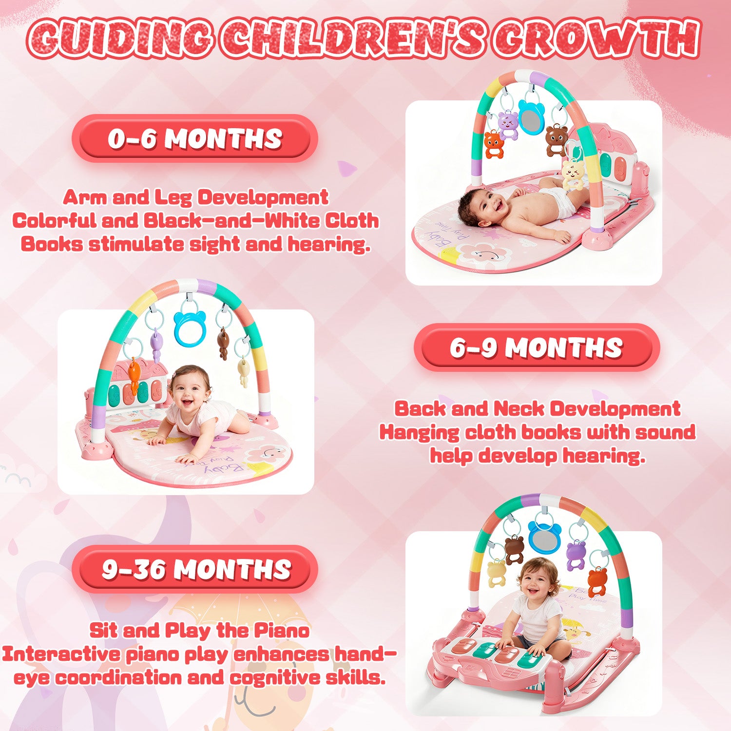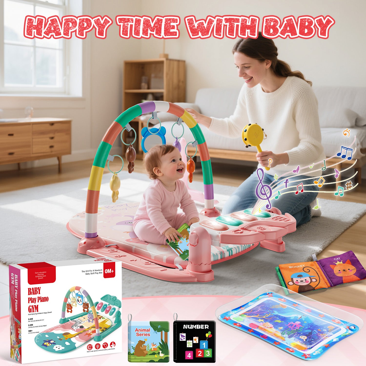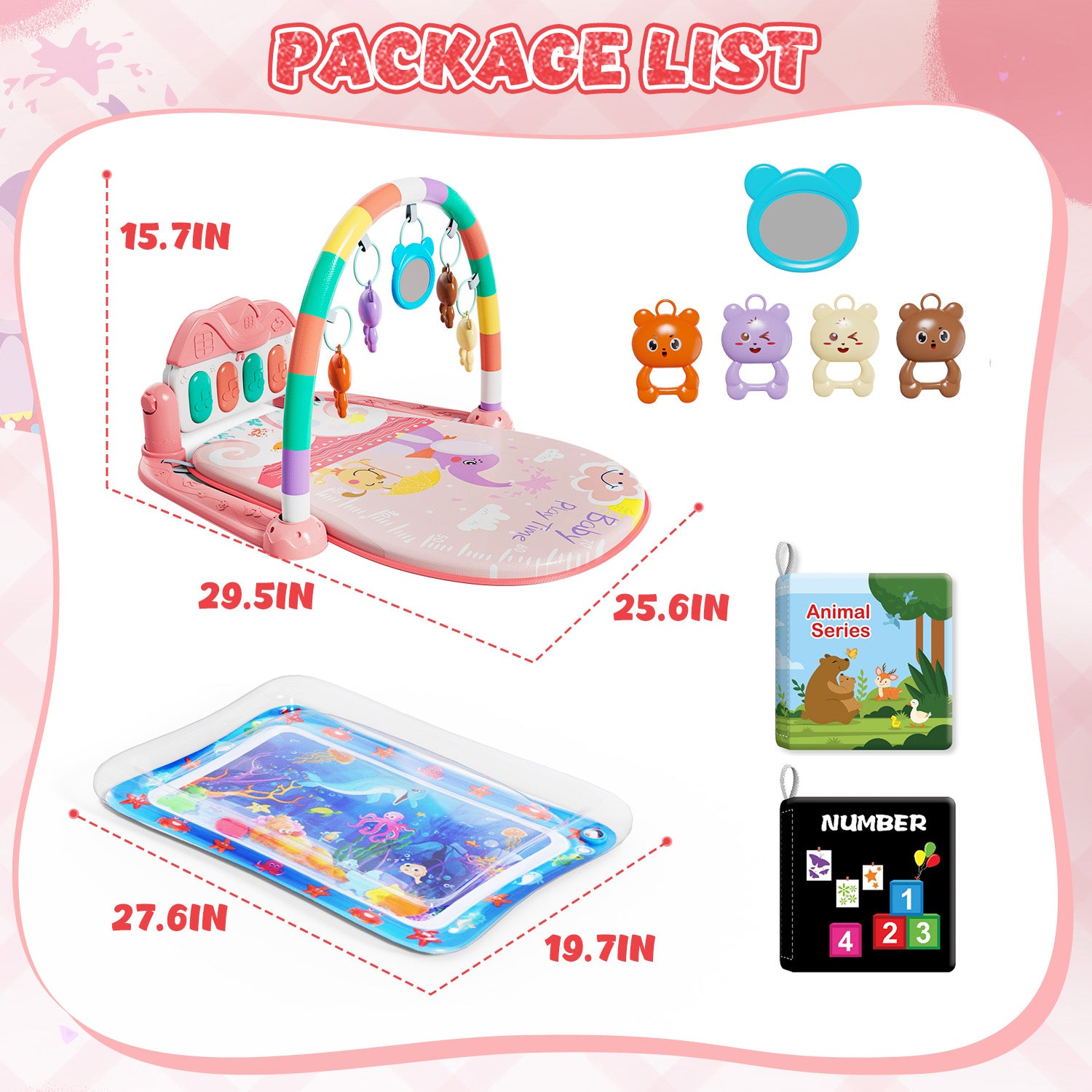 Why Choose Us? Are you still struggling to find the perfect play gym for your 0-24 month-old baby? Baby play gym, designed specifically for children, integrates multiple functions and is perfect for babies aged 0-24 months. It not only ensures comfort but also promotes cognitive development. We've meticulously researched and designed every detail to bring the most comfortable and valuable product to every child. We meticulously plan and design every step to provide each child with the most comfortable and worthwhile products, equipped with 5 hanging accessories (including 4-color bells and mirrors), 2 eco-friendly cloth books (with animal and number themes), a detachable electronic piano (with 7 music modes), a water mat (27.5×20 inches), and a universal cloth mat. These products promote sensory development in all aspects. The baby gym can exercise hearing, vision, touch, and muscle coordination. The PP soft mat is easy to clean and is suitable for babies to play naked. The environmentally friendly materials and exquisite packaging make it a thoughtful choice for newborn gifts, birthday gifts, accompanying babies in their happy growth.