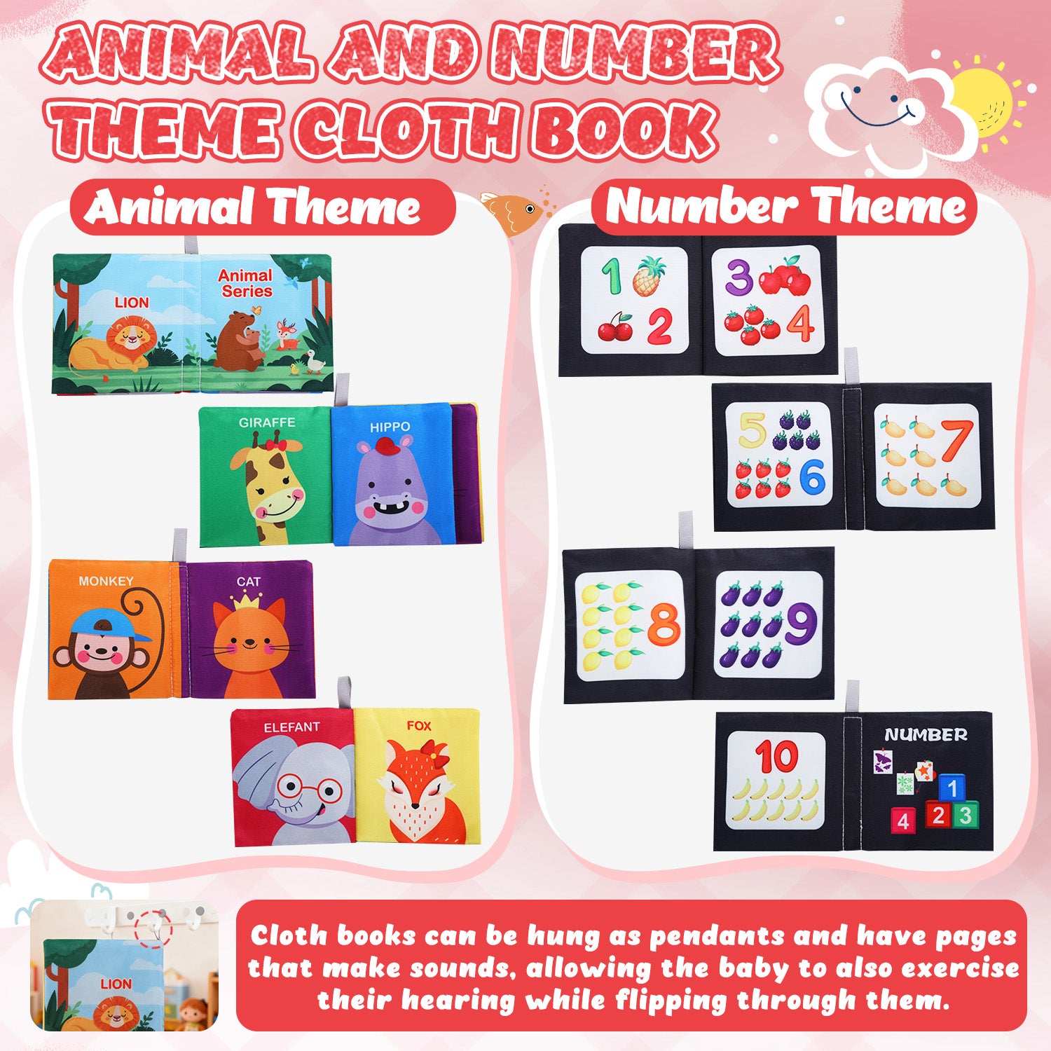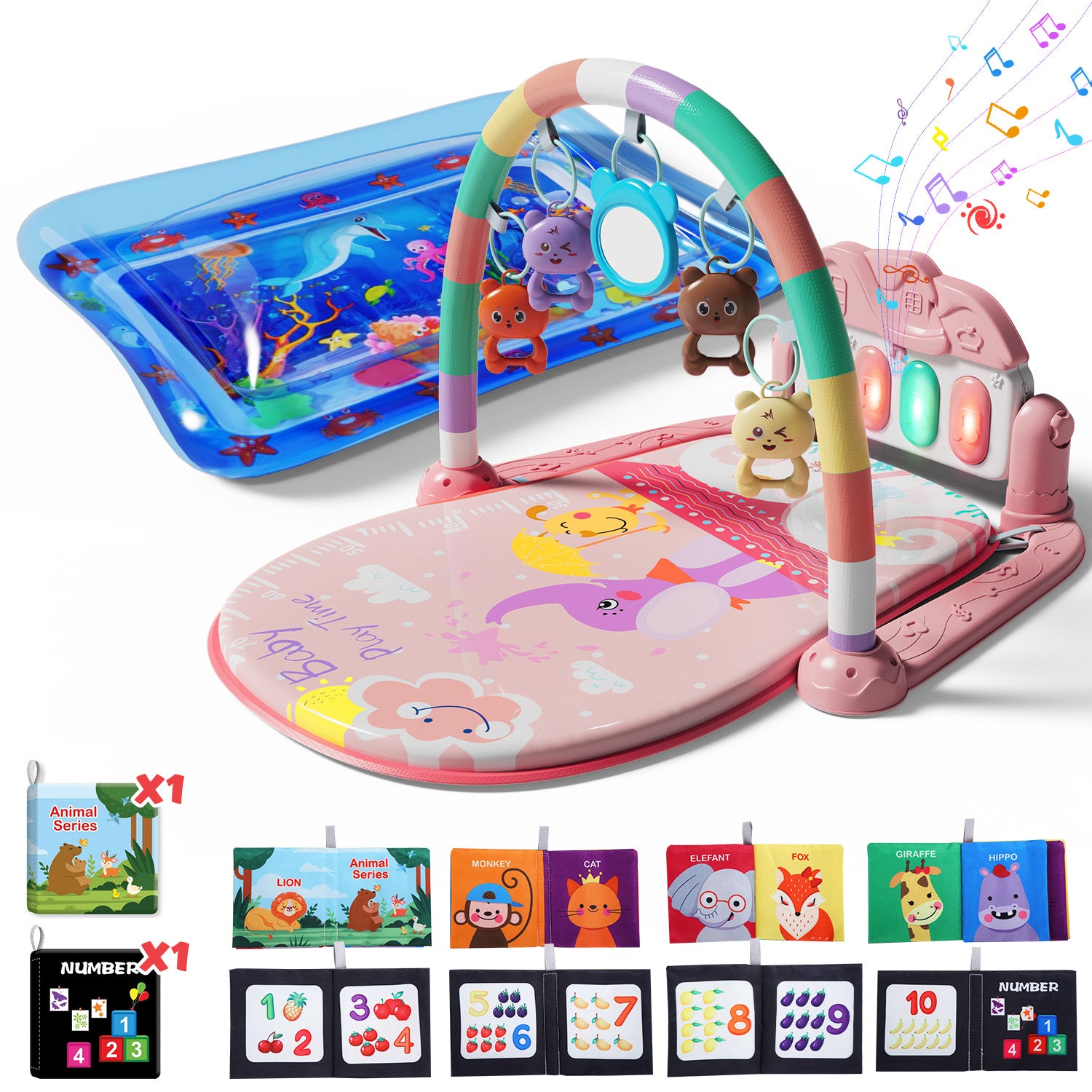 - 【Supporting Baby's Growth】The 2-in-1 baby gym is designed to accompany your baby through the 0-24 months stage and beyond. With various music modes and interactive play features, it helps develop your baby's hearing, vision, touch, and muscle strength in both the hands and legs, while also fostering their imagination and physical coordination skills. In addition, the baby cloth books we provide are made of environmentally friendly, harmless and soft polyester fibers, which are safe and reliable. These baby books are extremely lightweight, washable, non-toxic and tear-resistant. The sturdy and neat stitching can withstand countless washes. There are two interesting themes: animals and numbers. Different interesting themes help your baby begin to understand this wonderful world. You will definitely enjoy reading with your little one. This will stimulate your baby's early tactile and perceptual abilities. Your baby can learn simple words by playing with these cloth books and together contribute to your baby's growth.