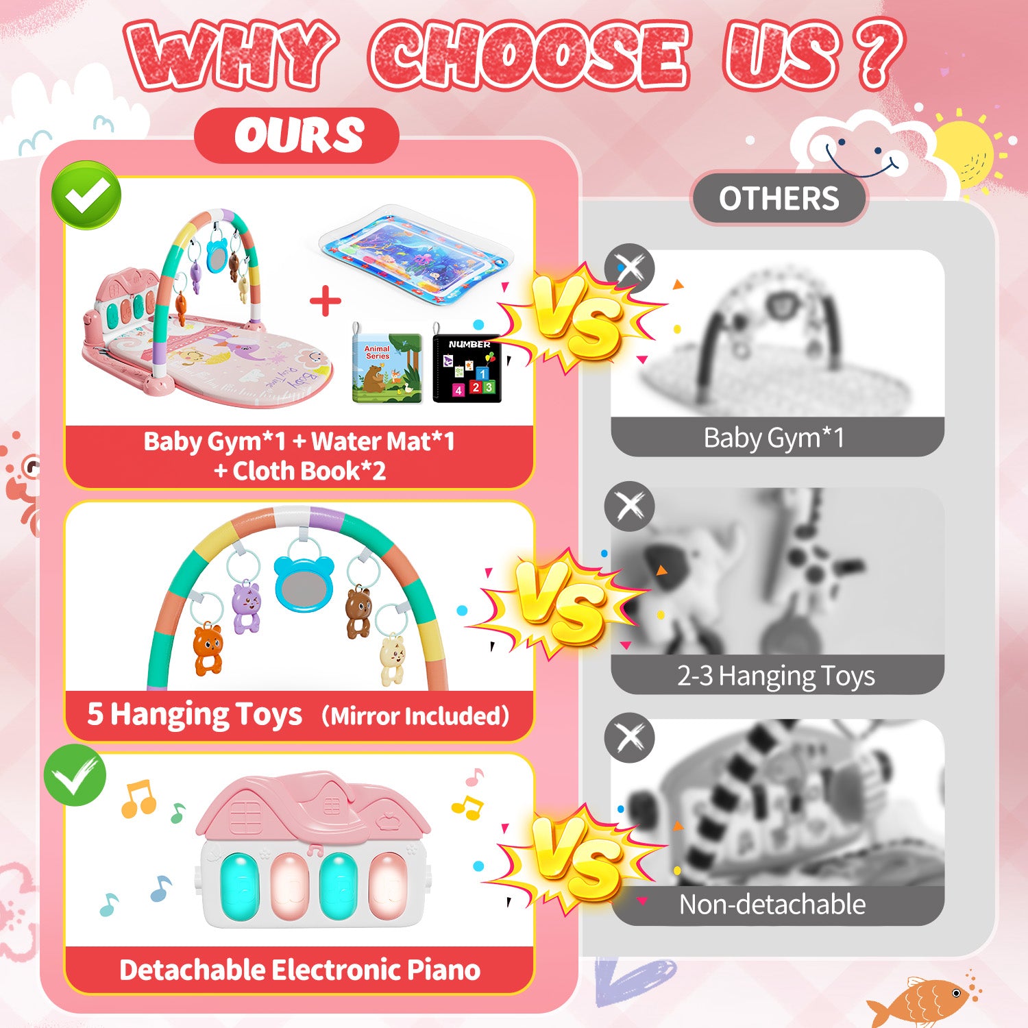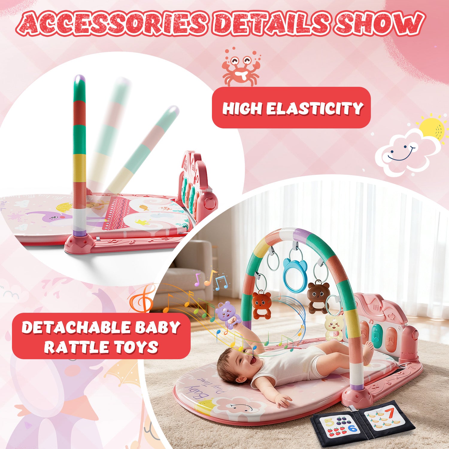 - 【2-in-1 Baby Gym】Our 2-in-1 baby gym is equipped with a variety of accessories, including 5 pendants, 2 cloth books, a detachable electronic keyboard, a water mat, and a cloth mat. The 5 pendants feature 4 colorful rattles and a mirror to improve a baby's reflexes. The 2 soft cloth books are perfect for newborns, while the colorful hanging toys can be introduced around 3–4 months when babies begin to recognize colors. These books encourage sensory exploration, visual recognition, categorization, language, and imagination. The electronic keyboard inspires musical interest, while the water mat and cloth mat provide a safe and comfortable play space. Together, these diverse accessories create a highly interactive activity center that supports your baby's growth.