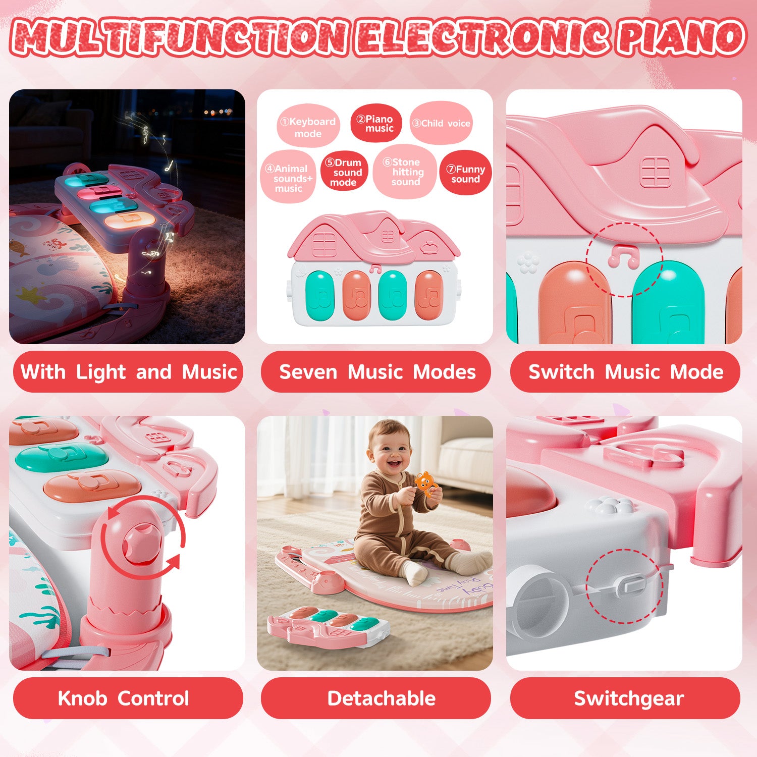 - 【Multifunctional Electronic Piano】Our 2-in-1 baby gym is equipped with a detachable electronic piano, which can be used as a foot piano or removed for separate play. Additionally, the piano features 7 music modes: piano key sounds, piano melodies, drum beats, various sound effects, and more. It helps cultivate your baby's musical talent, enhances their ability to recognize sounds, and encourages creativity.