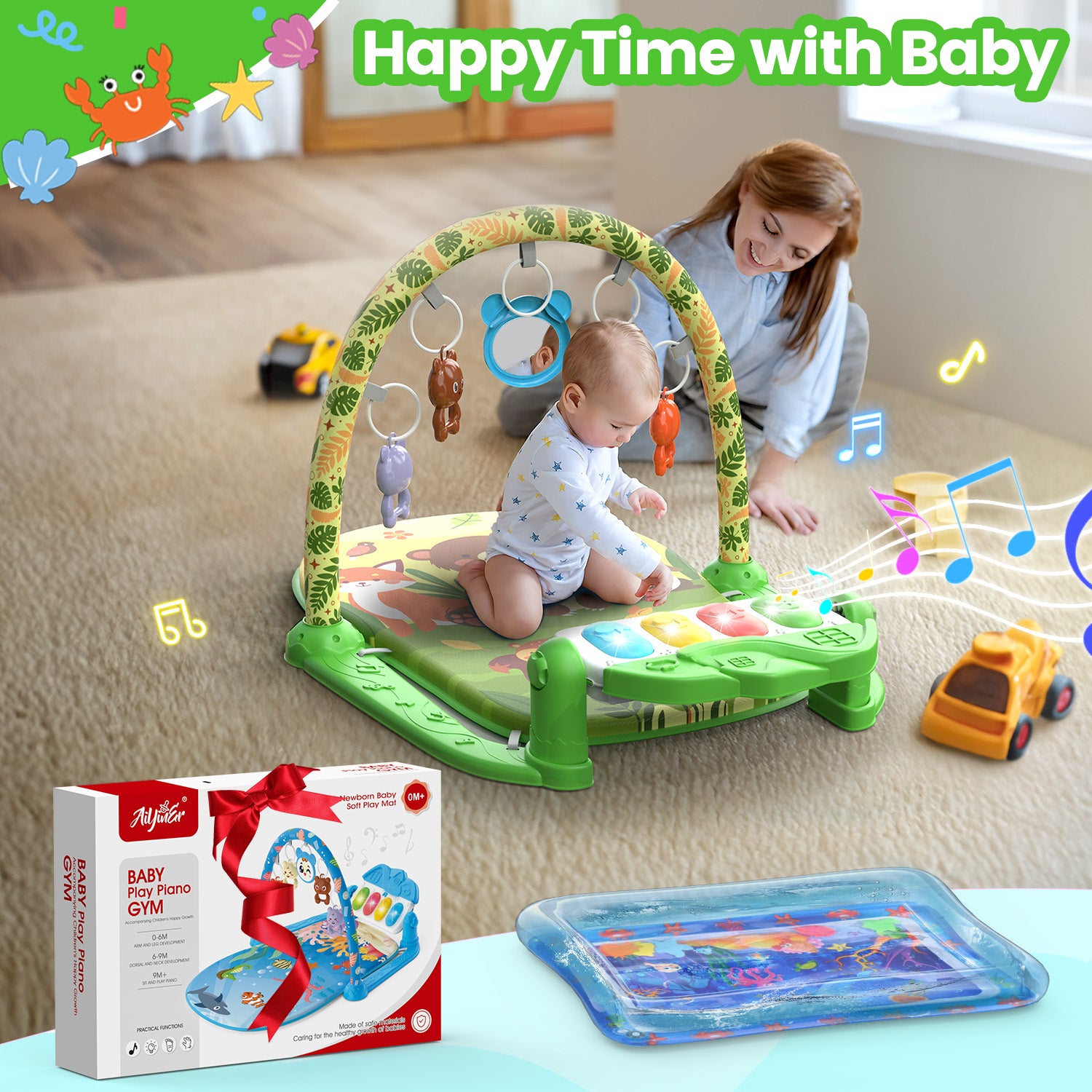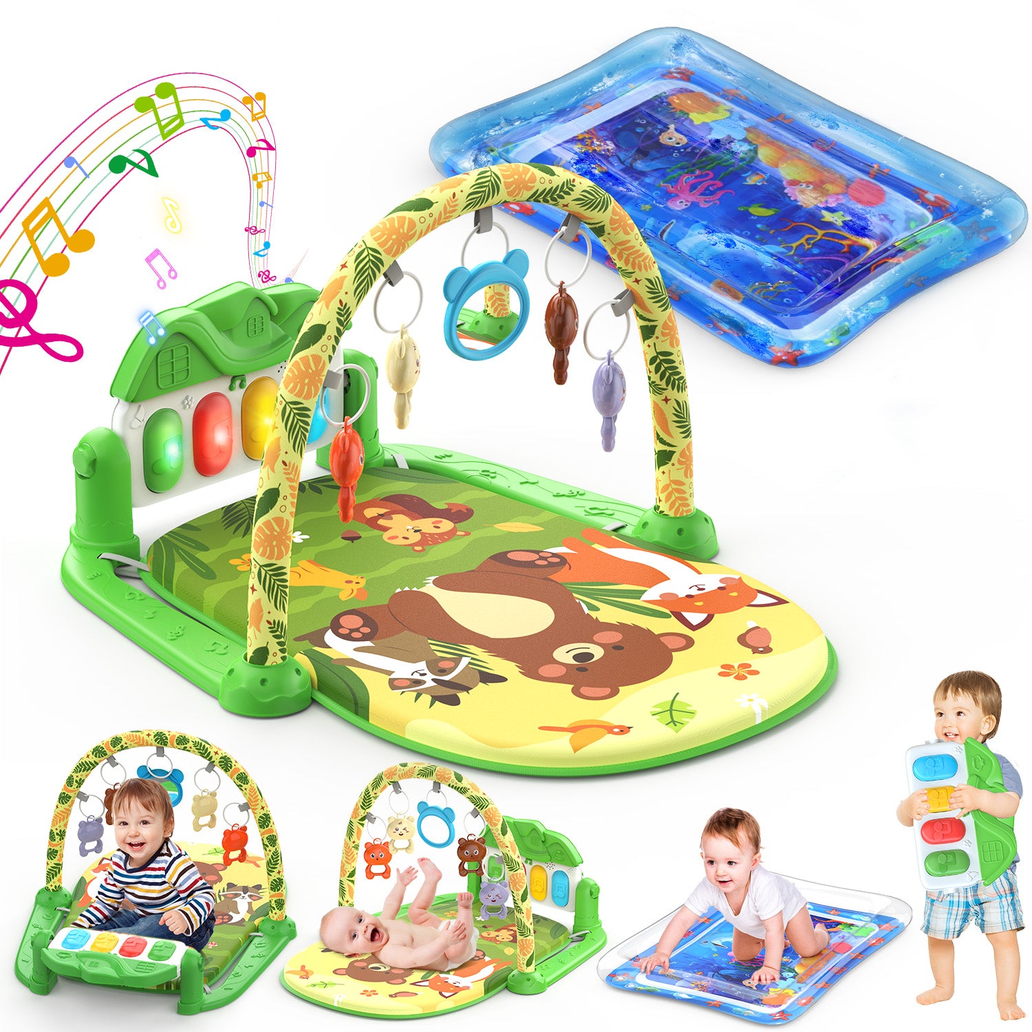 2 in 1 Baby Gym Playmat, Tummy Time Water Mat with 5 Infant Sensory Toys & Play Piano, Boys and Girls Newborn Gift 0-12 Month (Green)