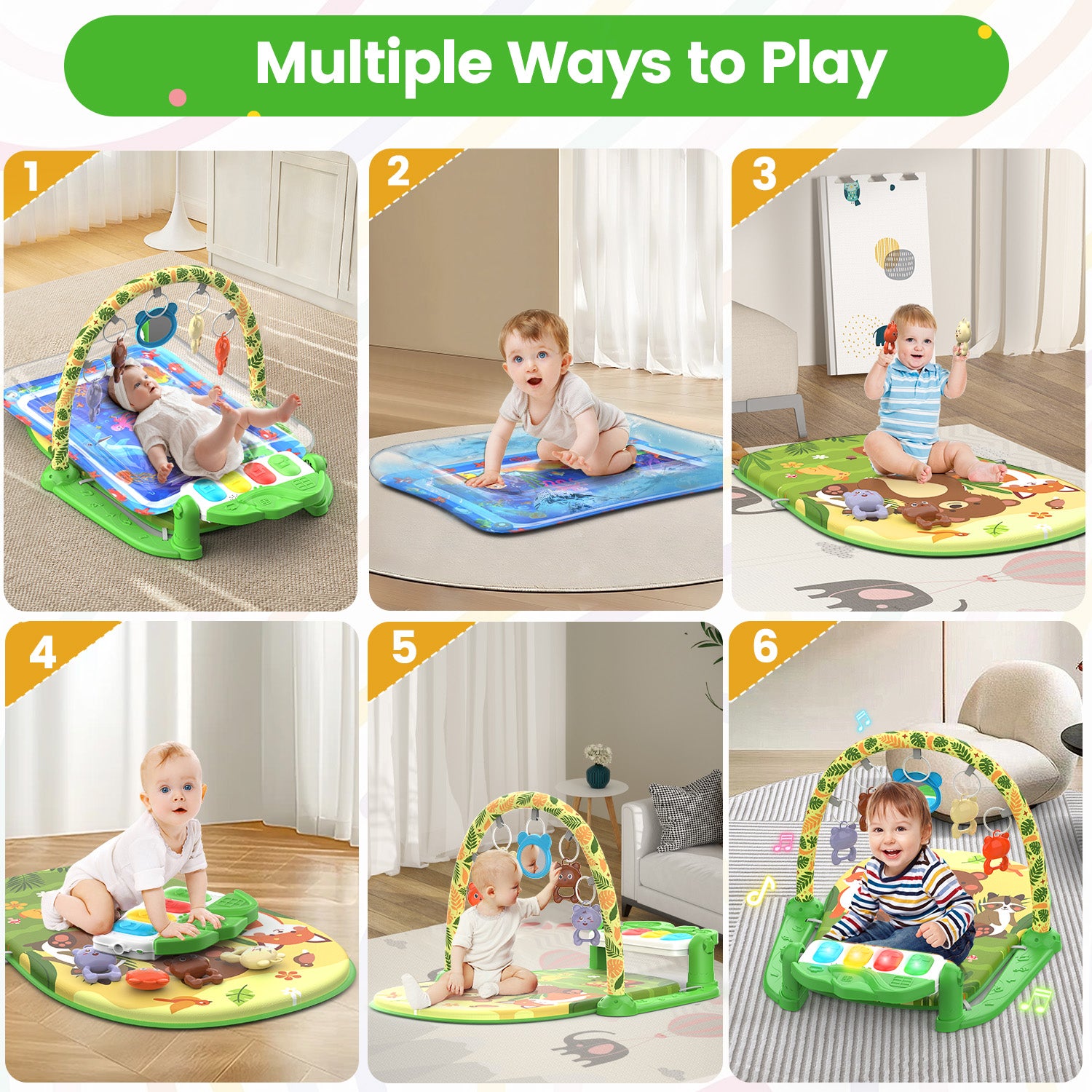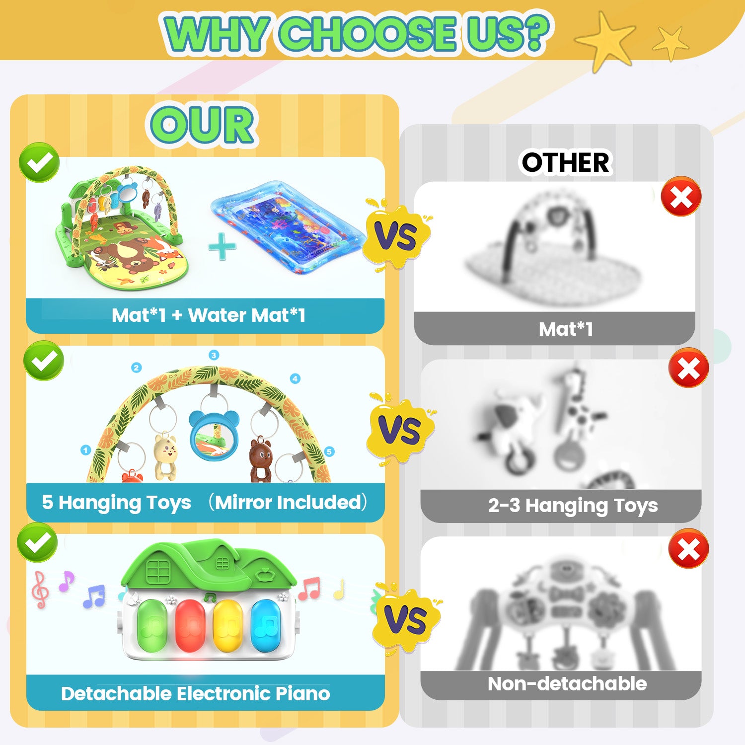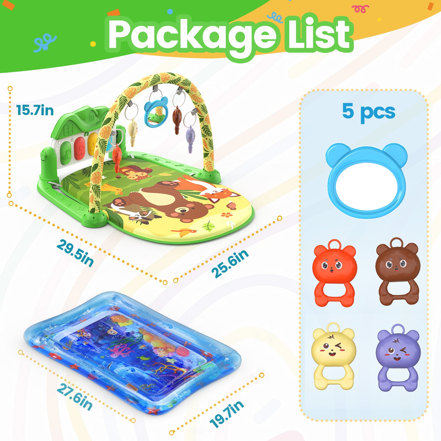 - 2-in-1 Baby Gym: Our 2-in-1 baby playmat is equipped with a variety of accessories, including 5 pendants, a detachable electronic keyboard, a water mat, and a cloth mat. The 5 pendants feature 4 different colored rattles and a mirror, which help improve a baby's reflexes. The electronic keyboard can cultivate your baby's musical talent, while the water mat and cloth mat provide a comfortable experience for your baby. These diverse accessories and features create a highly interactive activity center for babies.