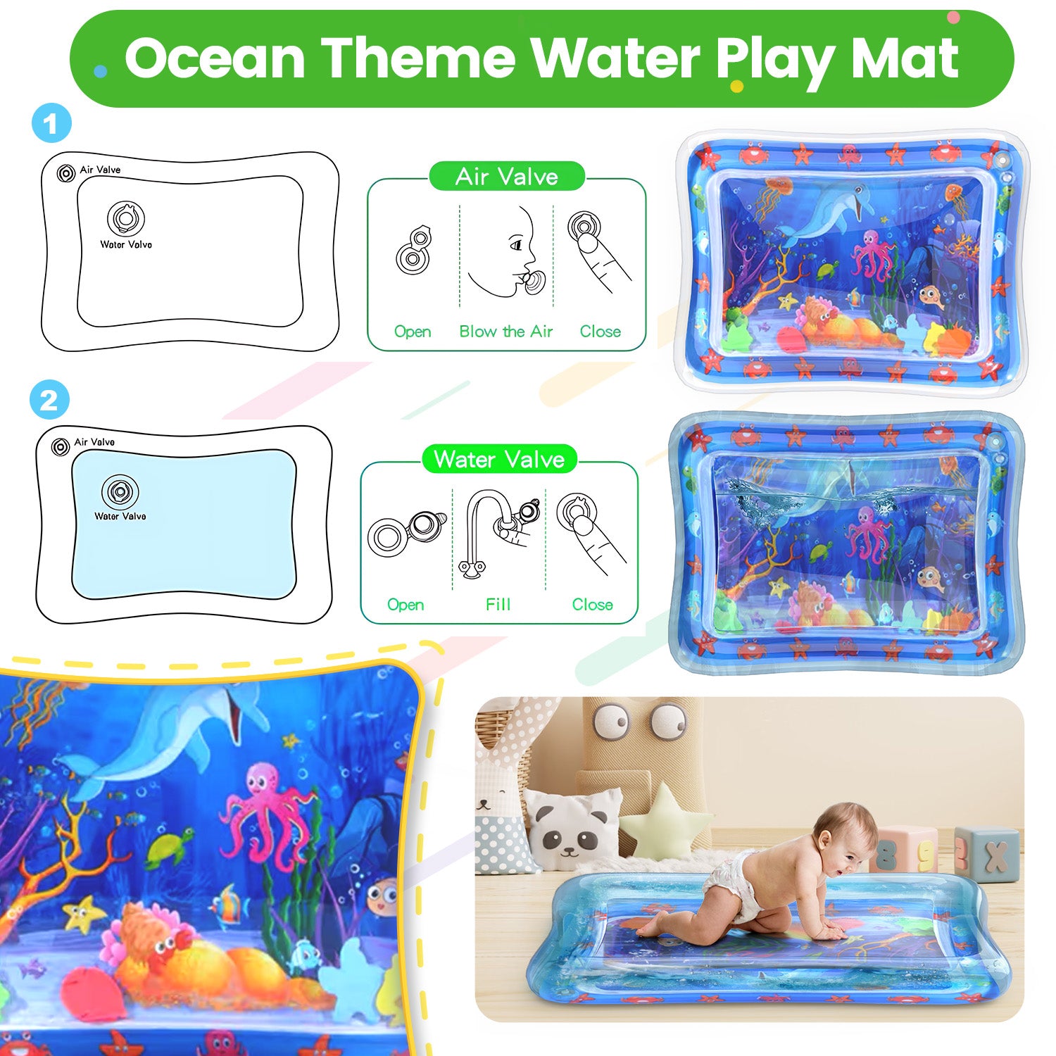 - Ocean-Themed Water Mat: Our 2-in-1 baby gym includes a 27.5 x 20 inch ocean-themed water mat that not only stimulates your baby's interest but also aids in sensory development for infants aged 0 to 12 months. In addition, the water mat is easy to use?simply inflate it or fill it with water. Once emptied, it can be easily folded and stored in a bag, allowing your baby to enjoy tummy time play anywhere and anytime.