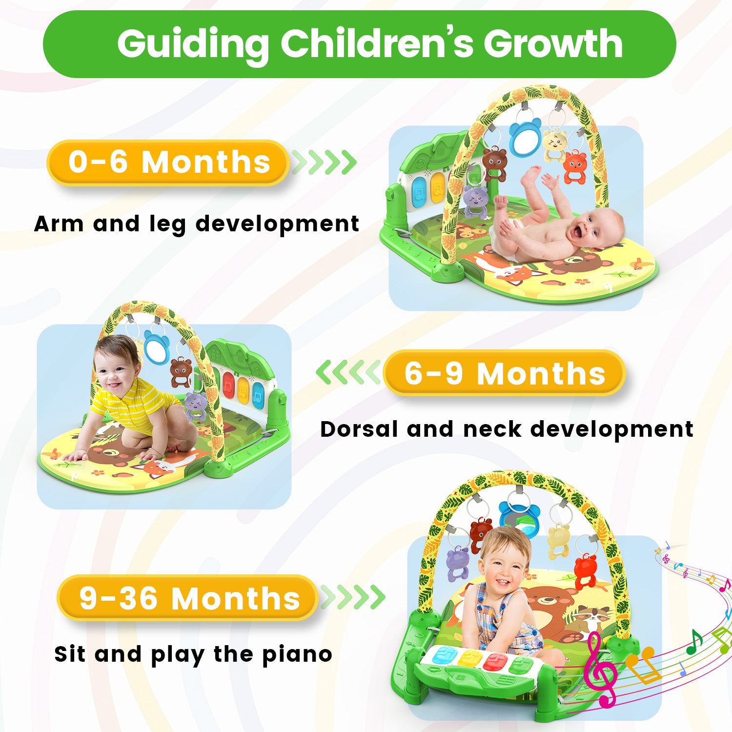 - Supporting Baby's Growth: The 2-in-1 baby gym is designed to accompany your baby through the 0-12 months stage and beyond. With various music modes and interactive play features, it helps develop your baby's hearing, vision, touch, and muscle strength in both the hands and legs, while also fostering their imagination and physical coordination skills.