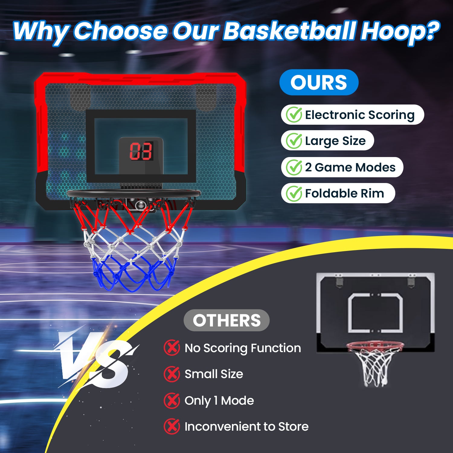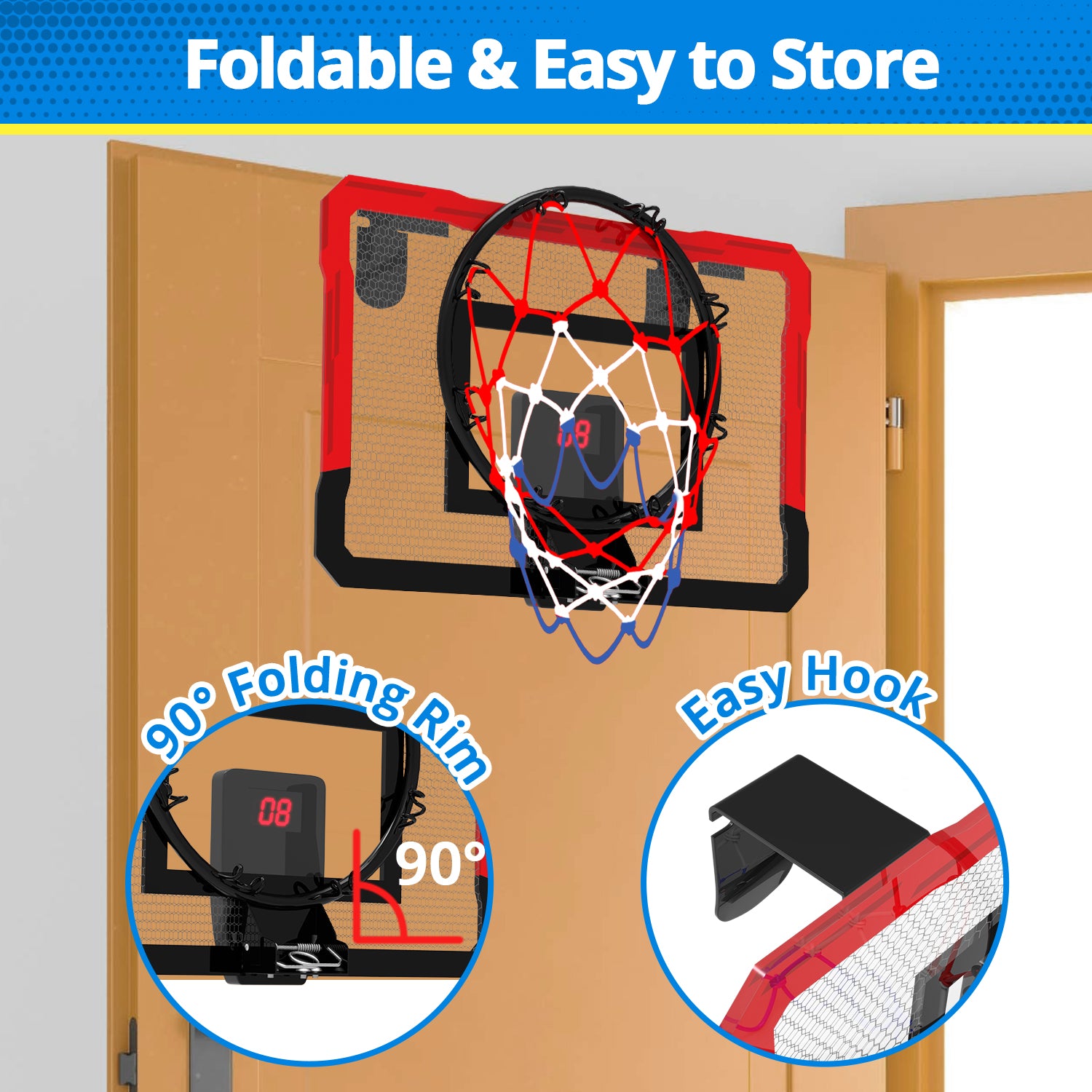 - 【EASY TO INSTALL & FOLDABLE DESIGN】Our mini basketball hoop for door with hook design, no drilling required. Easy to hang it over the door frame at any bedroom or office, suit for most size door. Comes with all necessary tools and clear manuals so that you could easily install a basketball hoop indoor by yourself! The steel rim has a foldable design, saves space for storage, and not affect opening and closing the door!