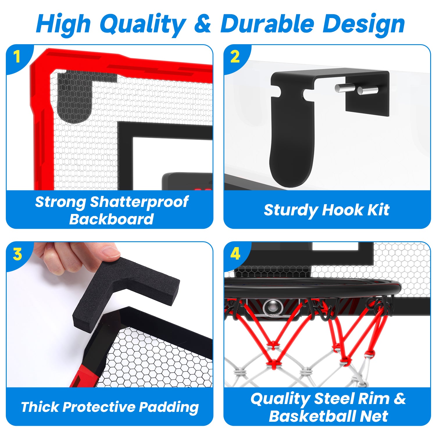 - 【HIGH QUALITY and DURABLE】Wall mount basketball hoop is built to last, with a sturdy steel rim, shatterproof backboard, and a durable ball net ensuring long-lasting durability. The thick shock-proof sponge strips on the backboard not only protect your door from scratches but also effectively reduce noise. Additionally, this set includes 4 rubber basketballs making it perfect for indoor and outdoor sports.