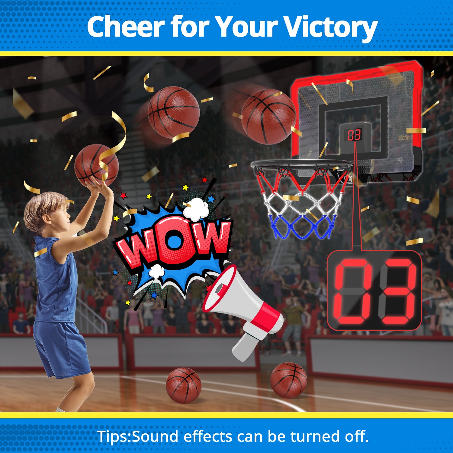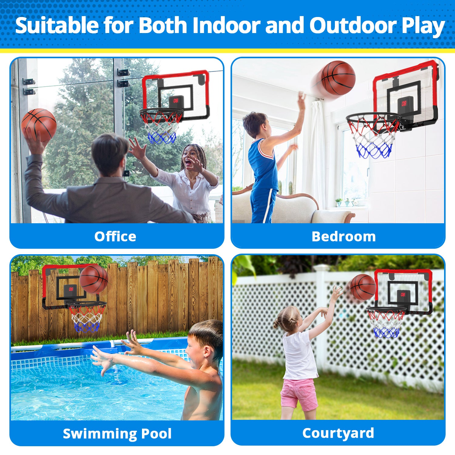 - 【ELECTRONIC SCPRING BASKETBALL BOARD】This basketball hoop for door comes with electronic scoring and cheering sounds. Points are counted, and play is celebrated with cheers. It is suitable for both kids' enjoyment and adult relaxation, making it an ideal game for a refreshing break during daily work.