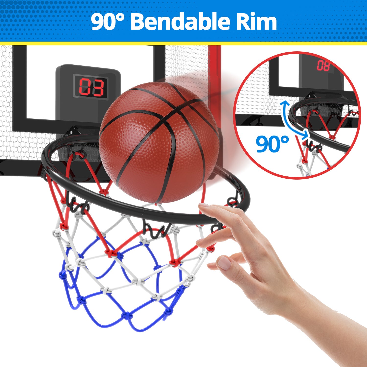 - 【2 GAME MODES for FUN】Our indoor basketball hoop offers 2 game modes for kids to choose from: ① 60-second countdown ② 5-second countdown. These modes add more fun and help develop kids' interest in basketball. Progress through the levels and compete with your family and friends. Designed with break-away rim with spring load, the maximum angle is up to 90°, which stimulates the real feeling of playing basketball. High quality steel rim make it strong enough to stand up to the most powerful dunks without bending or breaking.