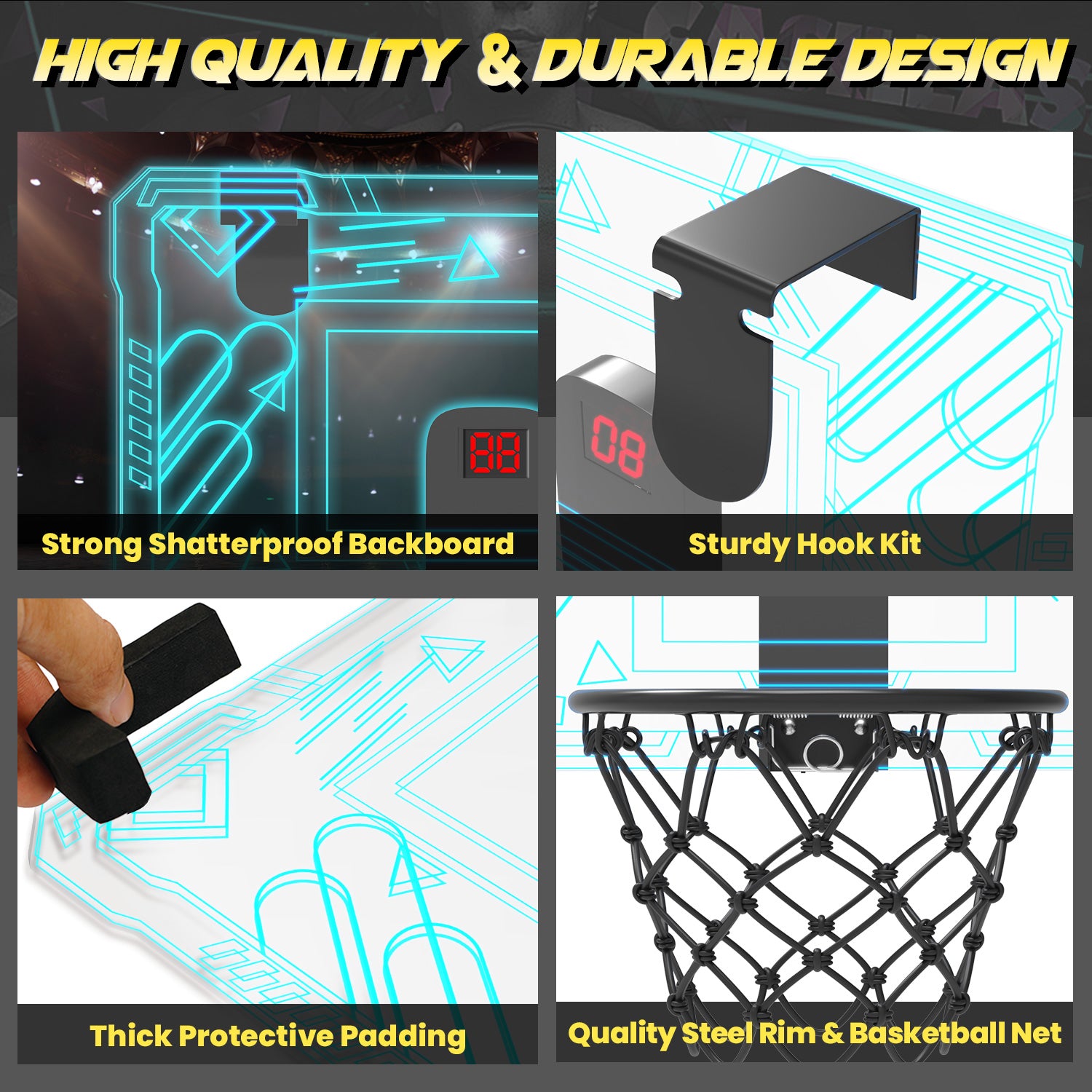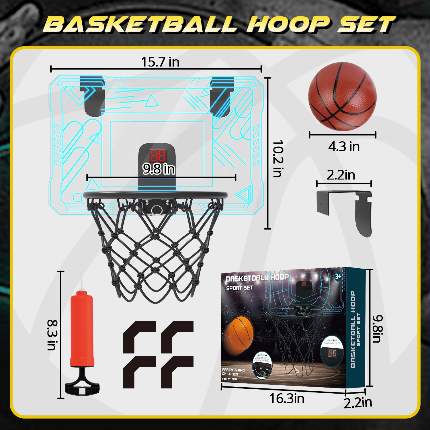 - 【GREAT FOR DUNKING】When our LED indoor basketball hoop game mode is activated, the timer will automatically count down for 60 seconds, and you will score if you make a shot. This mode can support competitions between friends and family, adding even more fun. Designed with break-away rim with spring load, the maximum angle is up to 90°, which stimulates the real feeling of playing basketball. High quality steel rim make it strong enough to stand up to the most powerful dunks without bending or breaking.