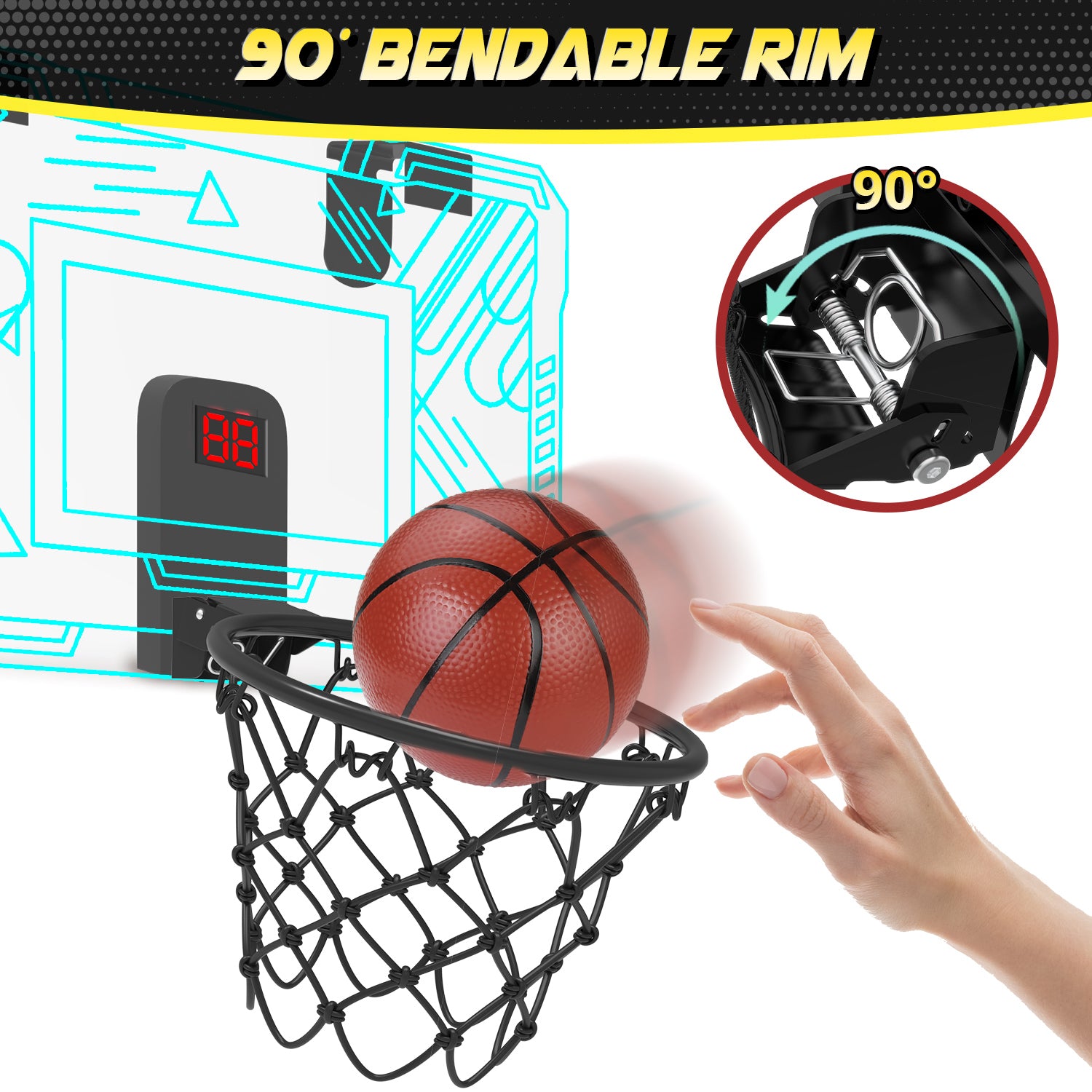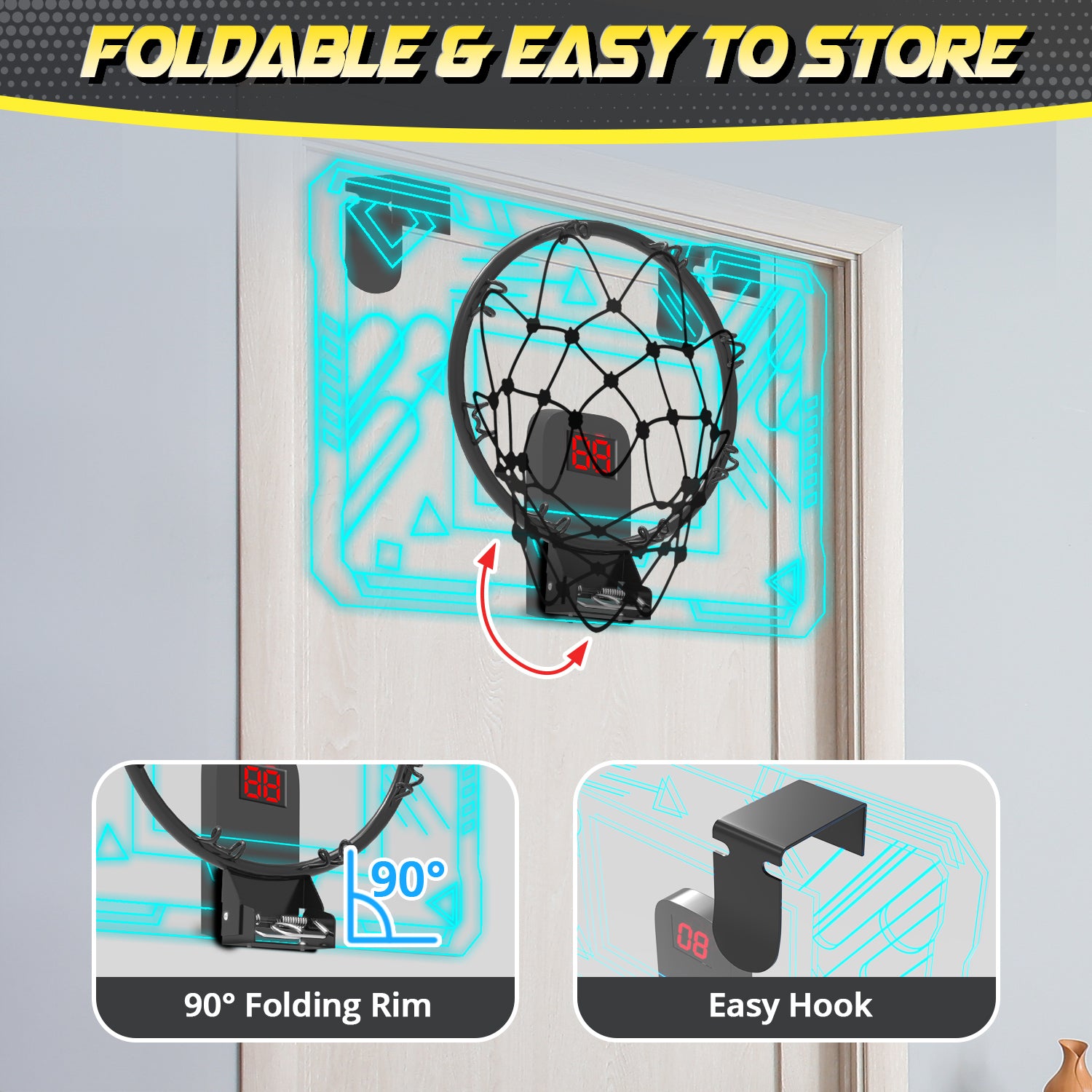 - 【EASY TO INSTALL & FOLDABLE DESIGN】Our mini basketball hoop for door with hook design, no drilling required. Easy to hang it over the door frame at any bedroom or office, suit for most size door. Comes with all necessary tools and clear manuals so that you could easily install a basketball hoop indoor by yourself! The steel rim has a foldable design, saves space for storage, and not affect opening and closing the door!