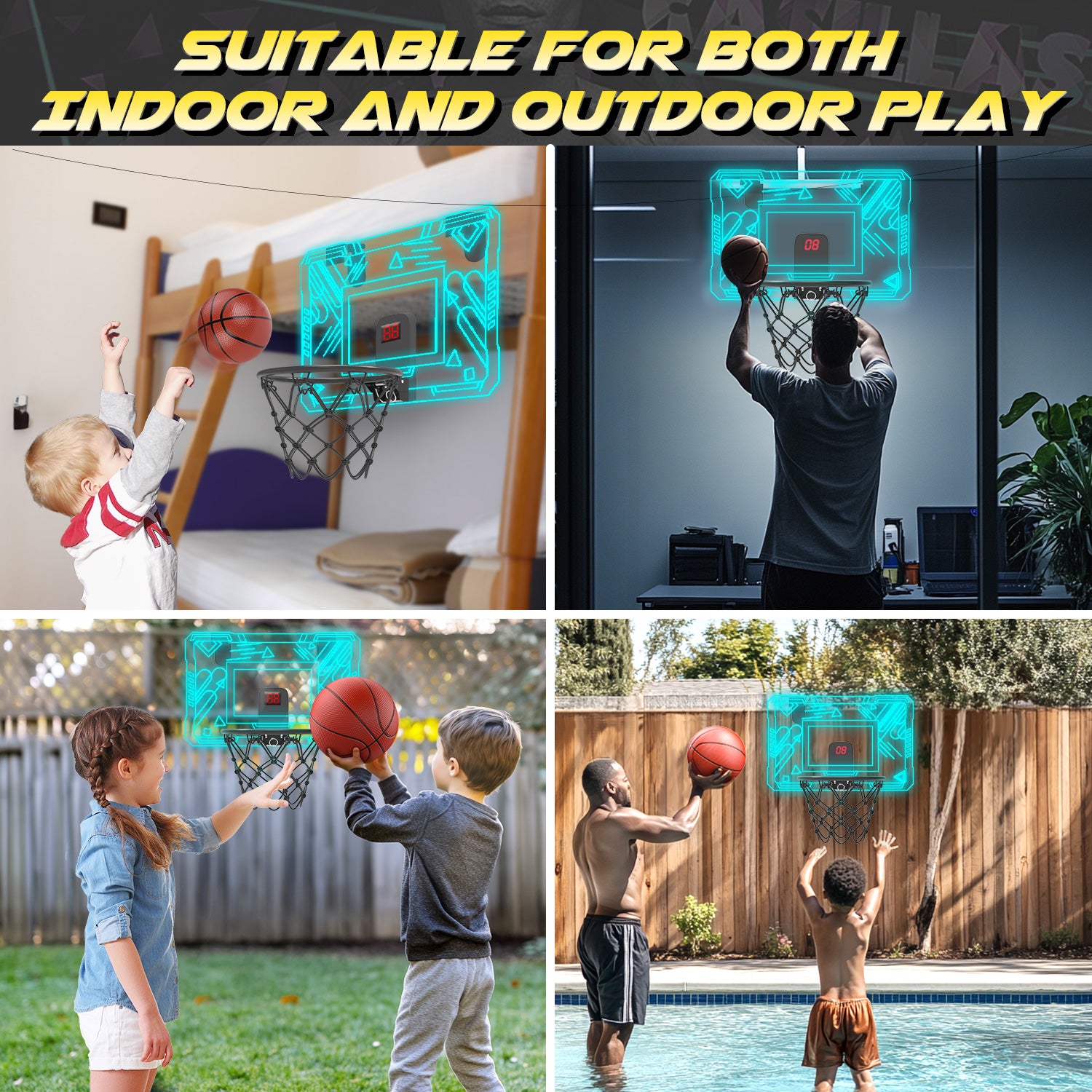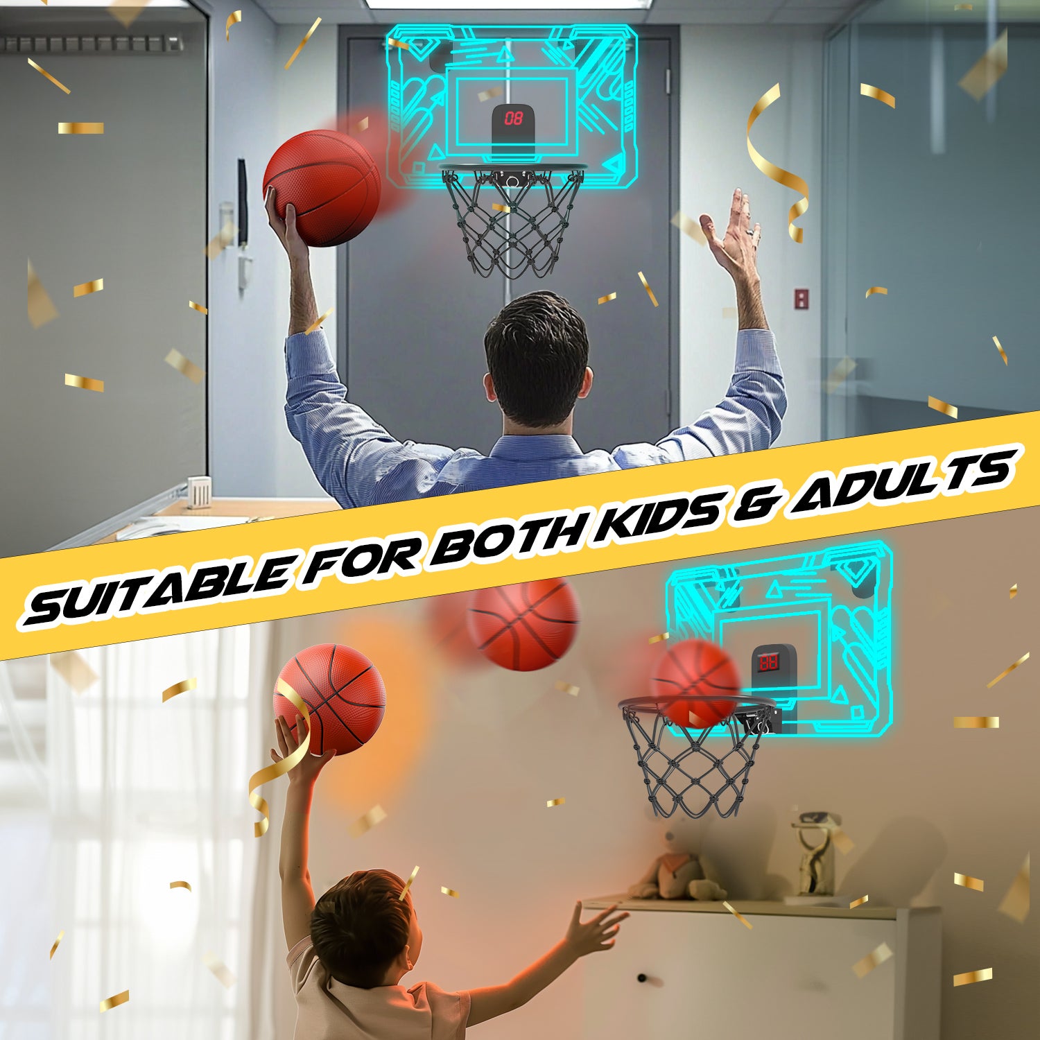 - 【COOL LIGHTS & ELECTRONIC SCORING】This basketball hoop for door comes with electronic scoring and adjustable cheering sounds. Points are counted, and play is celebrated with cheers. The glow-in-the-dark basketball, which comes in blue, green, and purple colors, makes your dunks more visually impactful, bringing competitive game excitement into your home! It is suitable for both kids' enjoyment and adult relaxation, making it an ideal game for a refreshing break during daily work.