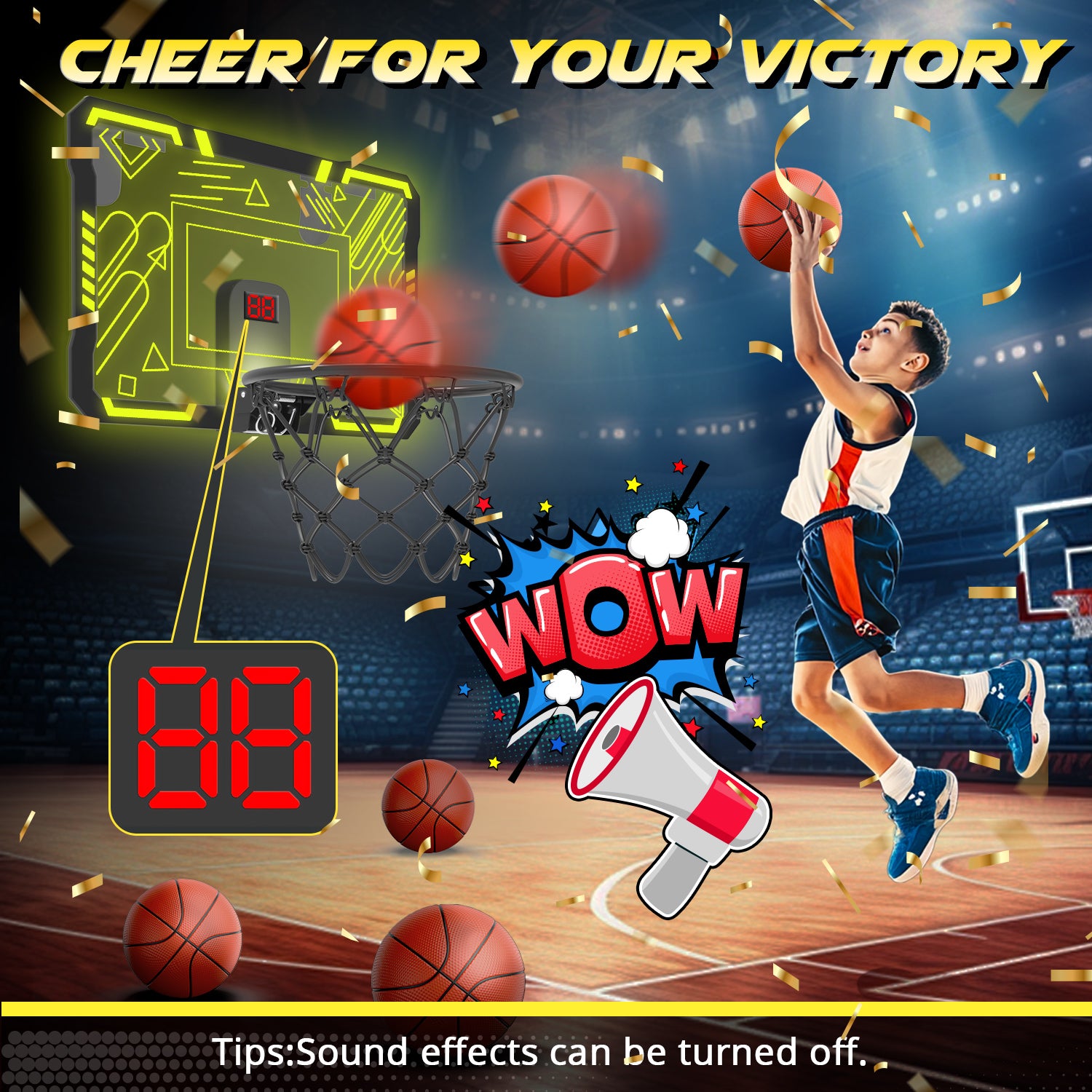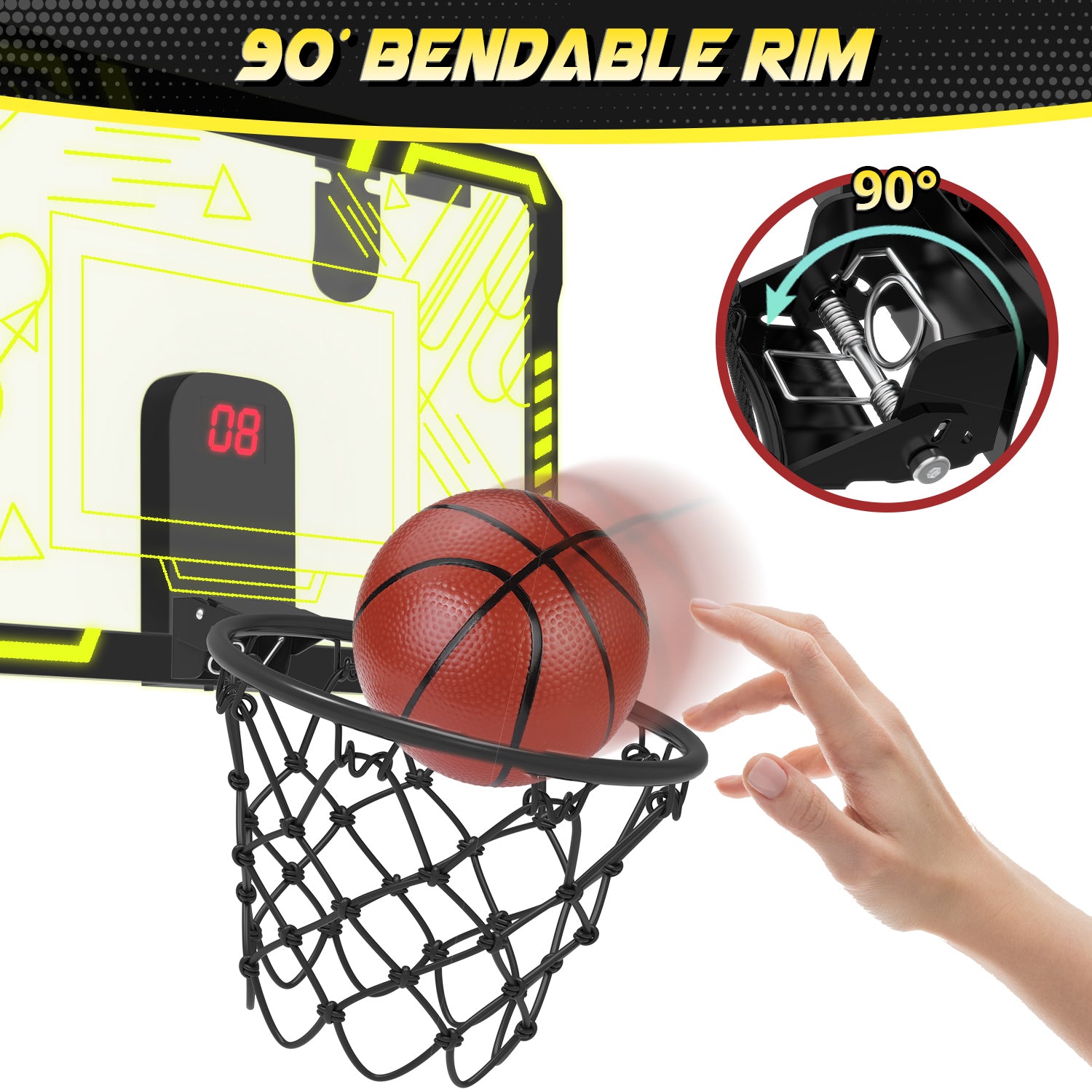 - 【COOL LIGHTS & ELECTRONIC SCORING】This basketball hoop for door comes with electronic scoring and adjustable cheering sounds. Points are counted, and play is celebrated with cheers. The glow-in-the-dark basketball makes your dunks more visually impactful, bringing competitive game excitement into your home! It is suitable for both kids' enjoyment and adult relaxation, making it an ideal game for a refreshing break during daily work.