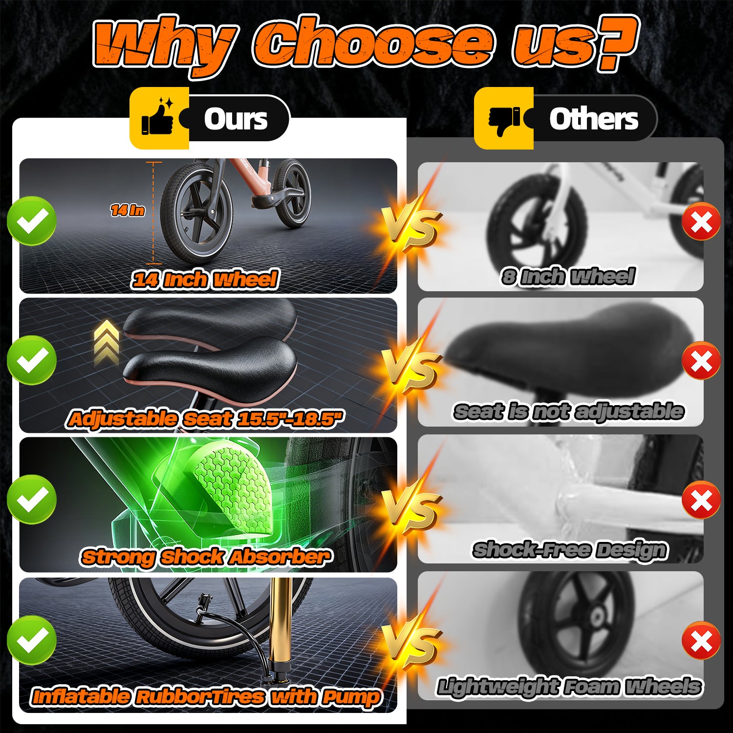 - 【Air Rubber Tires and Dual-Bearing Wheels】Equipped with 14-inch air rubber tires and dual-bearing wheels, provide a smooth, low-resistance ride for easy gliding, reducing strain on your child’s knees.