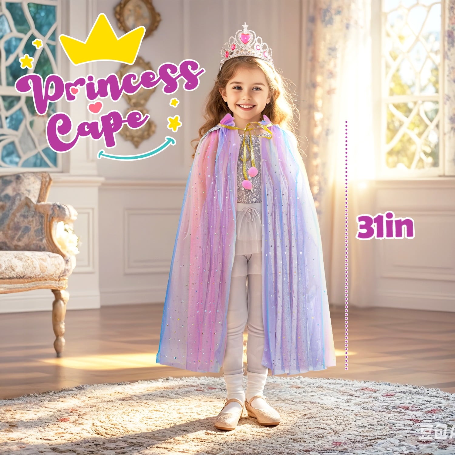 JoyStone Adorable princess dress up cape set Princess Play Gift Set for Little Girls To be a princess, girls always dreams to be a princess. This is a perfect gift set included exactly what every girl needs to complete her princess dress up costume. Beautiful princess cape, adorable accessories jewelries. She will love to feel like a real princess. Enjoying endless hours of fun and the princess cape set will also help develop imagination, interpersonal skills and creative play. Material: Polyester