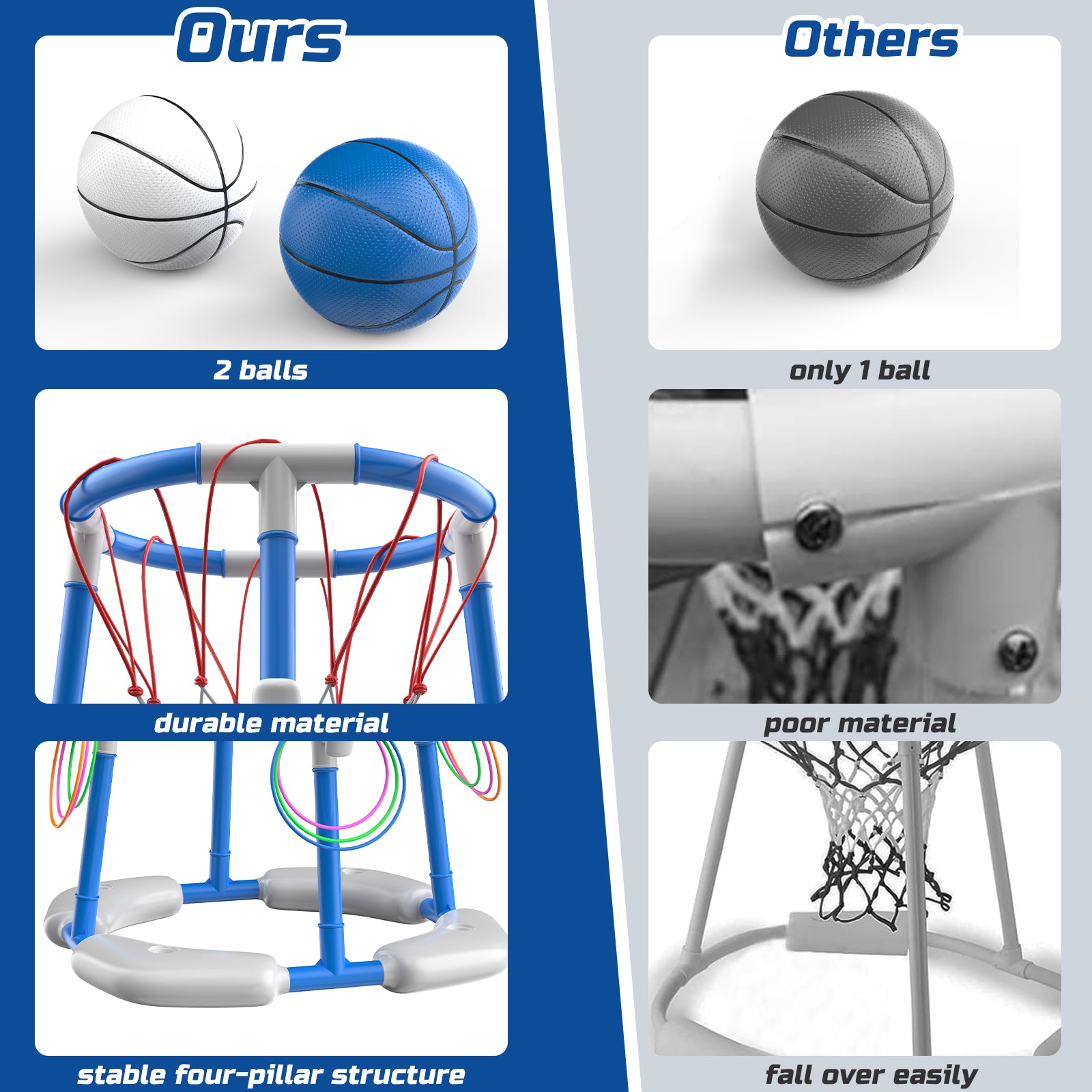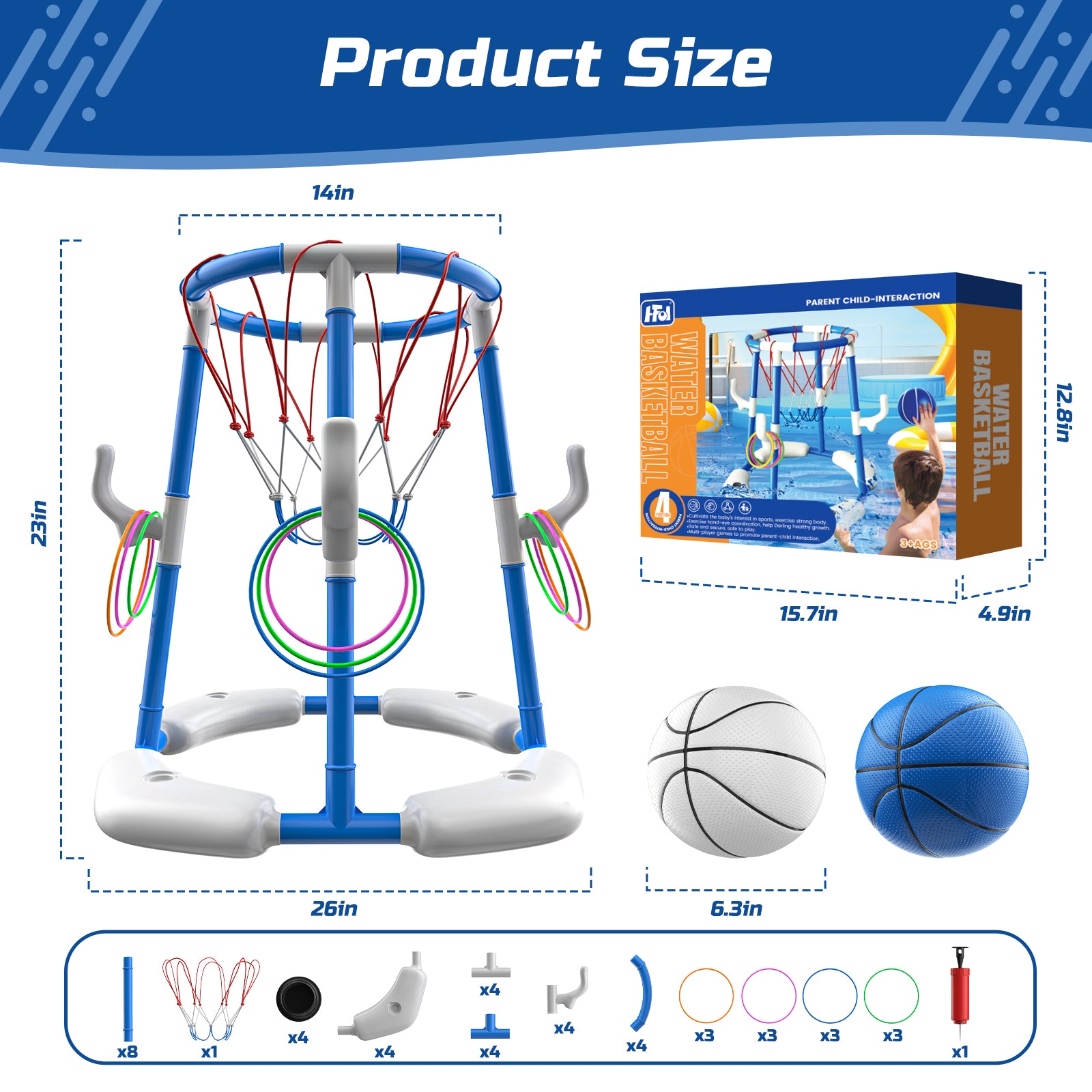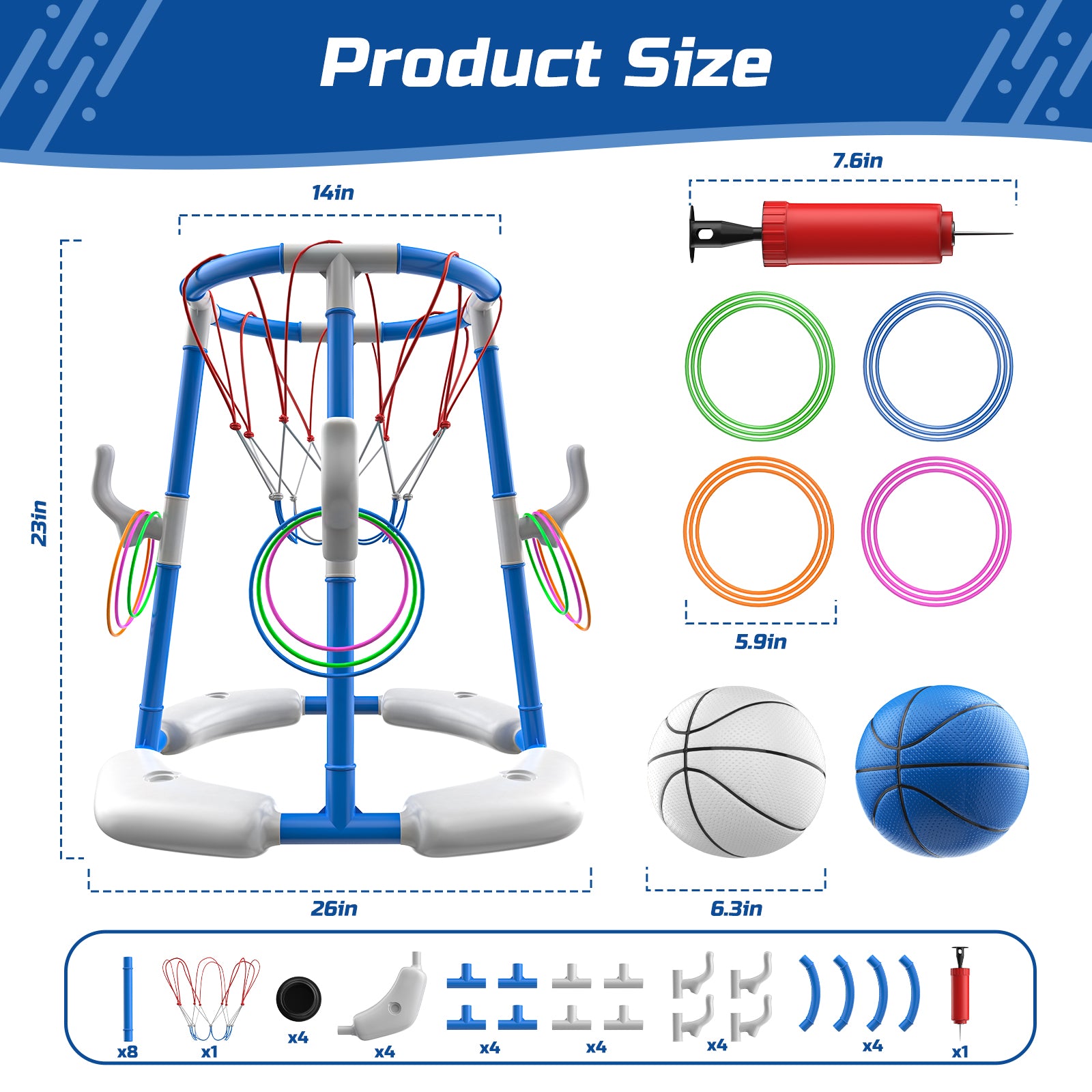 JoyStone 2-IN-1 Pool Basketball Hoop Set Offering two swimming games in one - cross ring toss and basketball shooting. It provides endless entertainment for both children and families, and while the pool is a suitable setting, its design allows it also to be played in many other settings, both indoors and outdoors. Super Value Pool Toys Set includes a basketball hoop, 2 balls, 12 rings(available in 4 colors), and a pump. enjoy two fun pool games this summer.