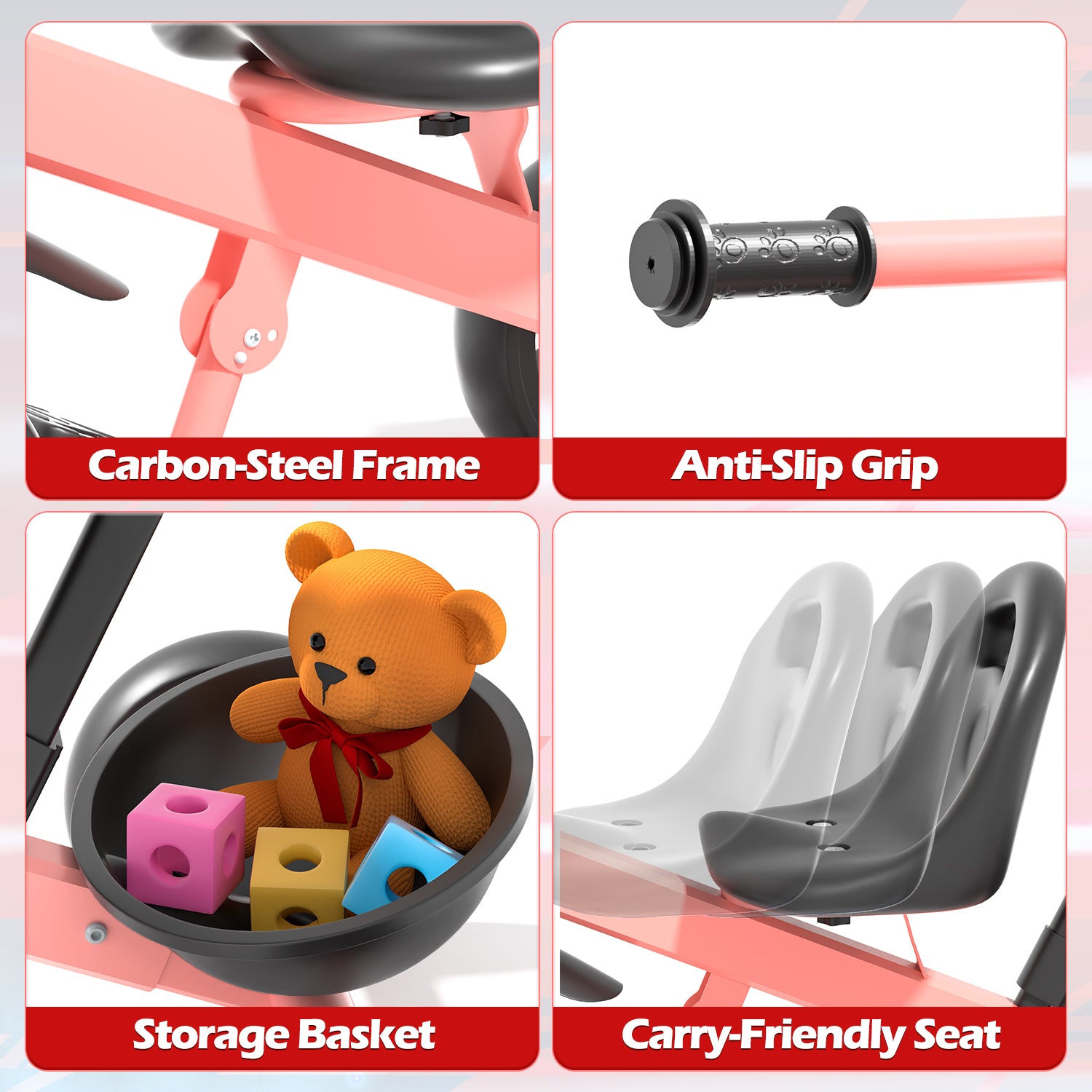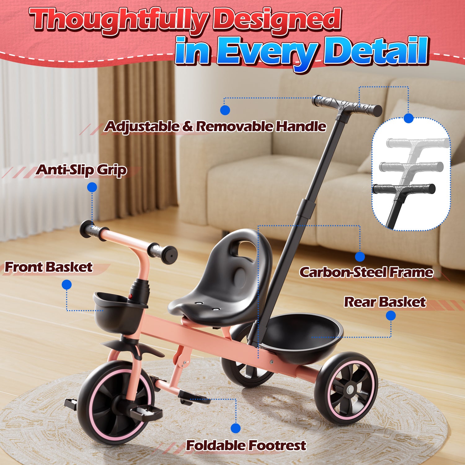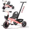 JoyStone 2-in-1 Toddler Tricycle for Ages 1-4 Years, Kids Trike Toddler Bike with Removable Push Handle, Adjustable Seat & Basket, Pink