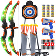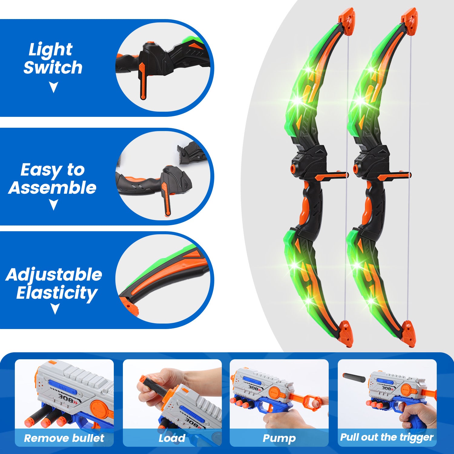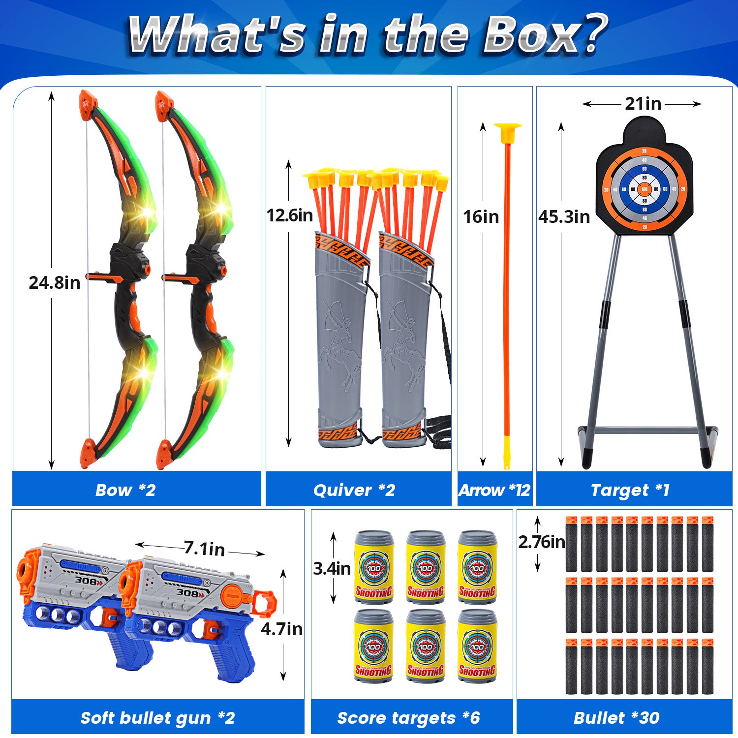 - [LED Lighting Bow and Arrow Set] -Includes 2 bows with LED light, 12 suction cup arrows, 2 foam dart toy game, 30 soft bullets, 1 detachable standing target, 6 score targets, and 2 carrying quivers, 2 fixed nails. LED lights bow allow little archers to aim more accurately and play day and night, it is an amazing toy for family gatherings and birthday parties!
