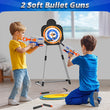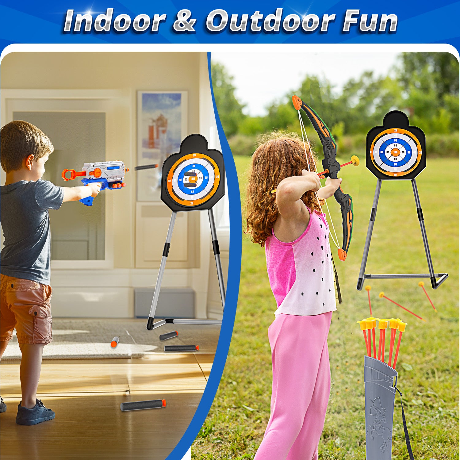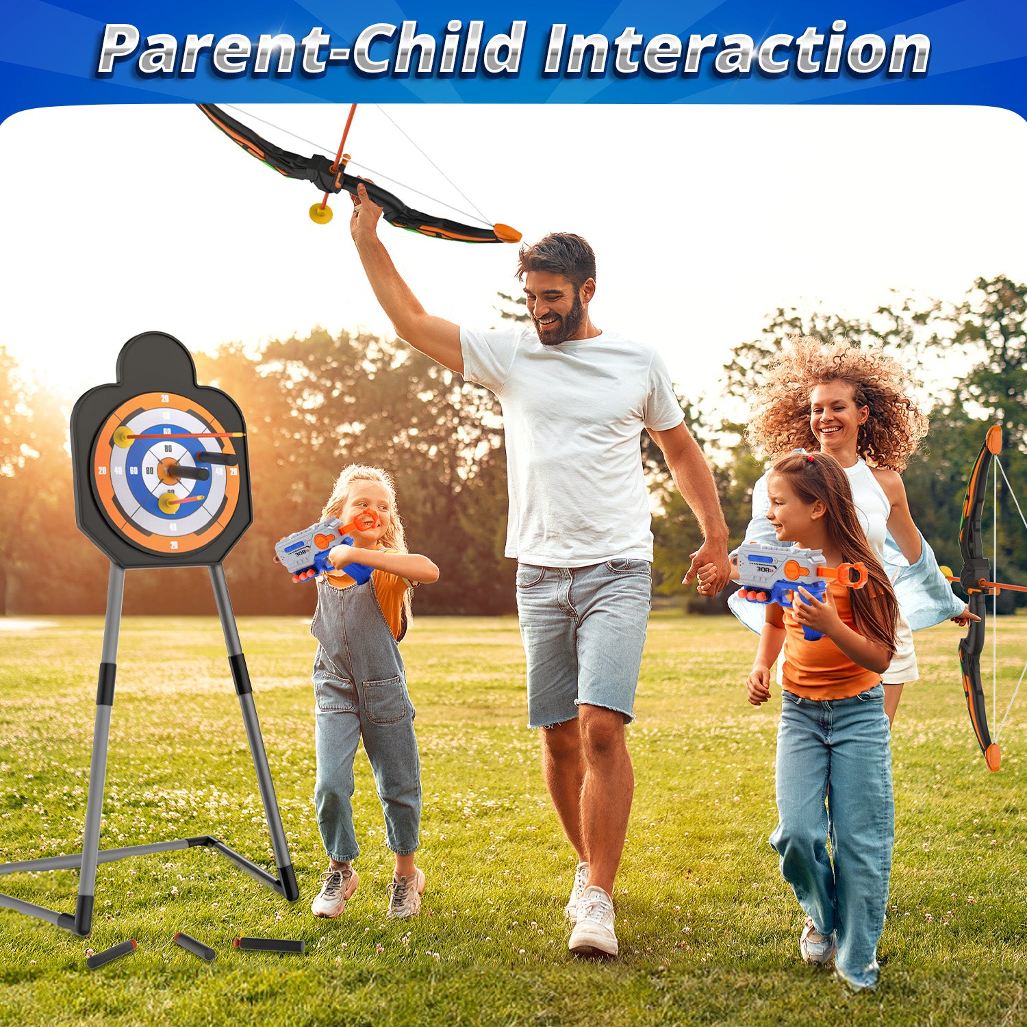 - [2 In 1 Shooting Games] The upgraded bow and arrow toy set is compatible with 2 play modes: ①bows and arrows. ②foam darts shooting toy game. It is highly suitable for multiple players. There are different scoring areas on the standing target. Children can aim at and hit the target to score points, enabling them to experience the joy of competing with each other.