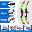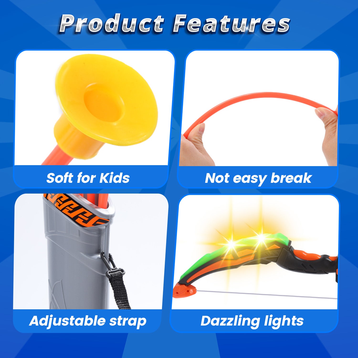 - [Great for Indoor and Outdoor Activities] The toy bow comes with LED lights, press and hold the light on the button all the time and the LED light will stay on. With an quiver strap, easy to carry out camping and play while traveling. What a cool archery experience!