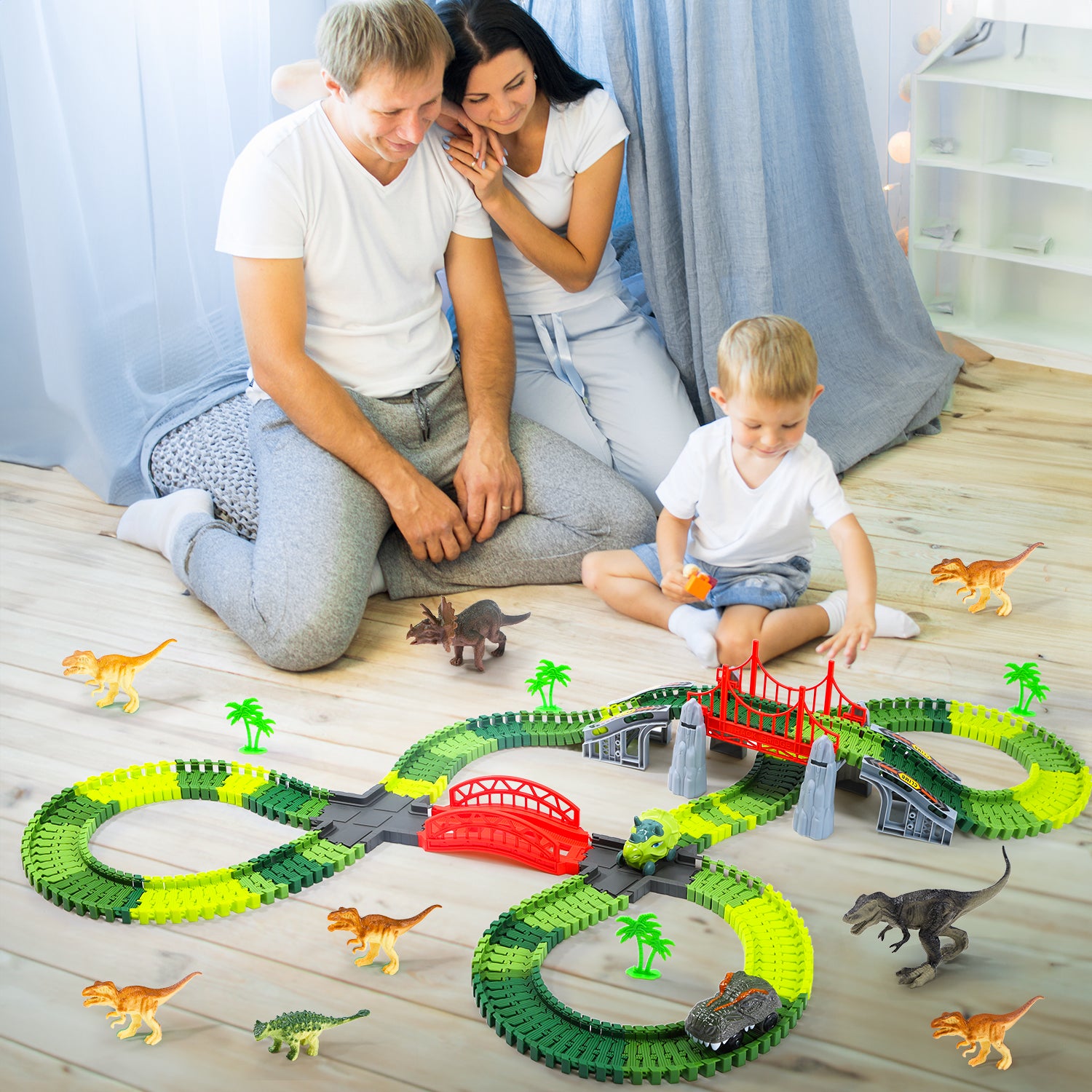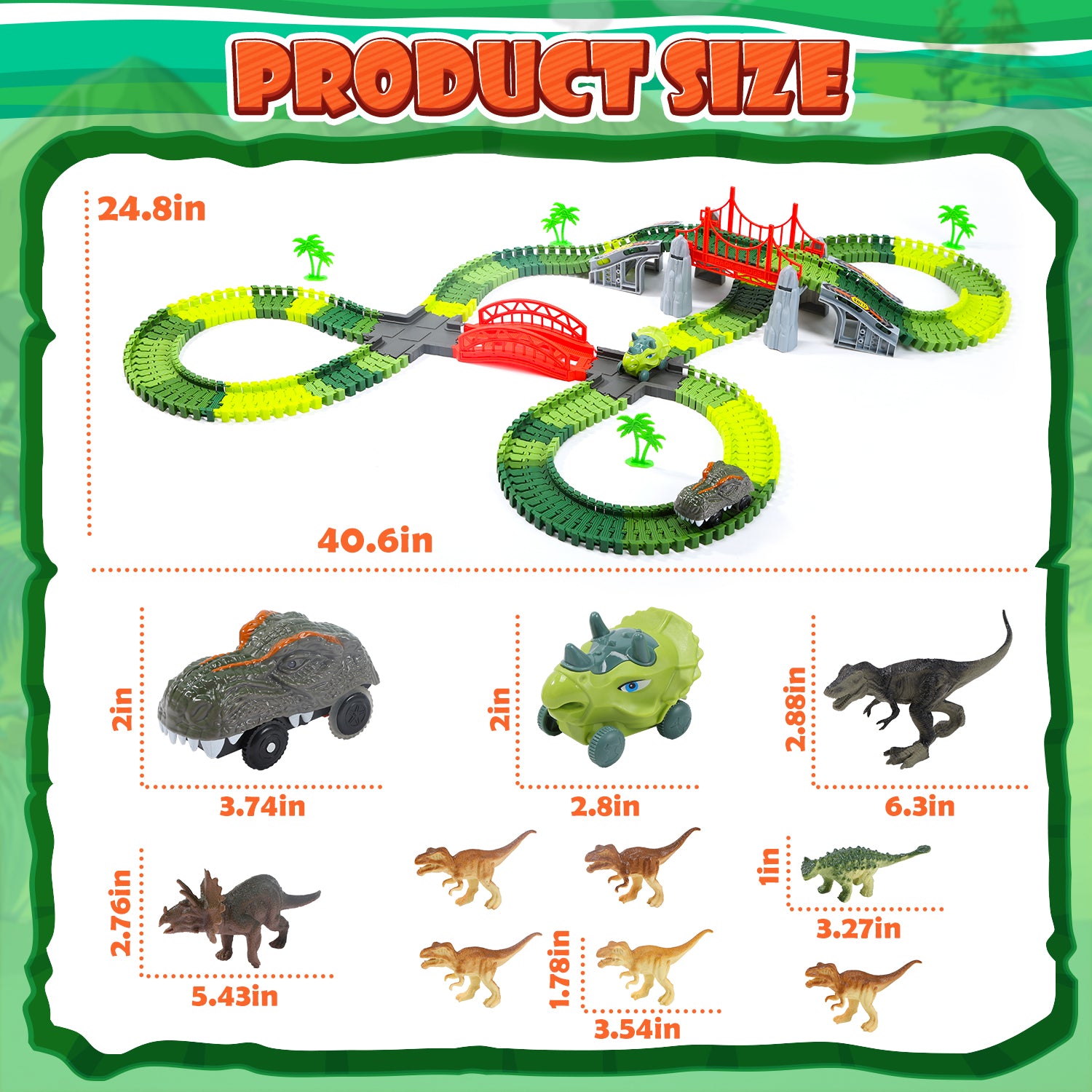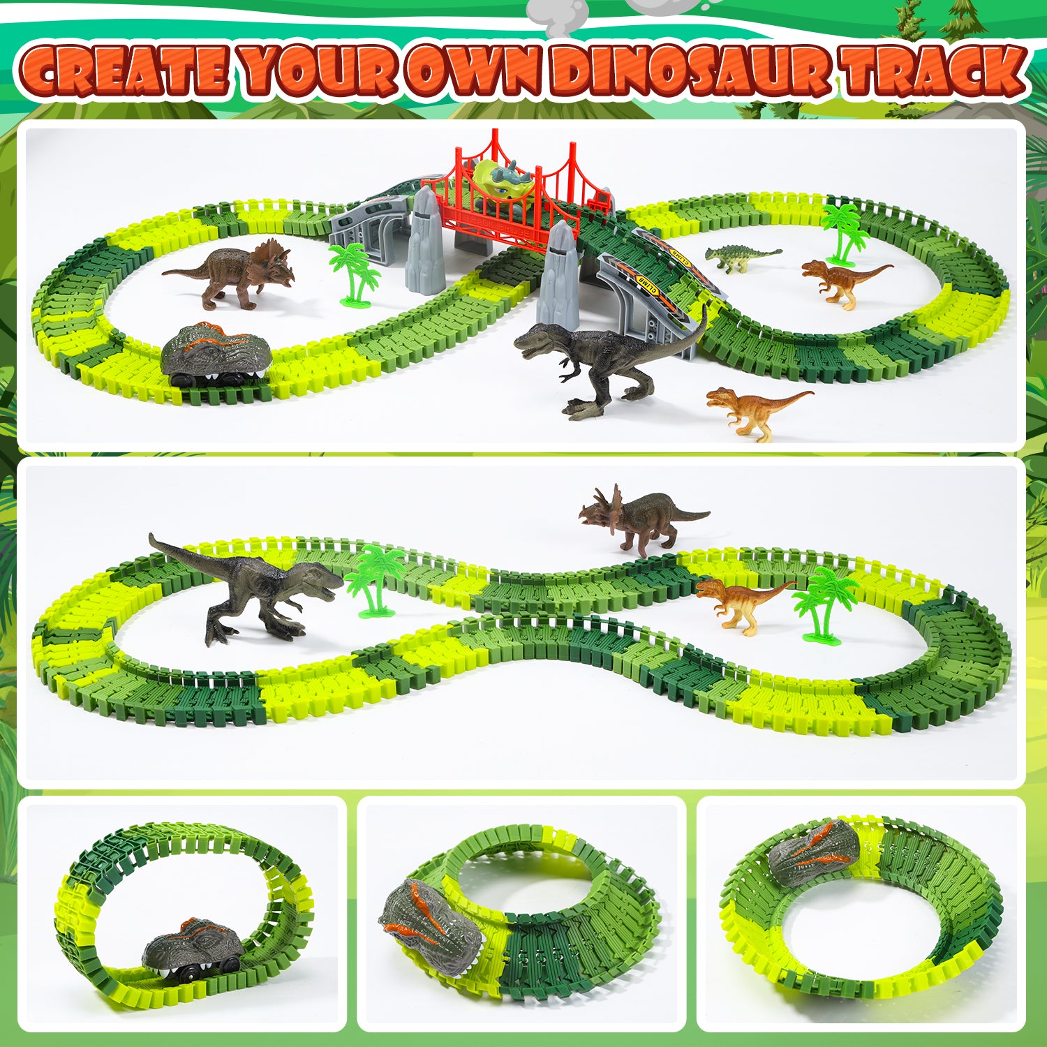 JoyStone 275 PCS Dinosaur World Race Track Toys, Flexible Dinosaur Train Tracks Playset with 2 Dinosaur Cars and 8 Dinosaur Figures, Dinosaur Toys for Boy Girls