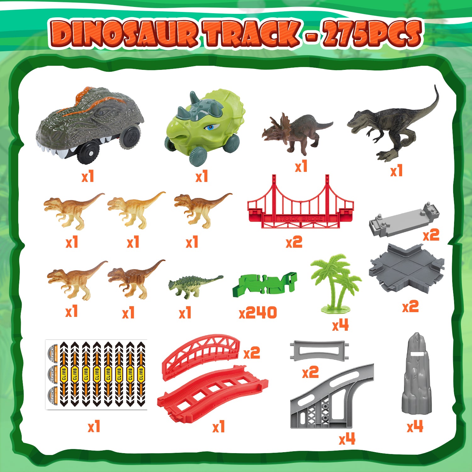 - 275PCS Dinosaur Track Set - 240 track pieces, 2 big dinosaurs, 6 small dinosaurs, 4 trees, 1 battery-operated dino car, 1 dinosaur pull back car, 2 X-shape crossroads, 2 Slopes,1 bridge. Come and build a dinosaur world race track with your children!