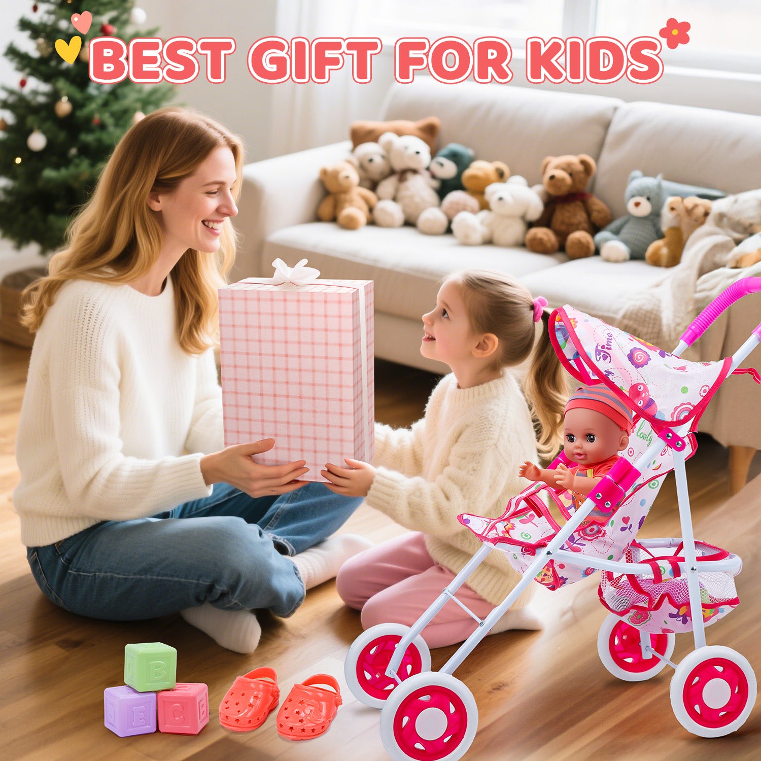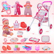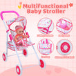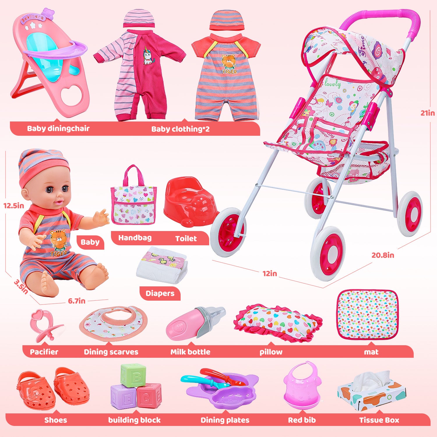 JoyStone 35Pcs Baby Stroller Toy, 12" Soft Body Dolls, 21'' Foldable Doll Stroller with Storage Basket, Baby Toy Gift for Age 3+ Years Old Girls Boys