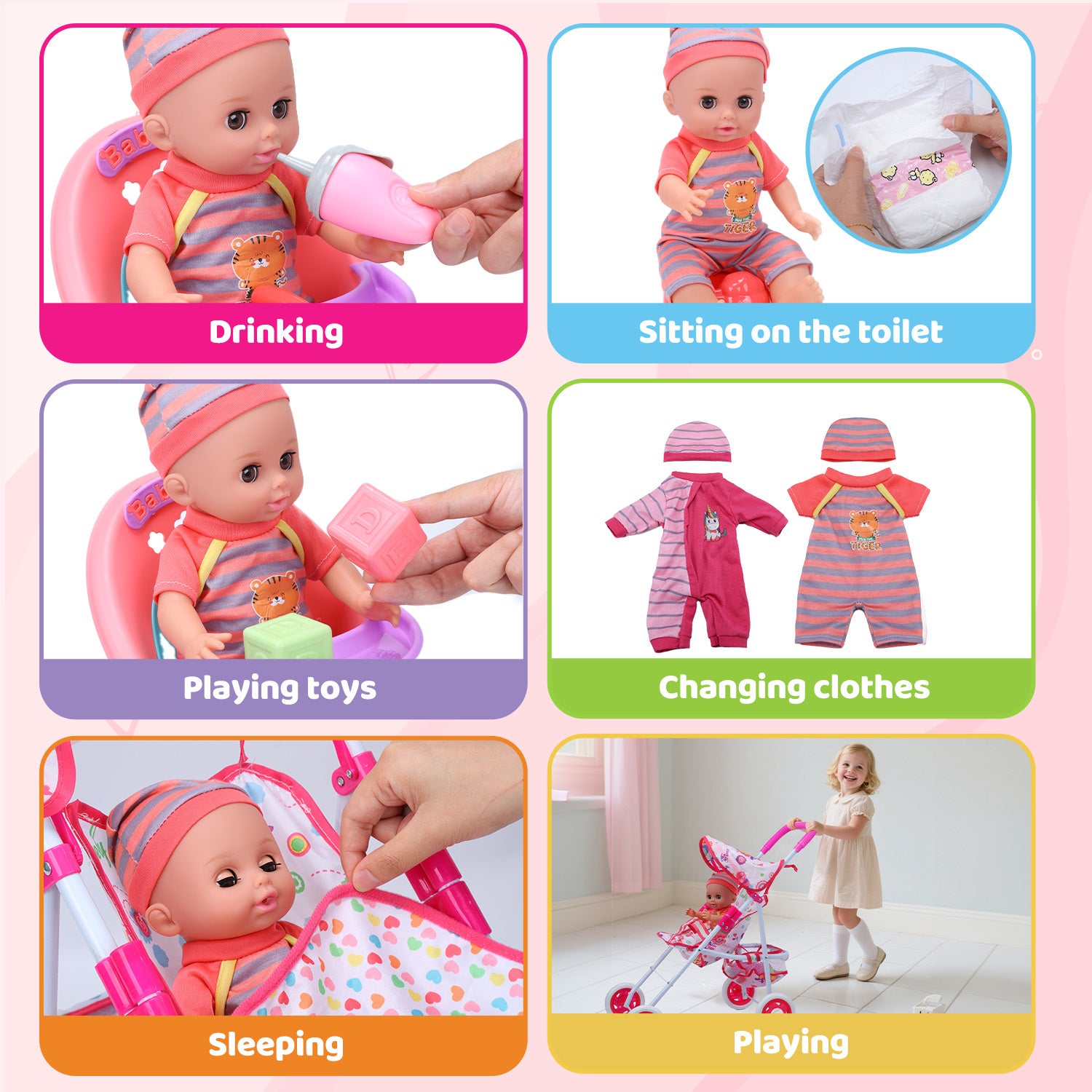JoyStone 35PCS Soft Baby Doll Playset is a wonderful toy. They include items like a 12-inch doll, a 21'' Foldable Doll Stroller with a Storage Basket, a high chair, various accessories, and toys. The dolls have removable and washable clothes and movable joints, and the doll can even make sounds. These sets are great for pretend play, allowing children to use their imagination and develop skills such as hand-eye coordination, patience, and creativity. They are ideal educational toys and perfect gifts for kids aged 2 - 6 and above, especially for those who like to take care of others.