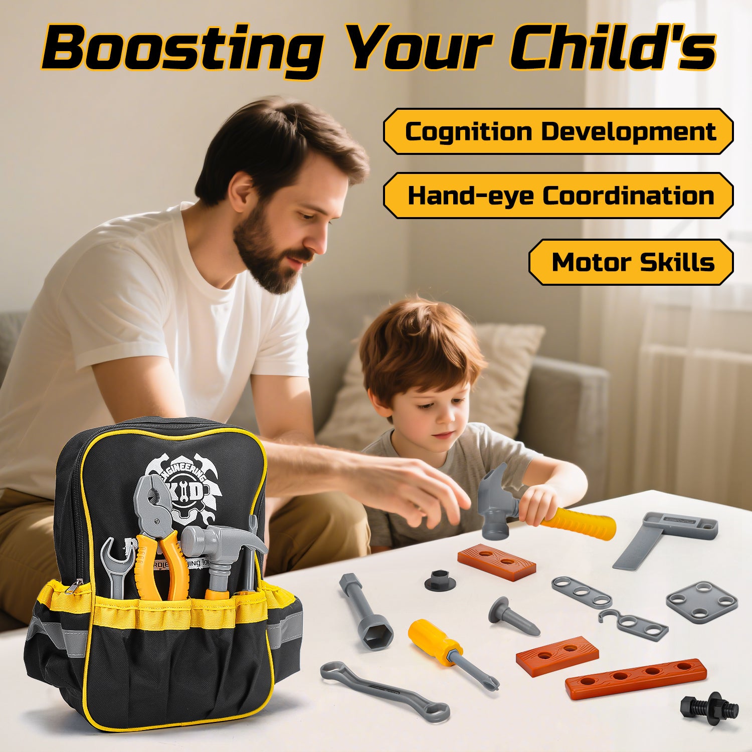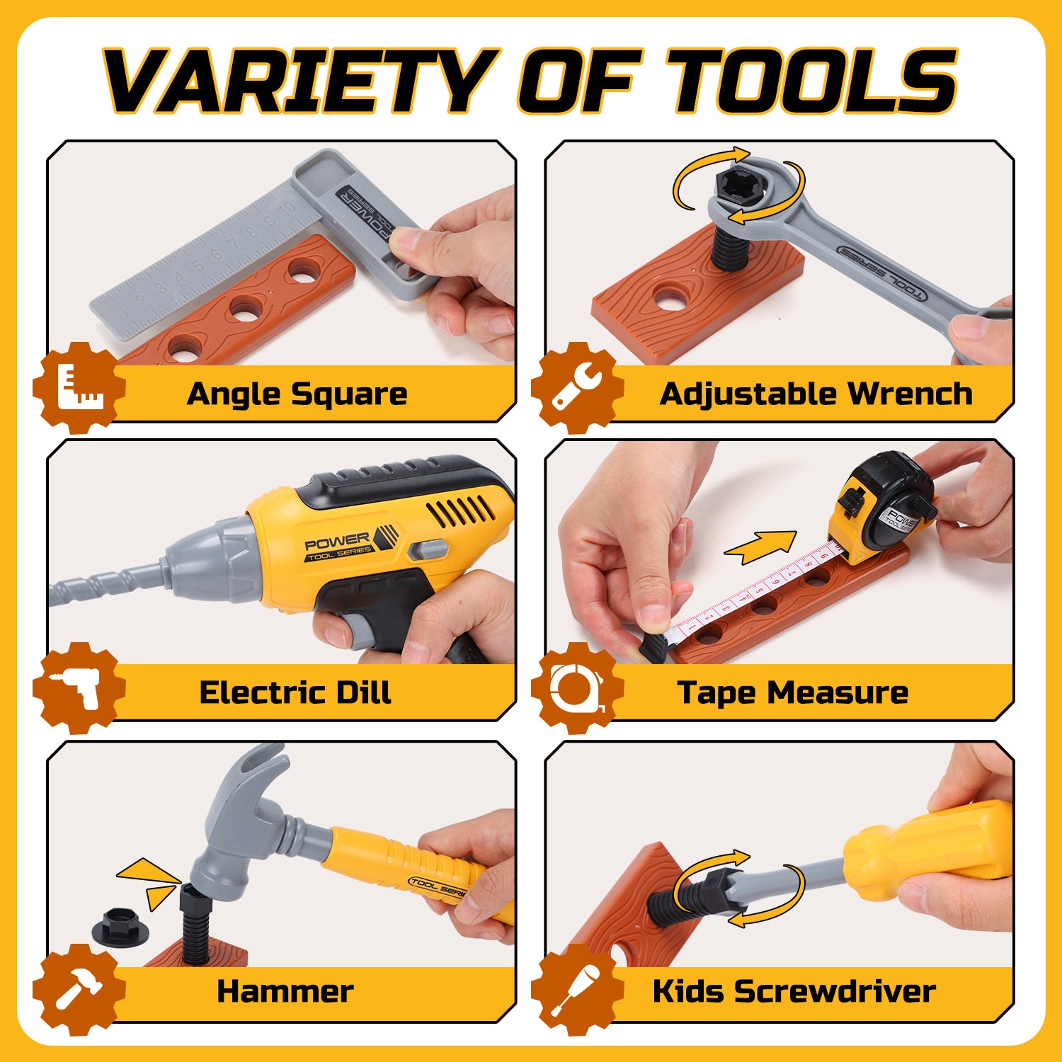 - 【Endless Fun】This kids tool set can bring endless fun to your child, allowing them to easily operate the components of this awesome tool set. Children can also exercise their independence as they organize, repair, and arrange their own toys! This tool set is not only fun, but also allows them to learn a lot!