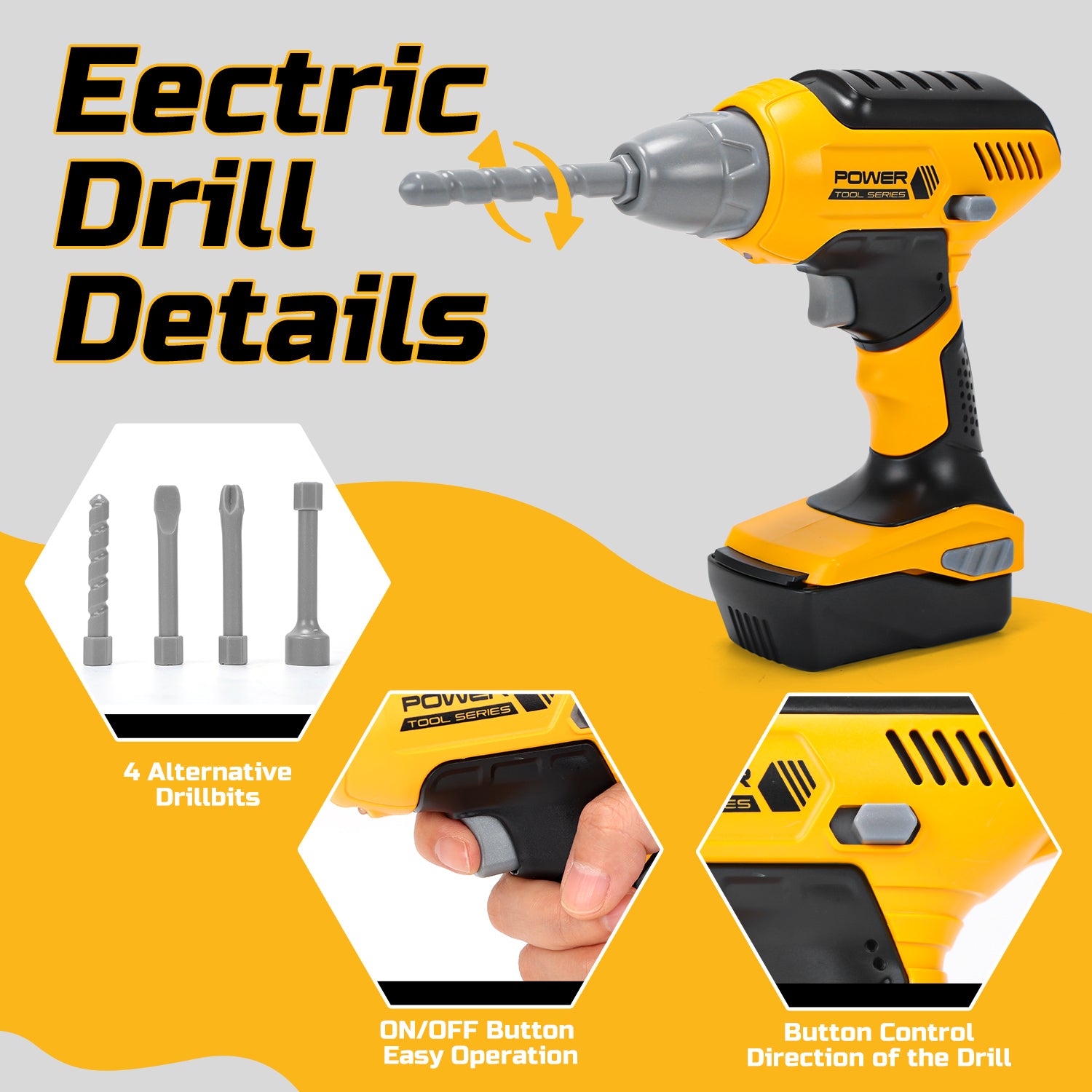 - 【Realistic Function】The electric drill comes with an automatic rotating chuck, automatic saw, and 3 replaceable drill bits. There is a button on the electric drill that allows you to switch the rotation direction of the electric saw at will. Your child can enjoy the fun of buzzing automatic drilling and screwing parts. Children can travel with this realistic portable backpack filled with tool toys so they can pretend they are real workers! This is a versatile product that can be used as both a costume and a toy.