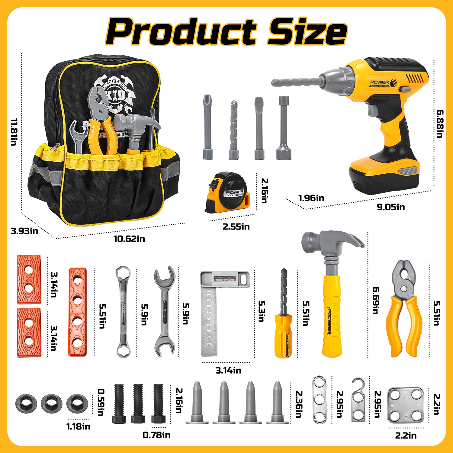 - 【28-Piece Tool Box】This 28-piece kids backpack tool set includes everything you need! Including an electric drill, realistic hammer, screwdriver, wrench, and a variety of nails, nuts, and more! It makes a great gift idea for a little boy and a great gift idea for a little girl who loves hanging out with dad in the garage.