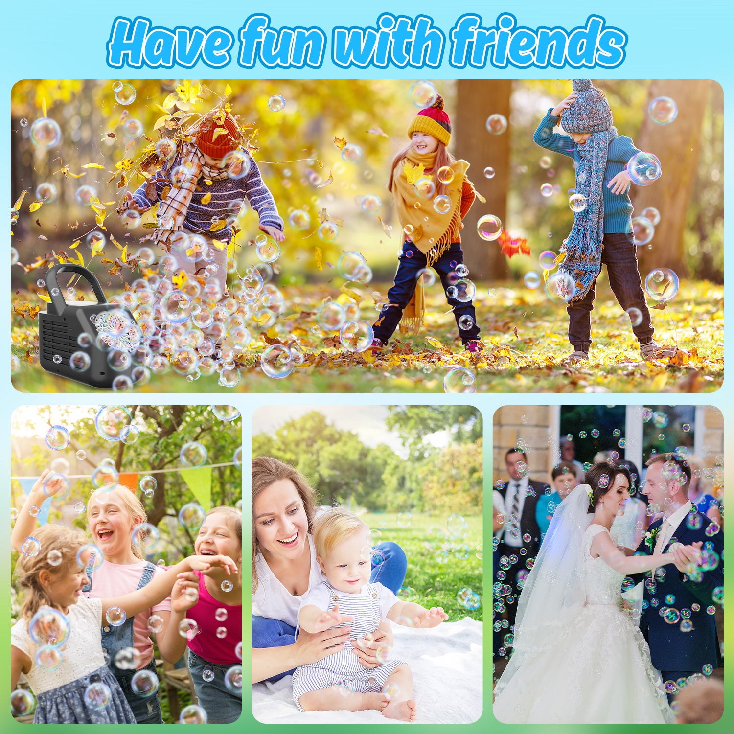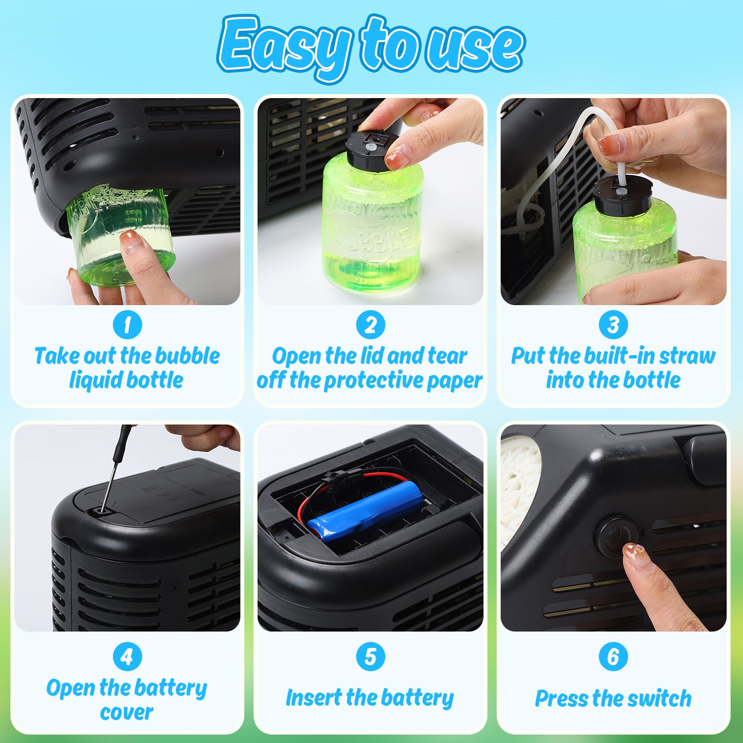 Our bubble machine is upgraded that uses bottled bubble solution instead of the traditional solution container, you no longer have to worry about the solution spilling out of the container, which eliminates the risk of solution spillage and panic during play; and our bubble machine is battery powered, which makes it possible to be used it anywhere without worrying about finding a power outlet, even outdoors. Create a wonderful atmosphere with ease. More joy for you and your family!