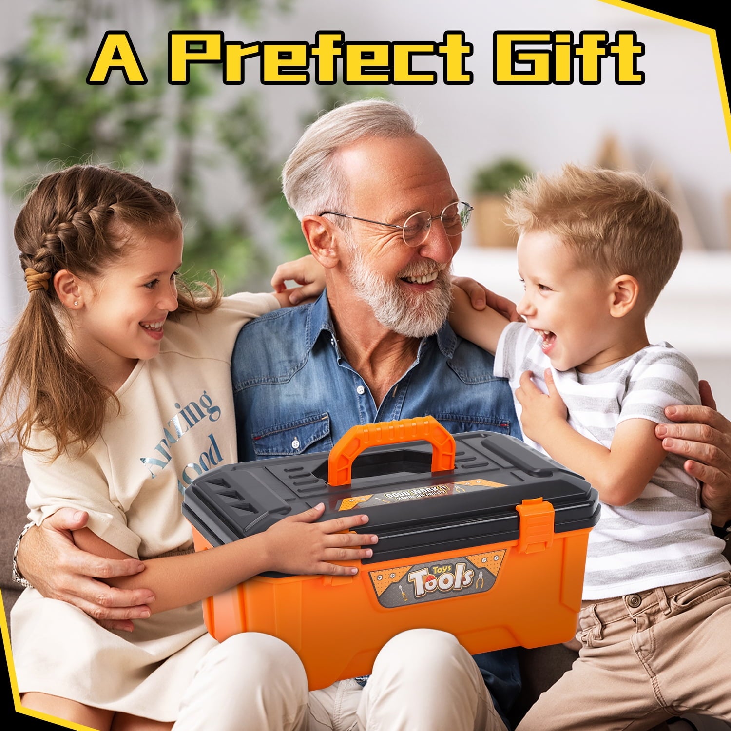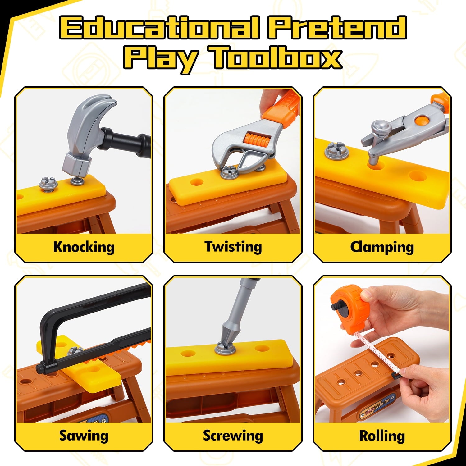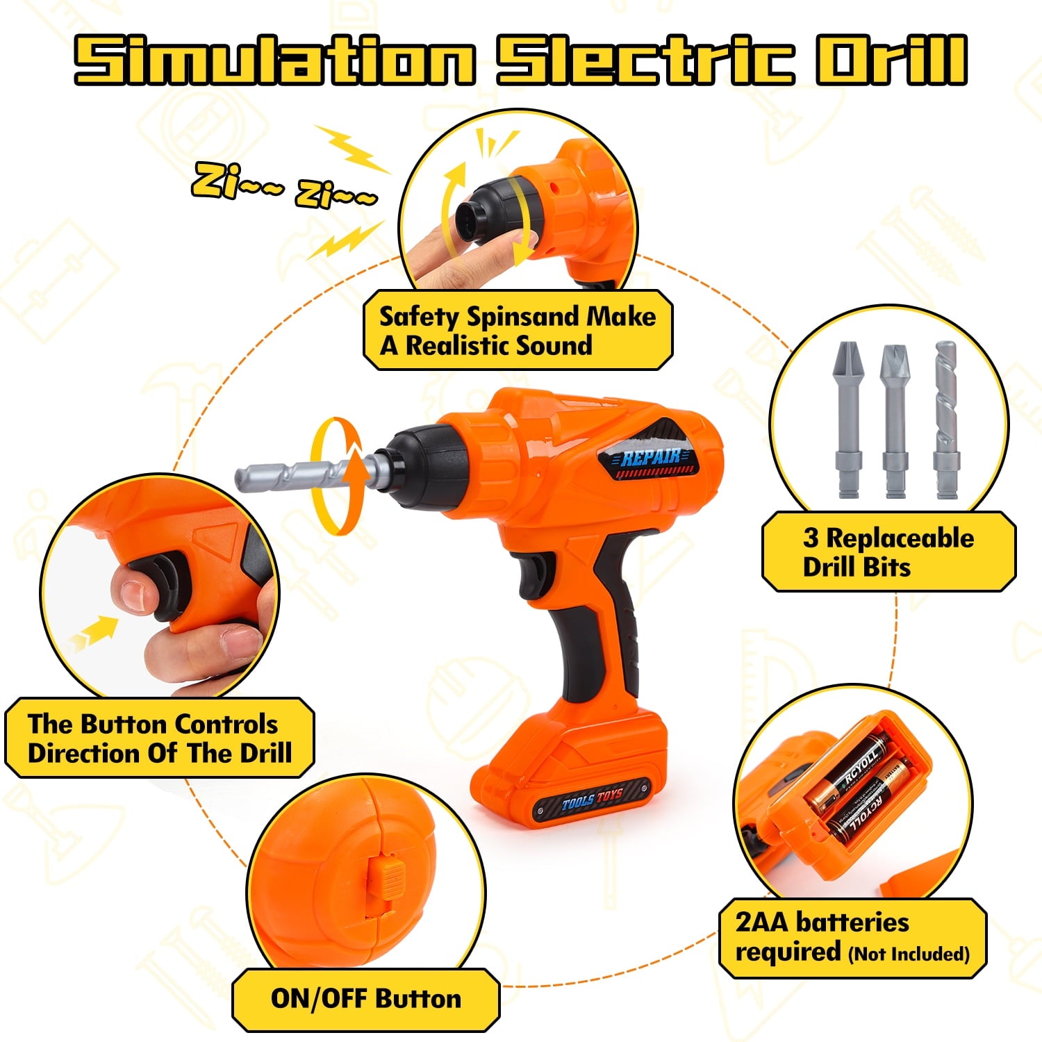 JoyStone 42PCS Tool Set Toddler Beginner Tool Set with Tool Box & Toy Chainsaw & Drill,Pretend Play Toys, Gifts for 3-7 Kids, Yellow