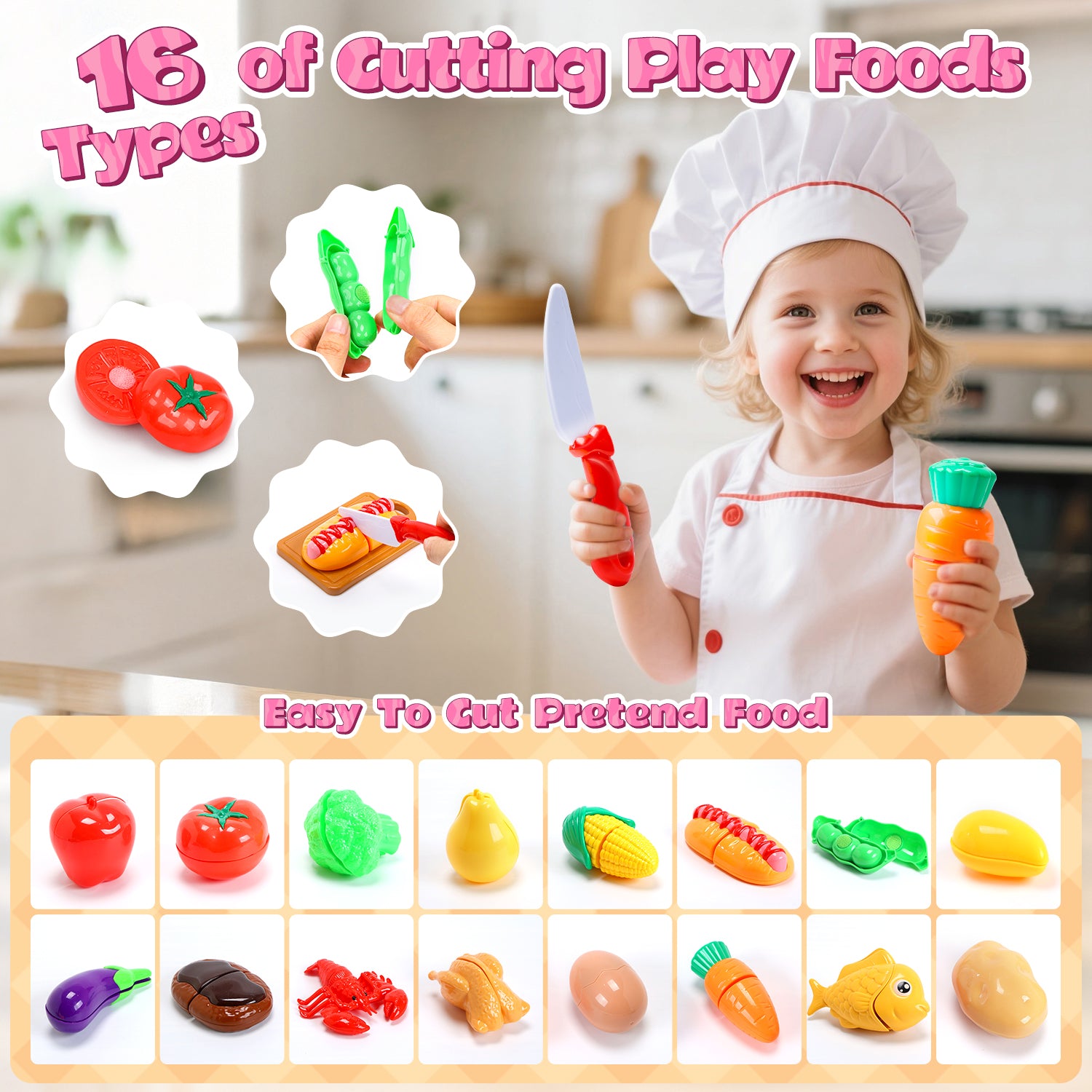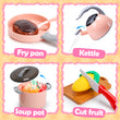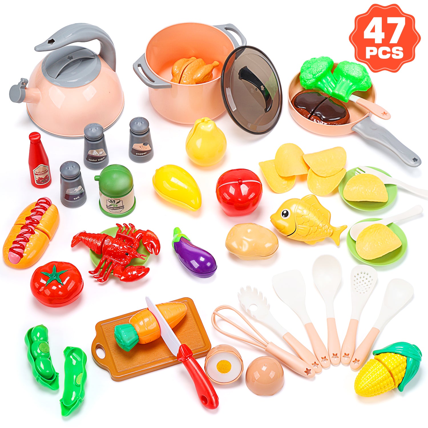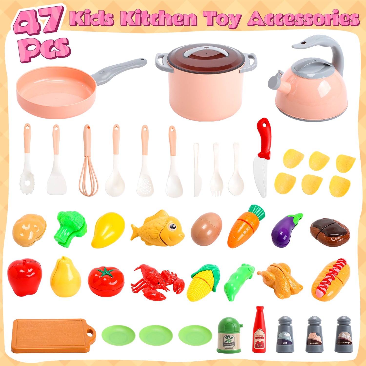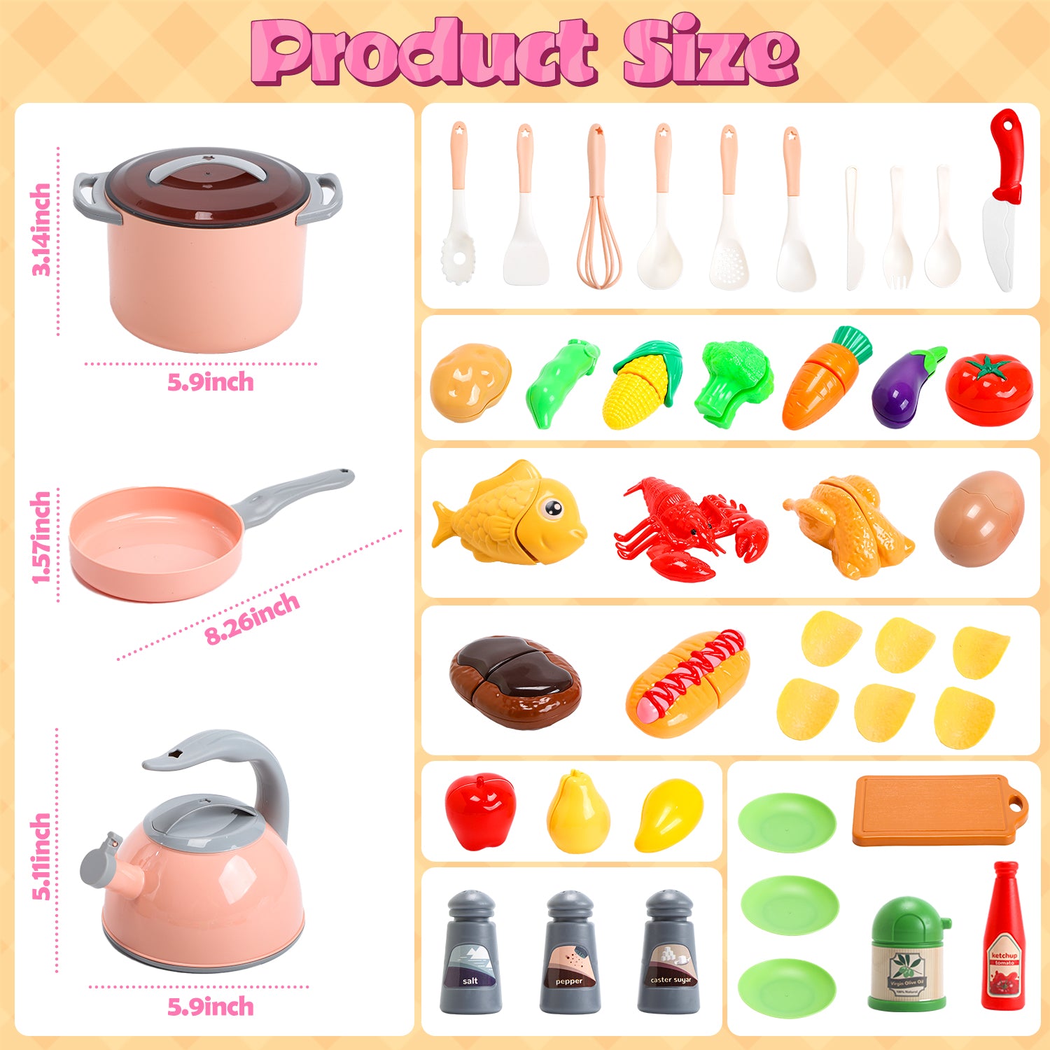 - 【Kitchen Play Sets for Kids】Come with a total of kitchen play parts, including a pot, a frying pan, a kettle, a kitchen knife, a cutting board, 5 condiments, cutting food. Plenty of cooking accessories will keep your little cute busy for hours!
