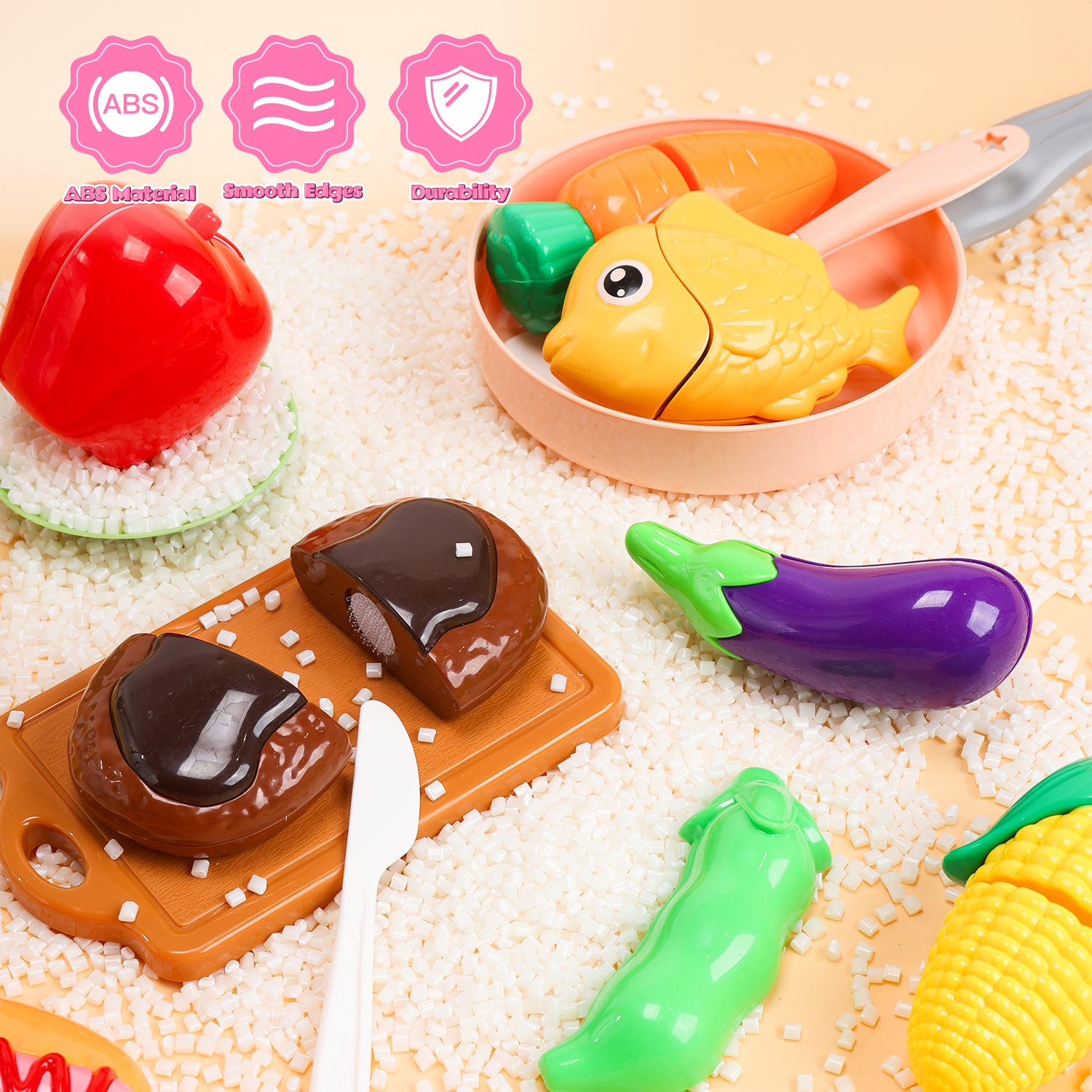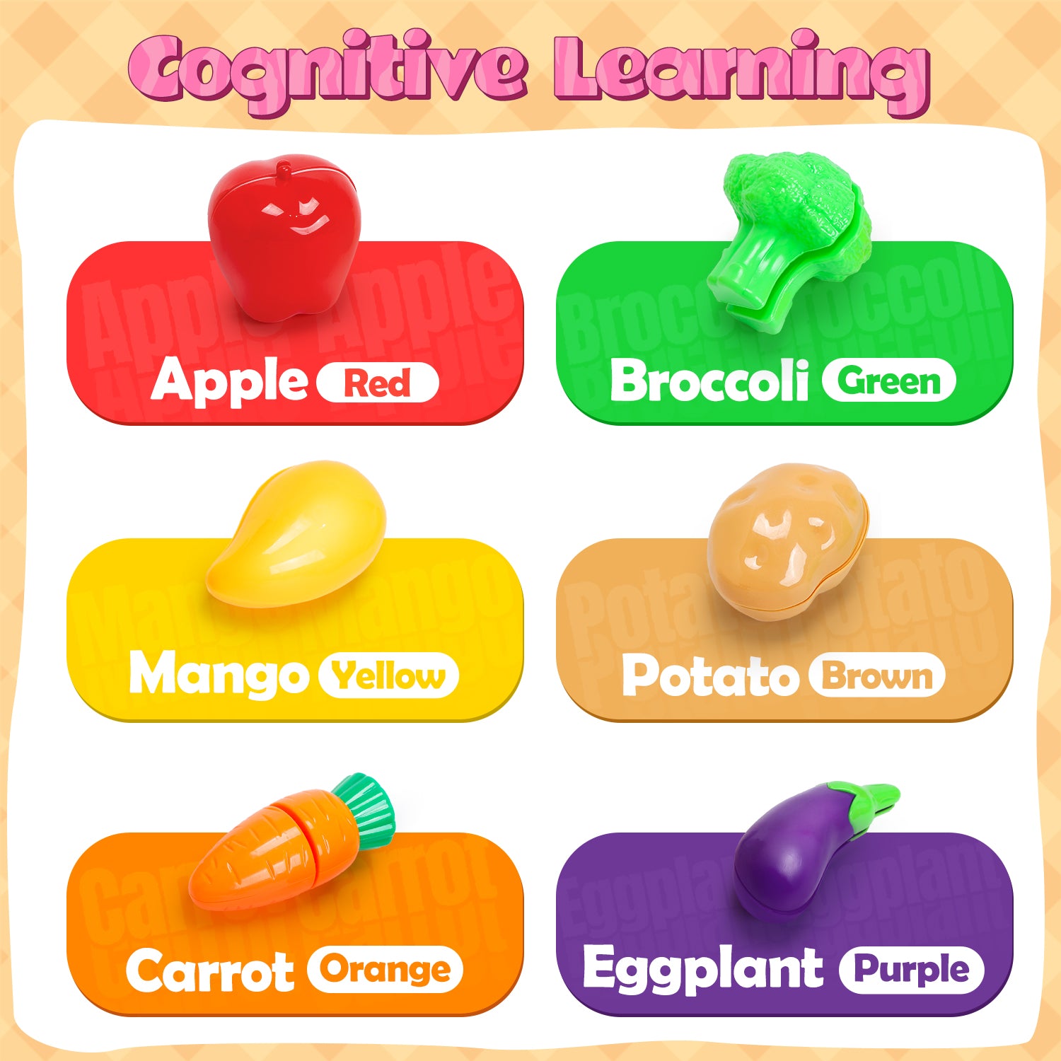 - 【Fun Cutting Play Food】Colorful play fruit and vegetables can be cut and peeled easily, when you cut them, you can make a realistic chopping sound, which provides a realistic experience for your little ones. Bringing endless fun for your kids.