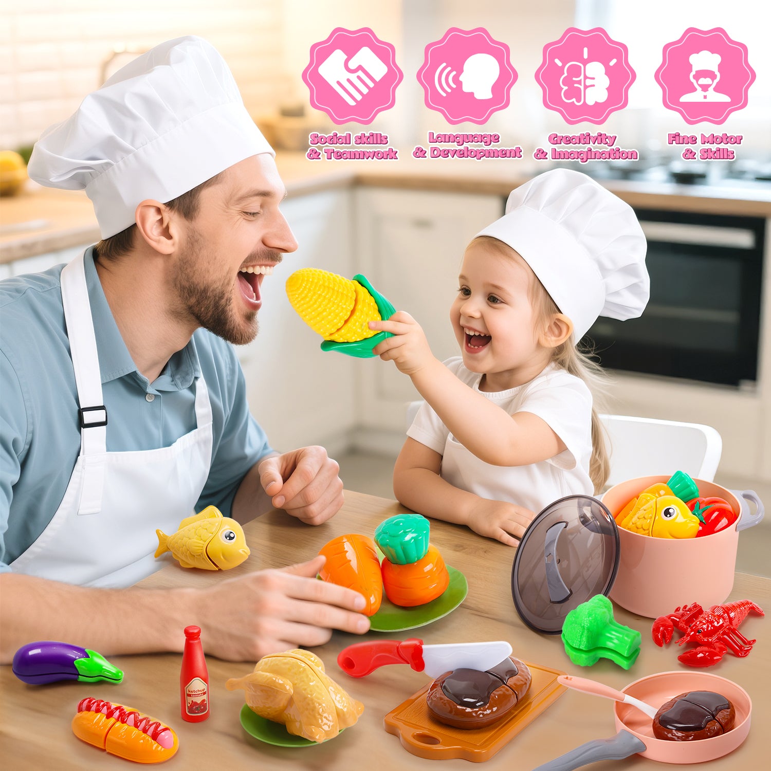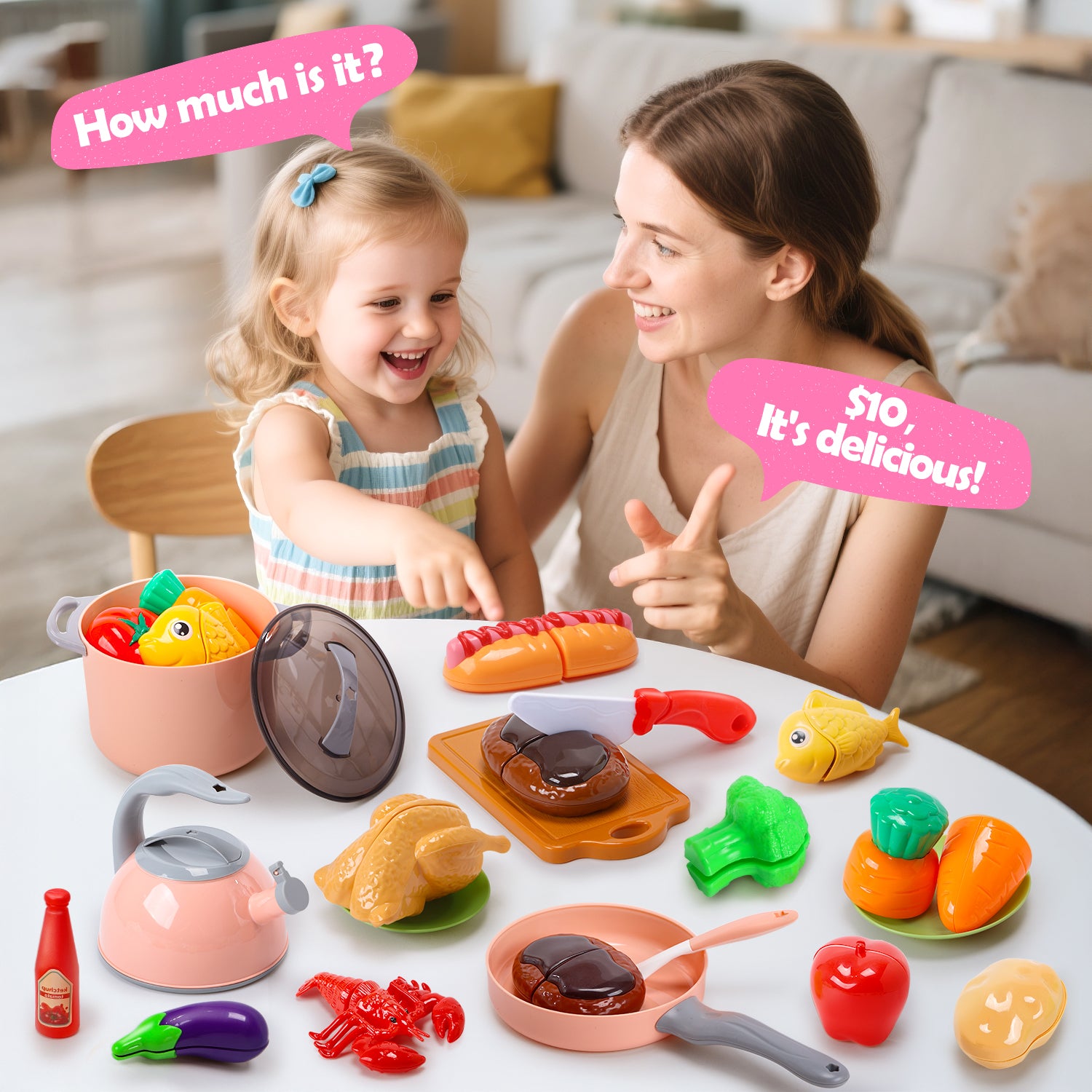 - 【Learn While Playing】Various kitchen utensils, vegetables, fruits, and seafood can activate children's imagination and interest. They can also learn the color, names, and some cooking knowledge. It is a great educational Kitchen toys gift for Christmas, Easter, Children's Day, New Year and any holidays.