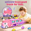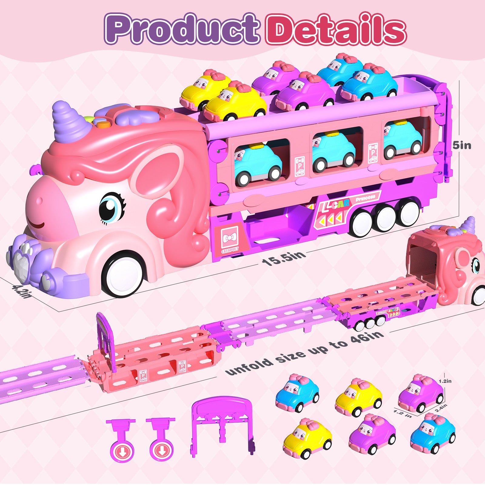 - ?7 in 1 Unicorn Toy Car Set?The toy set includes 1 large pink unicorn truck,6 little princess cars?1 racing terminal door, DIY stickers.Kids can put little princess cars in the toy car garage parking lot to improve their hand-eye coordination.