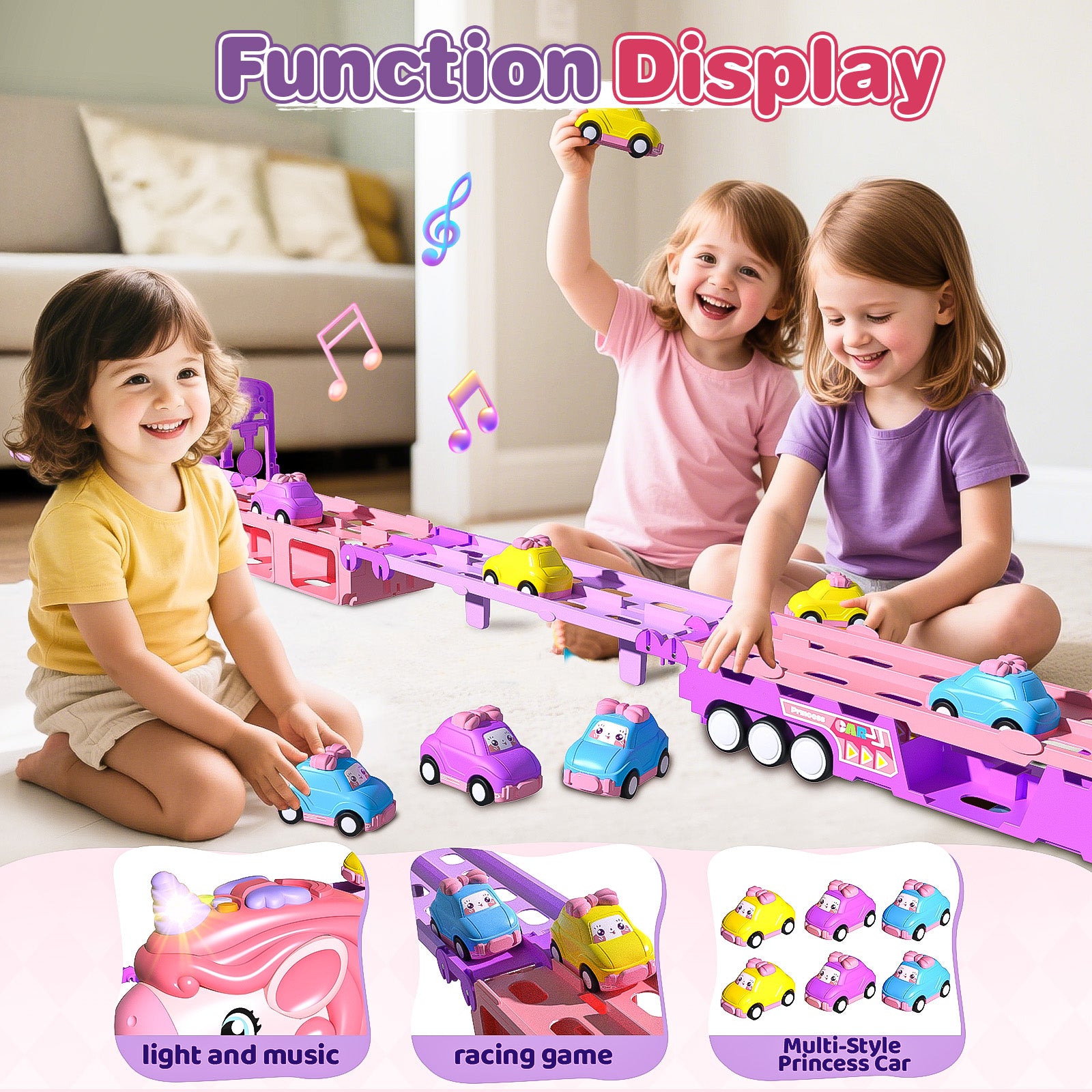 - Perfect Car Toy Set?Includes a pink princess-style carrier truck and 6 colorful mini cars, designed for toddlers and young kids to enjoy hands-on racing fun.
