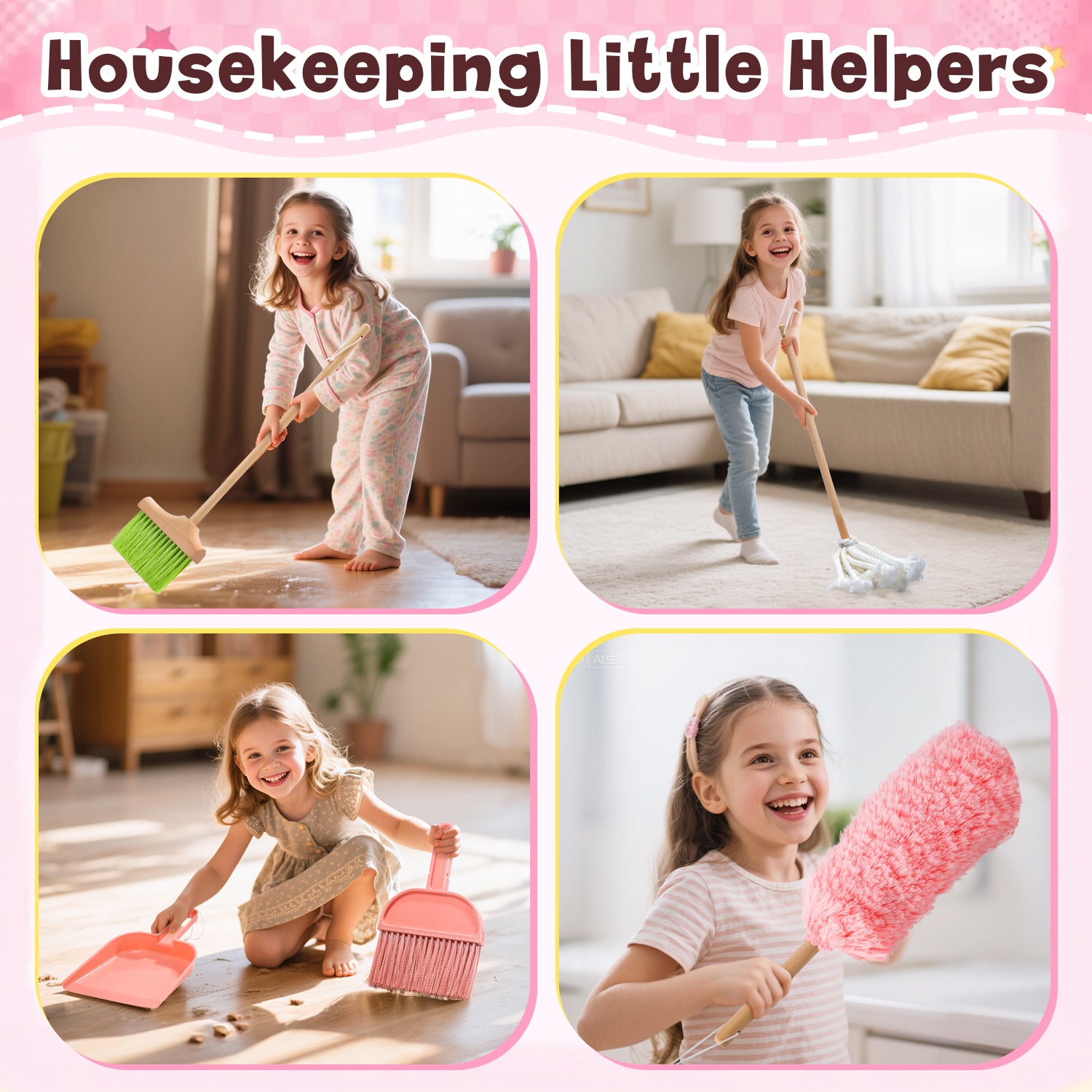 - 🧹 Realistic & Interactive Playset – Includes a broom, mop, duster, and dustpan, perfectly sized for small hands. Encourages imaginative role-play, STEM skill development, and hands-on learning.