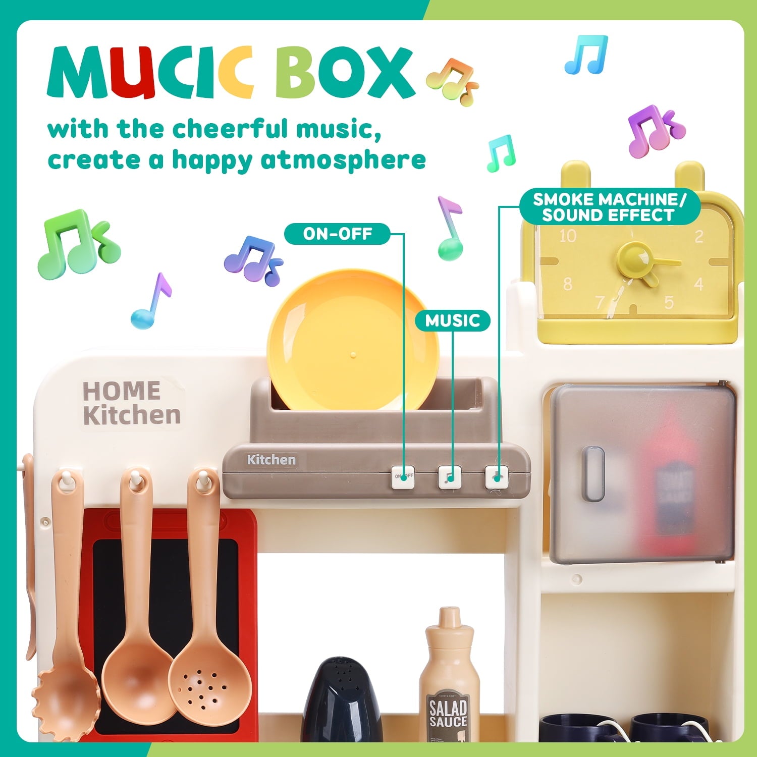 63-Piece Play Kitchen Accessory Set included electronic stovetop,play sink with running water, Egg steamer , Mini blackboard and kinds of kitchen accessories.Various cooking utensils for your little one to have countless hours of fun and play.