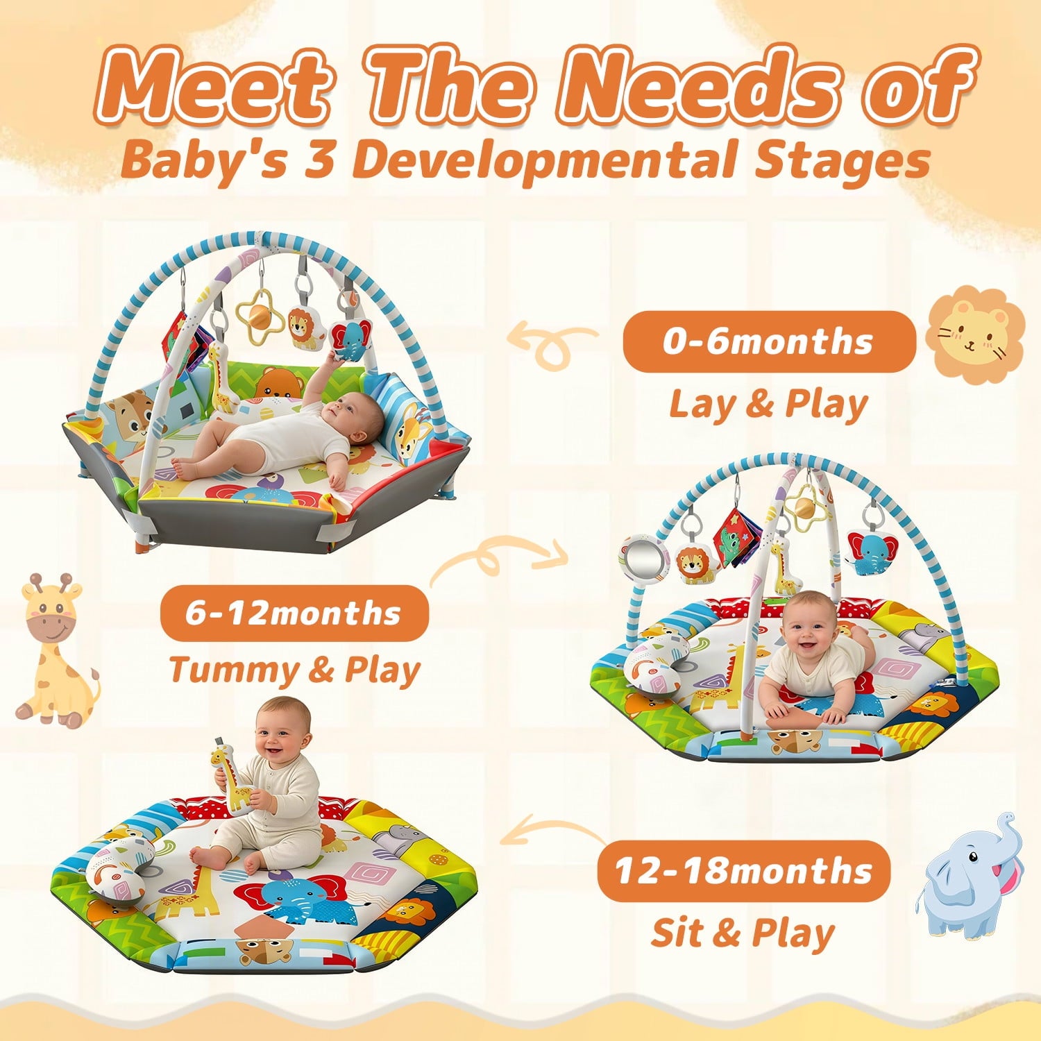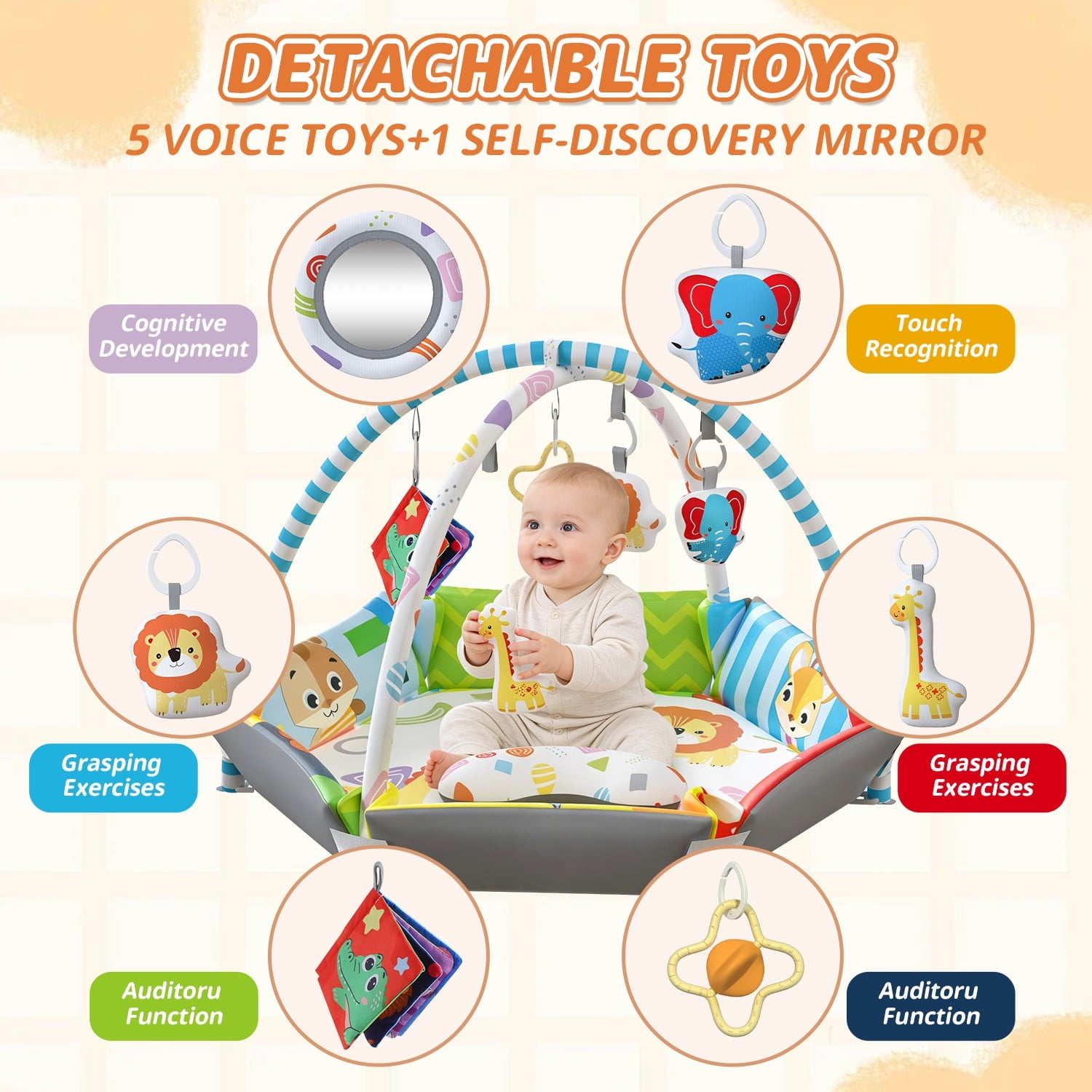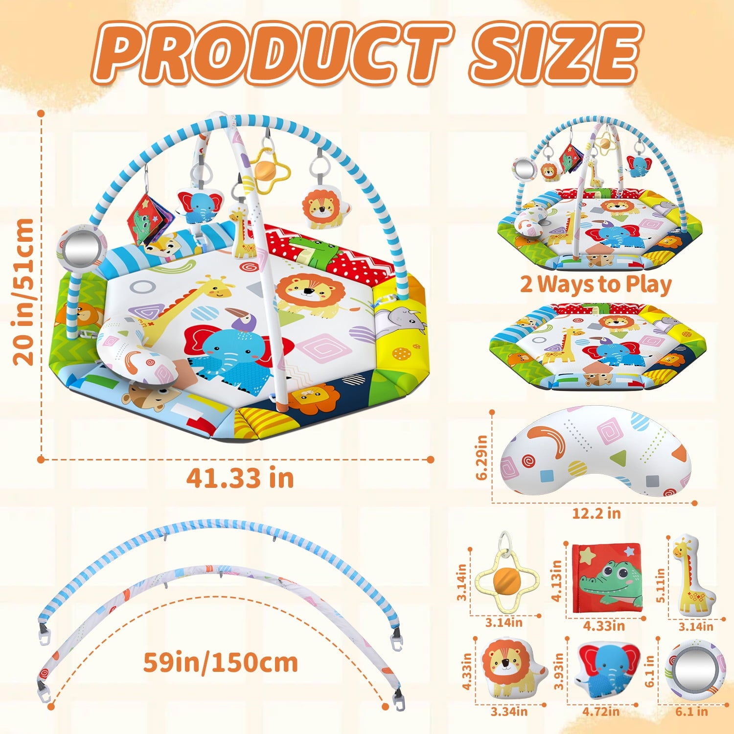 - 【With 6 detachable toys】It comes with 6 detachable toys, including elephant, giraffes, books, lions and rattle. It also comes with a mirror and pillow, which can be placed next to the baby to stimulate the visual ability of young children.