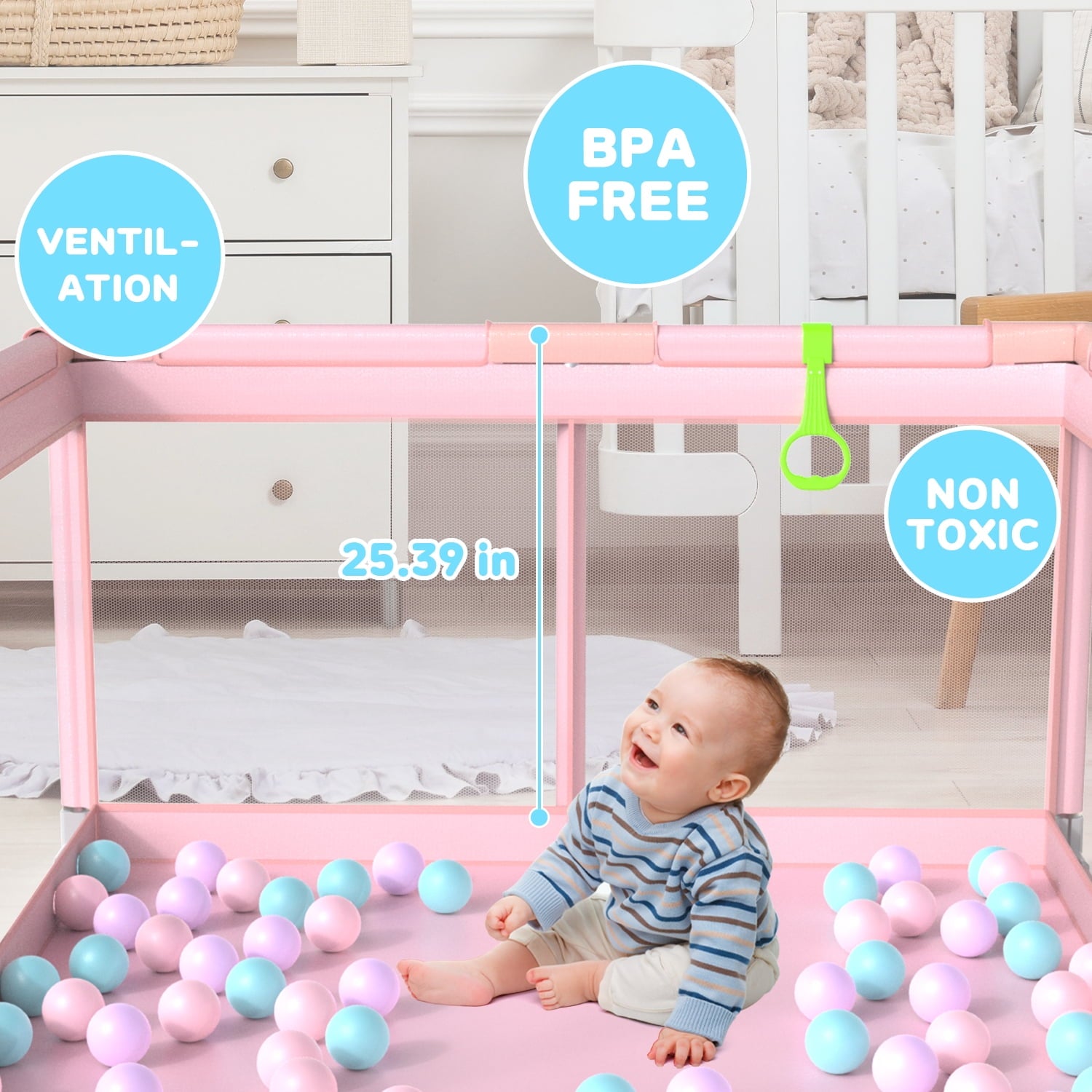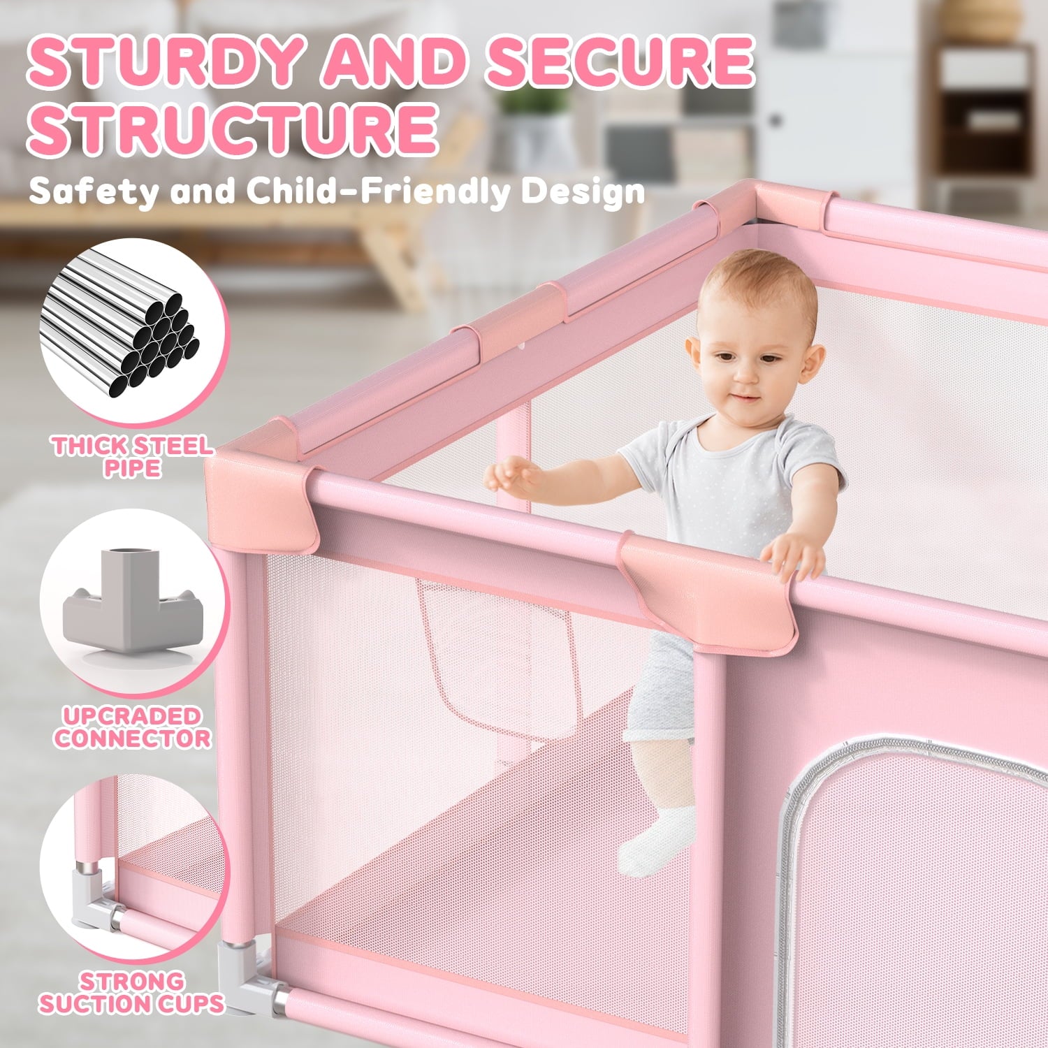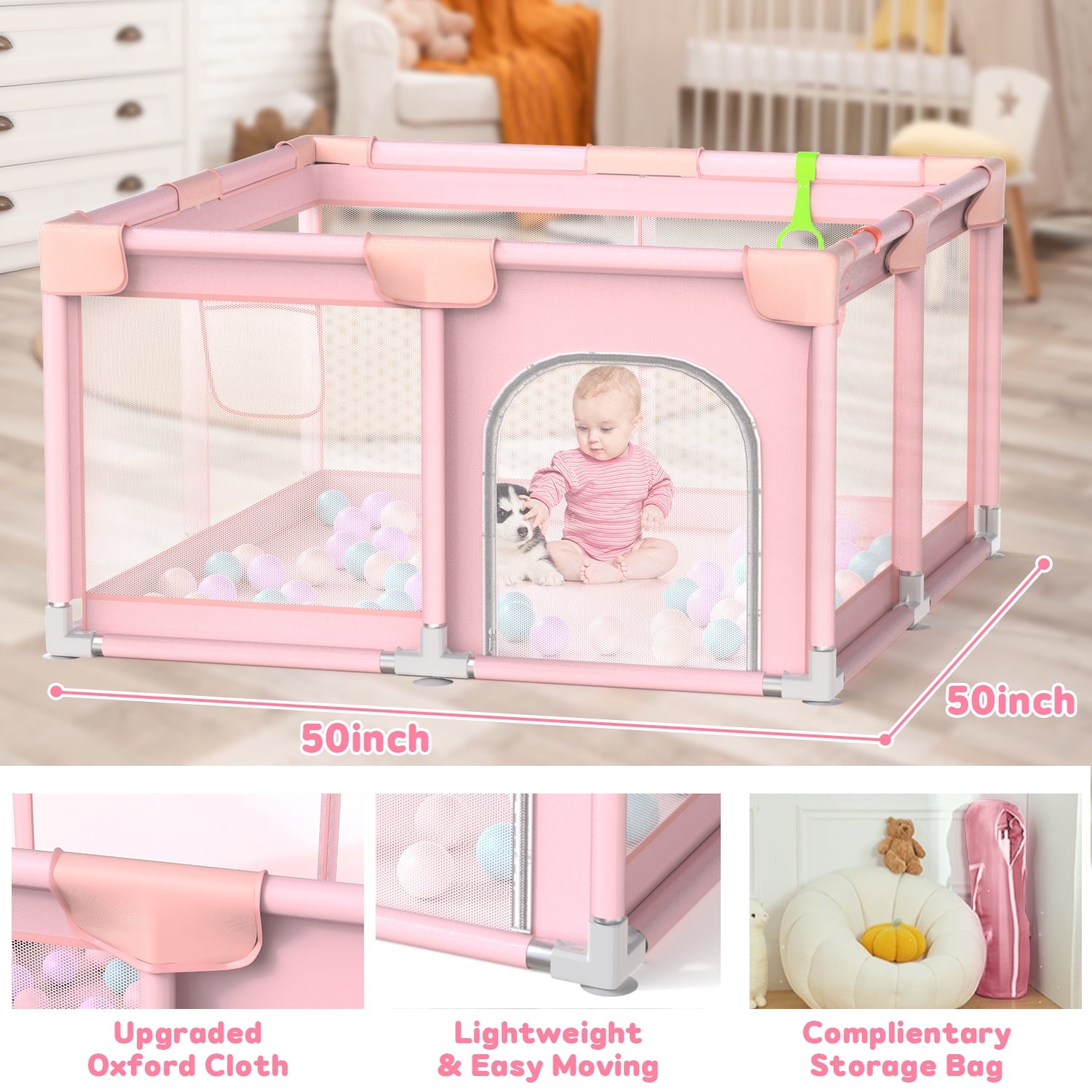 JoyStone Baby Playpen 50''x50'' Inches, Safe Non-Slip Base Play Yard with Soft Breathable Mesh, 2 Pull-Up Rings & Carry Bag, Sturdy Indoor & Outdoor Baby Activity Center for Toddlers, Pink