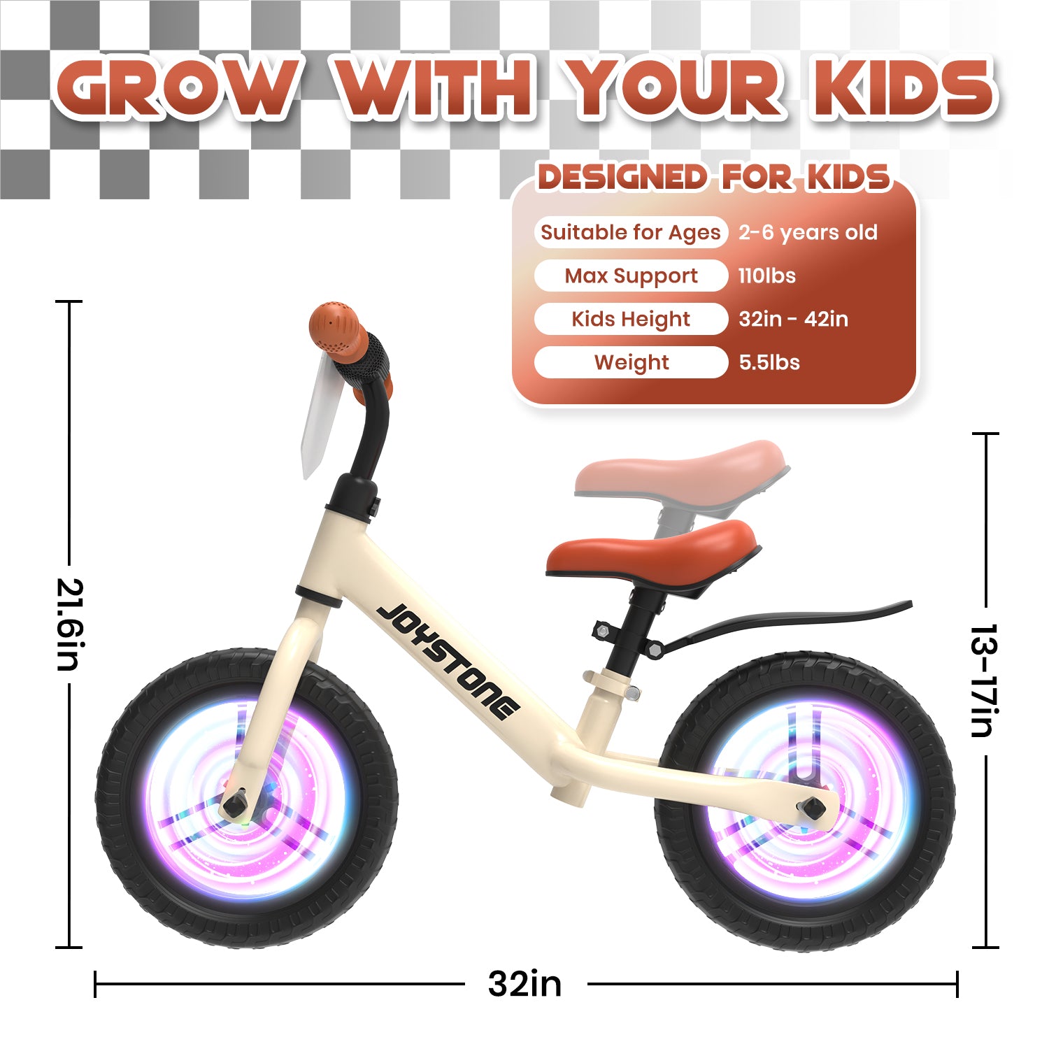 JoyStone Colorful Lighting 12 Inch Toddler Balance Bike Toys for 1-3 Years Old Boys Girls, Kids Training Balance Bike with Adjustable Handlebar and Seat, No Pedals Bike Gift for Kids, White