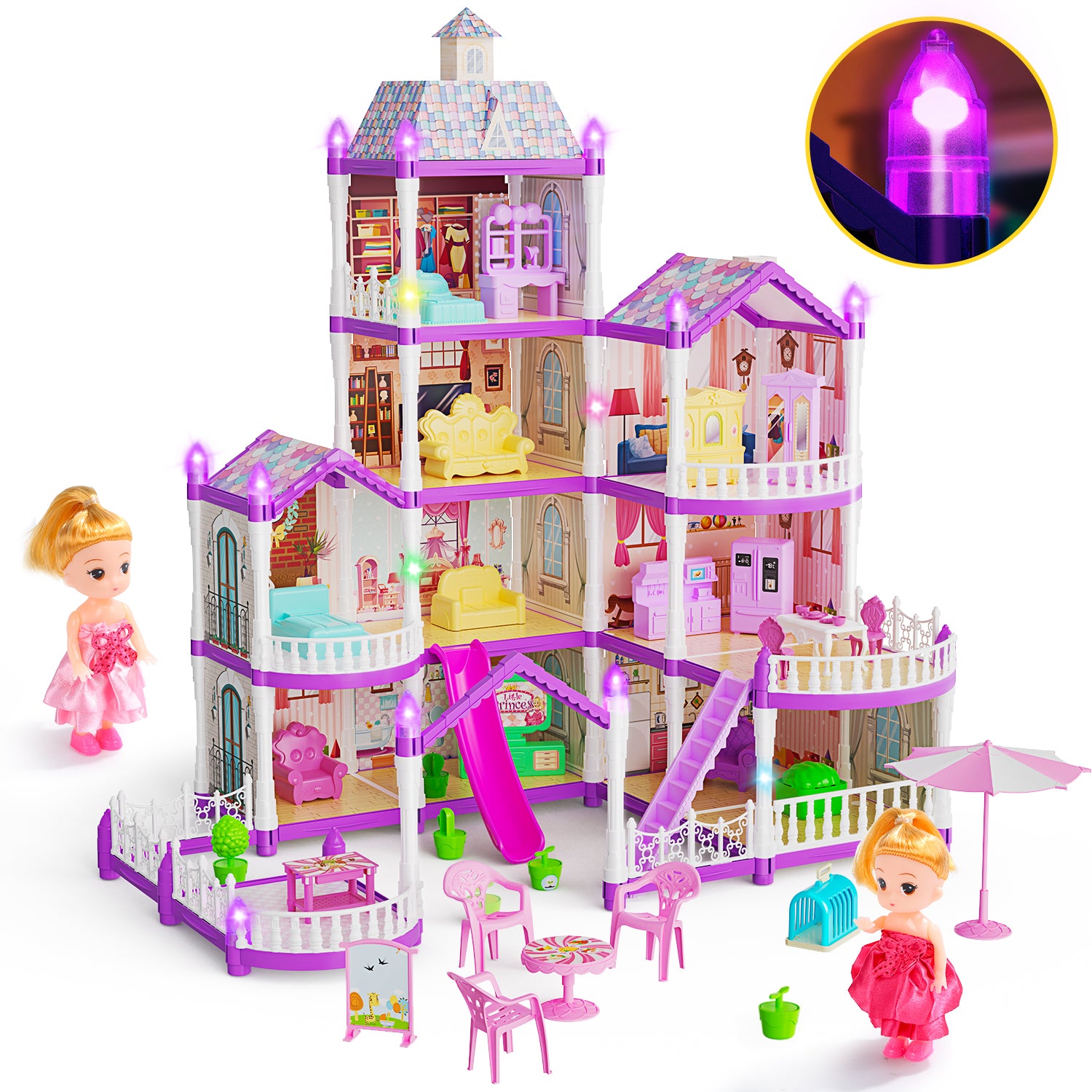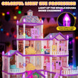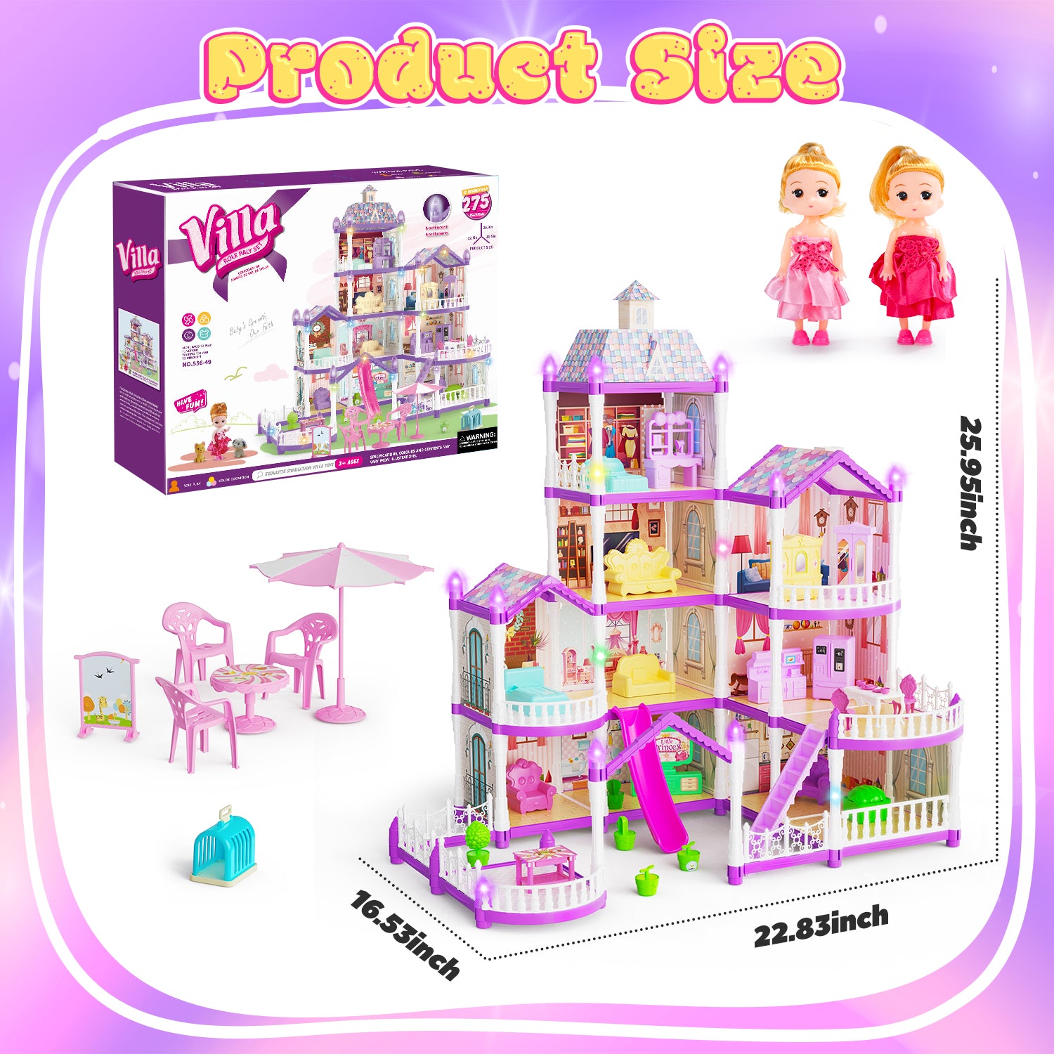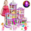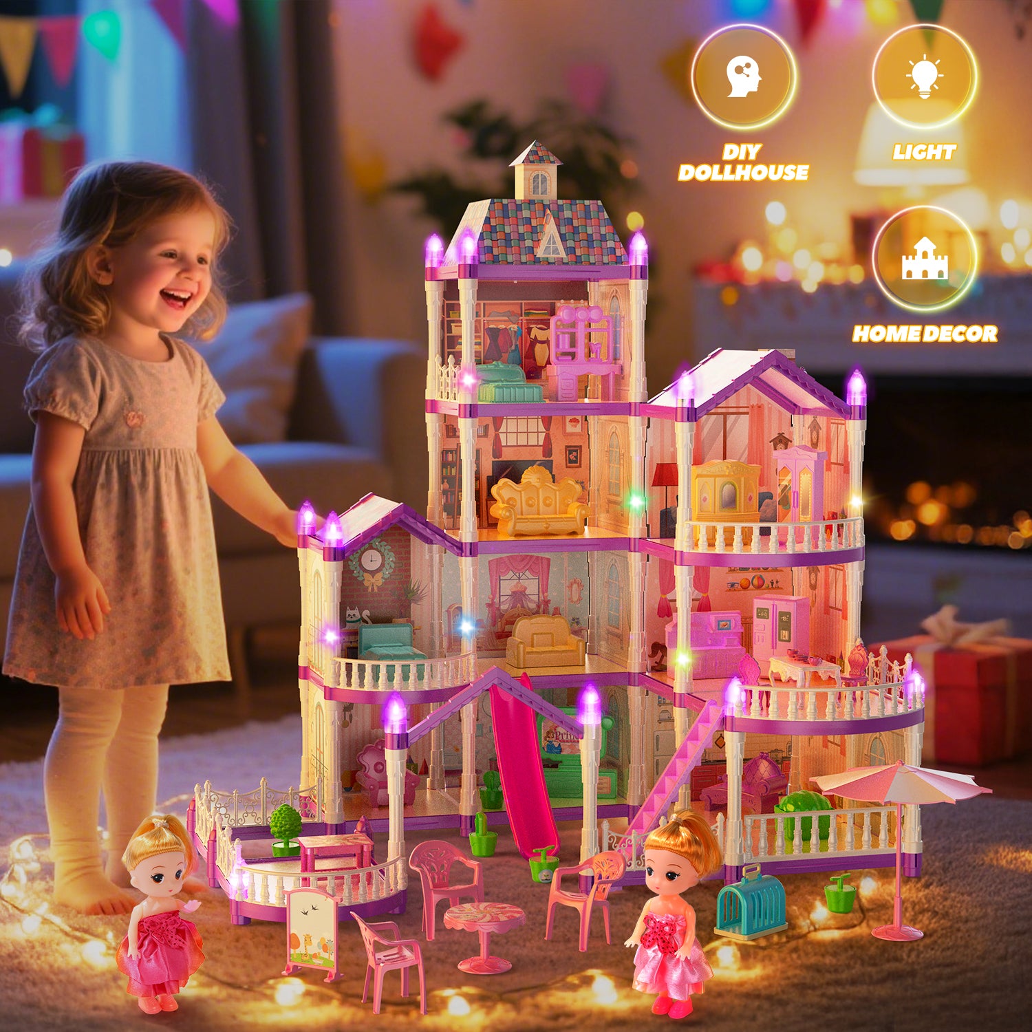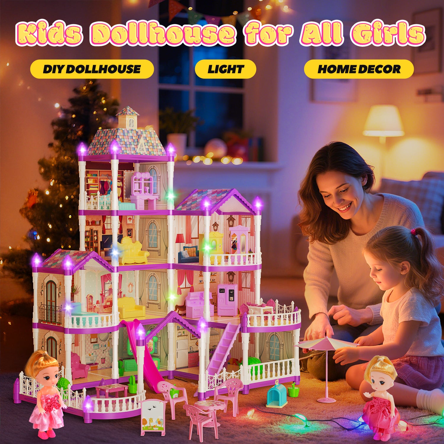 JoyStone DollHouse with Colorful Light and 10 Rooms for Girl, Huge Doll House DIY Pretend Toy, Dreamy Princess House for Kids Gifts Ages 4-8, Blue