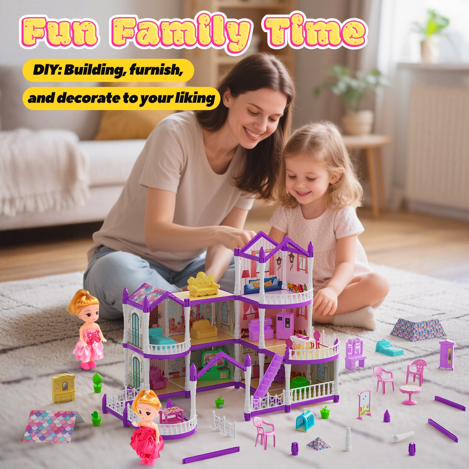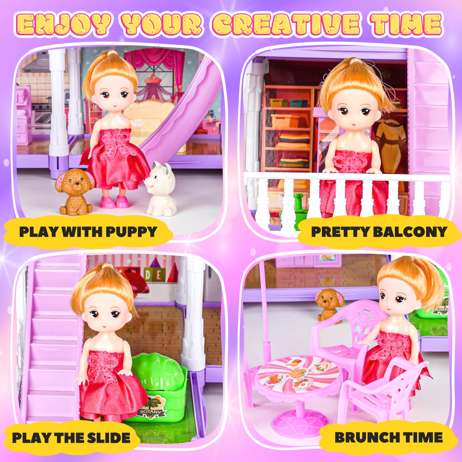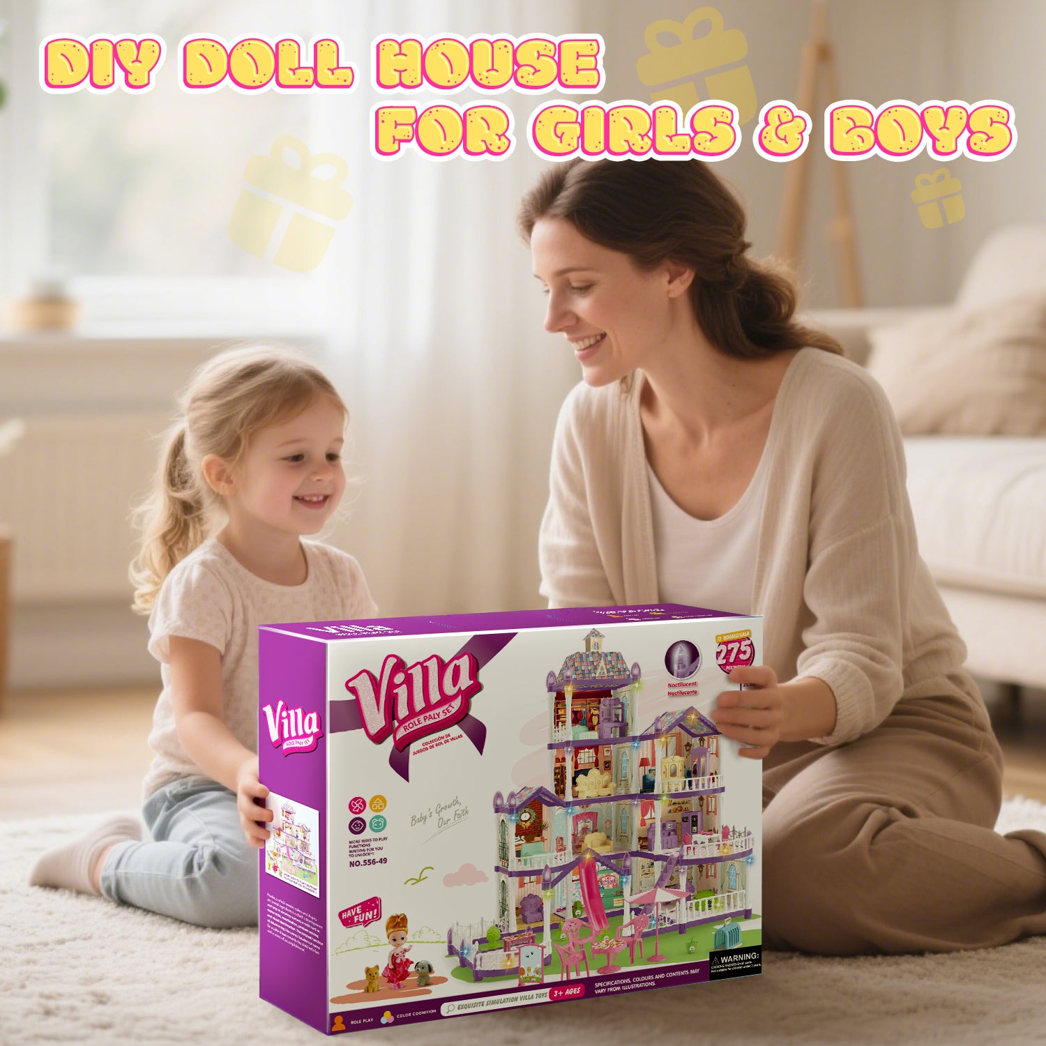 This doll house kit can be assembled into 3 floors, 10 exquisite rooms and a large front yard. And the dollhouse is equipped with 3 exquisite dolls and slide. It is also equipped with a large number of movable furniture and accessories for children to