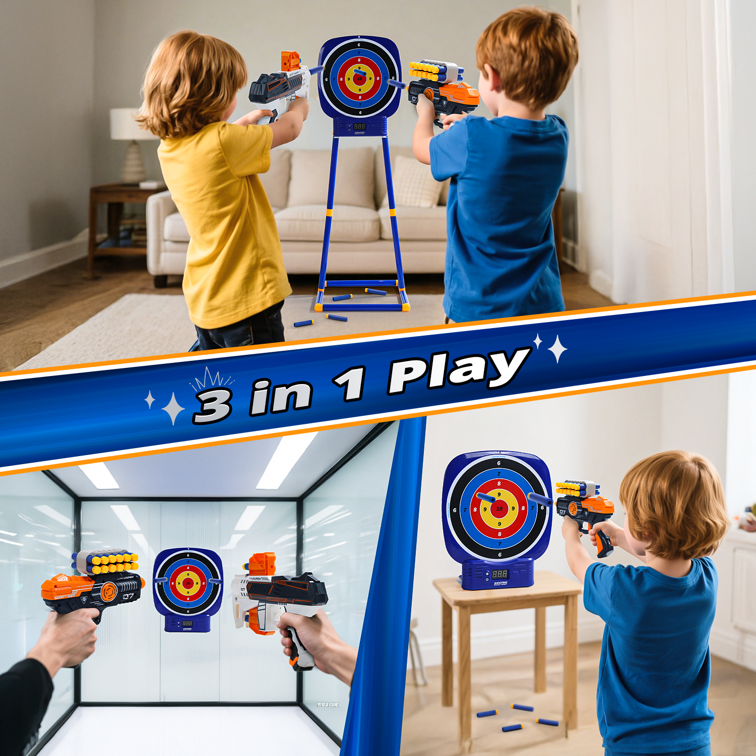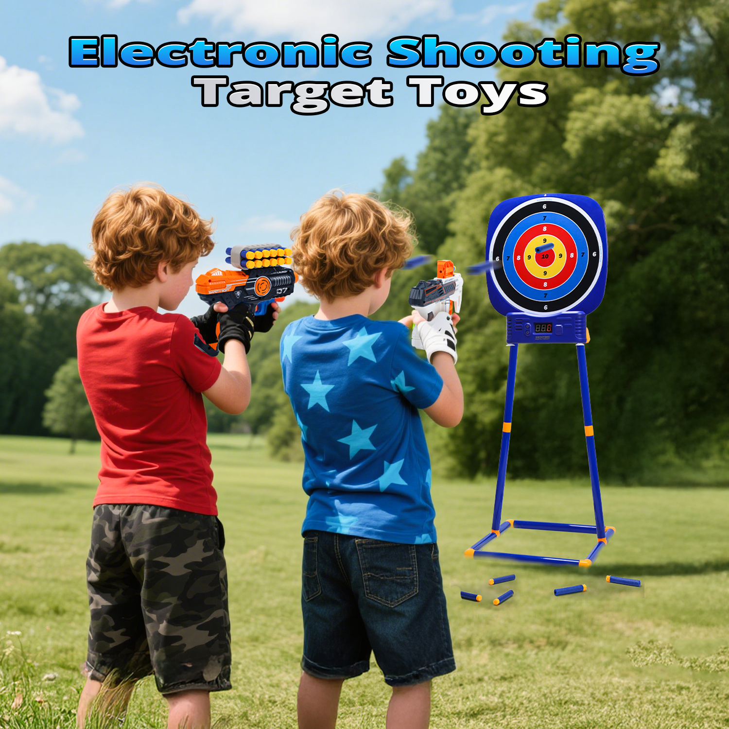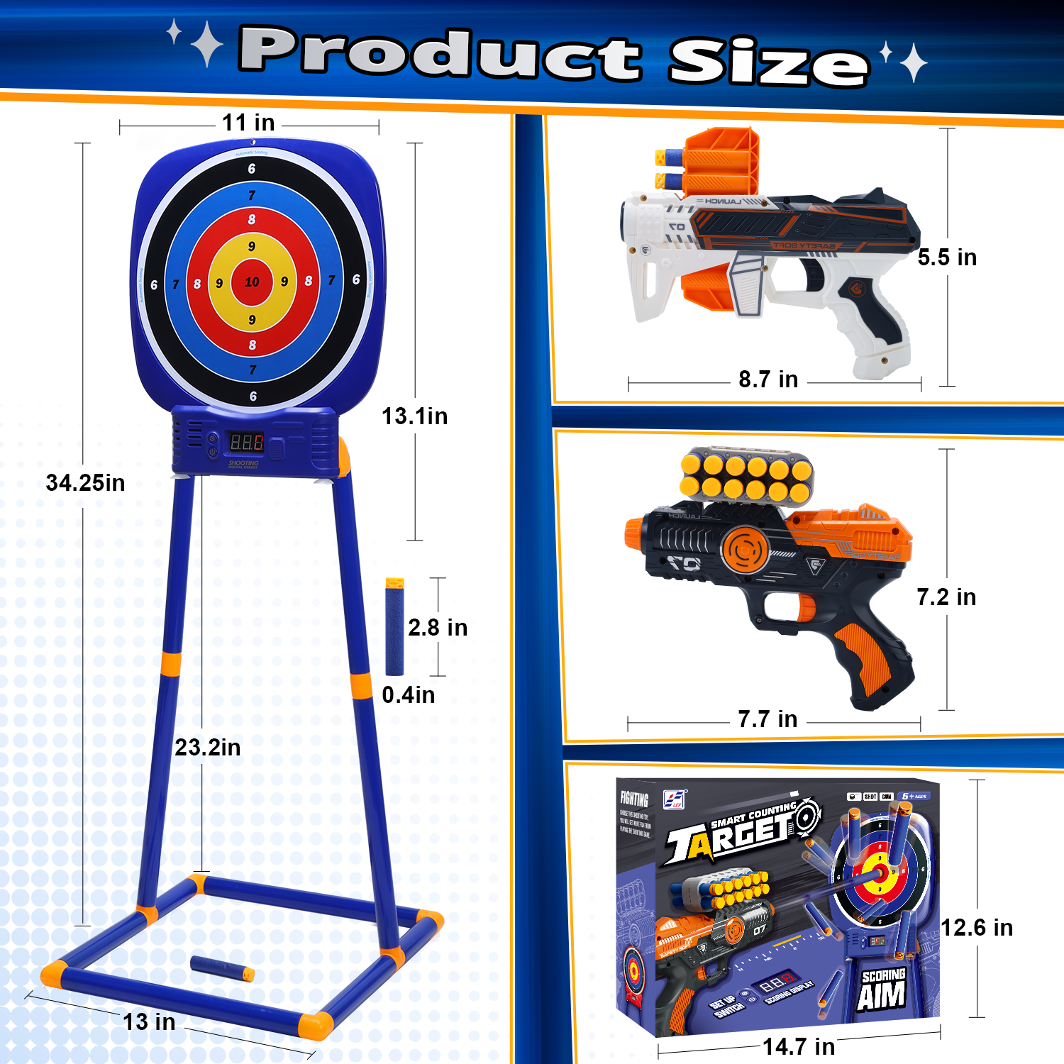 - 【Complete accessories With Toy Gun】The digital shooting target toys comes with 2 pack shooting toy gun, 20 soft bullets and 1 standing shooting target with 1 hook up. Come on, switch on the power button and start your shooting mode! It is a perfect indoor & outdoor toys for kids!