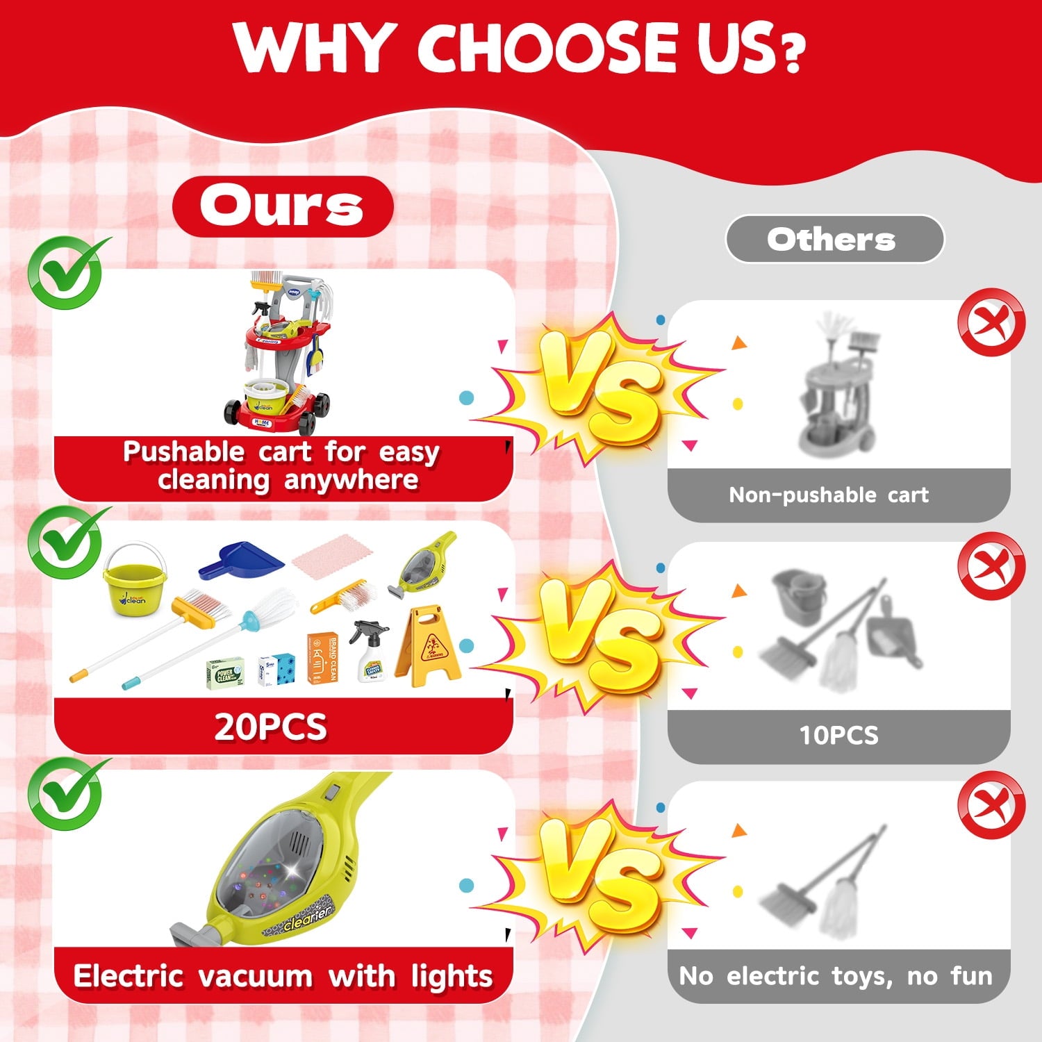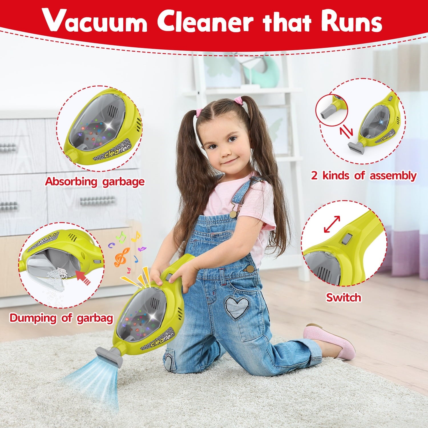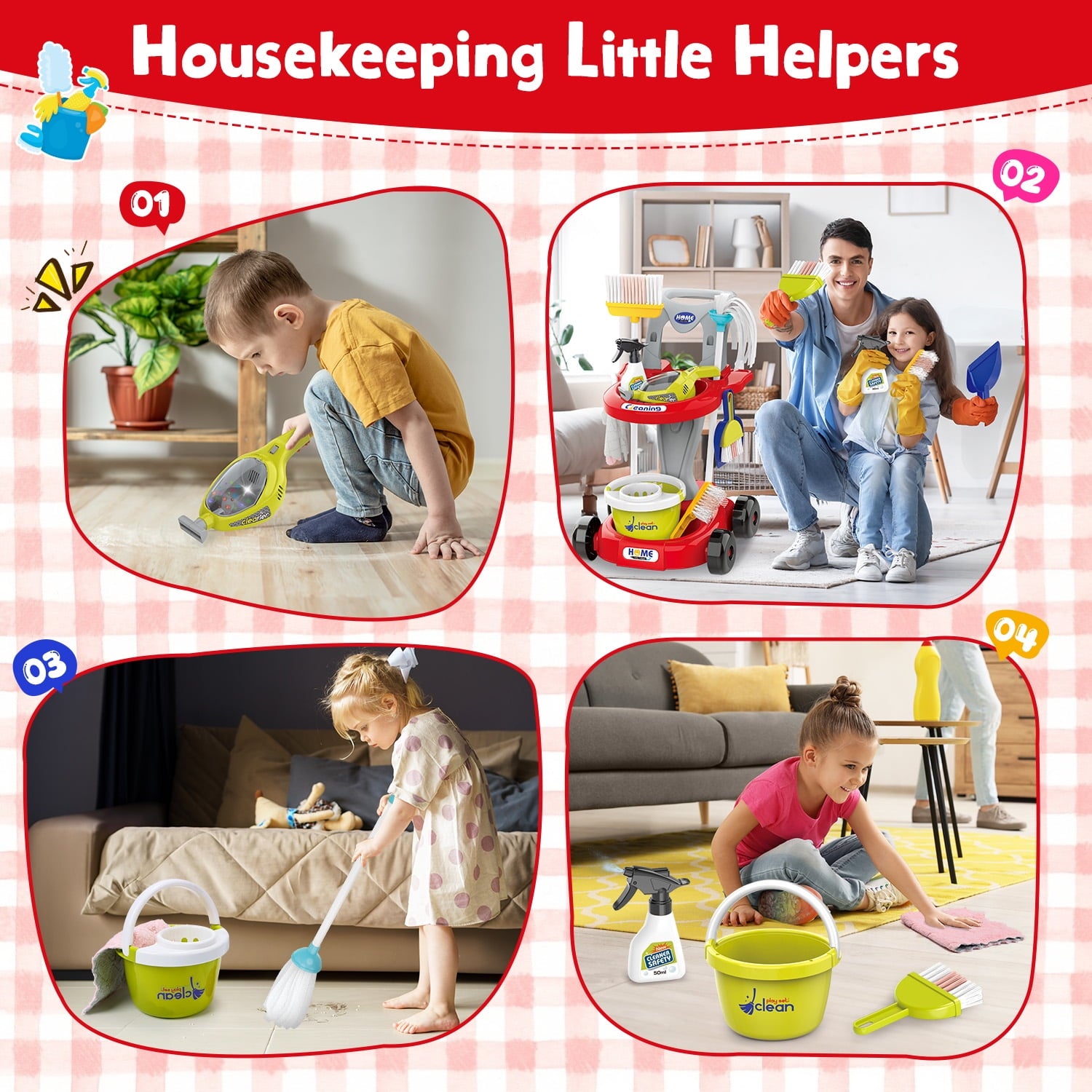 ? Exciting Features: Our cleaning toy cart stands out with an electric vacuum cleaner that features realistic lights and sounds, making cleaning more fun and engaging for kids! It encourages interactive play and adds a touch of excitement to their pretend cleaning adventures.