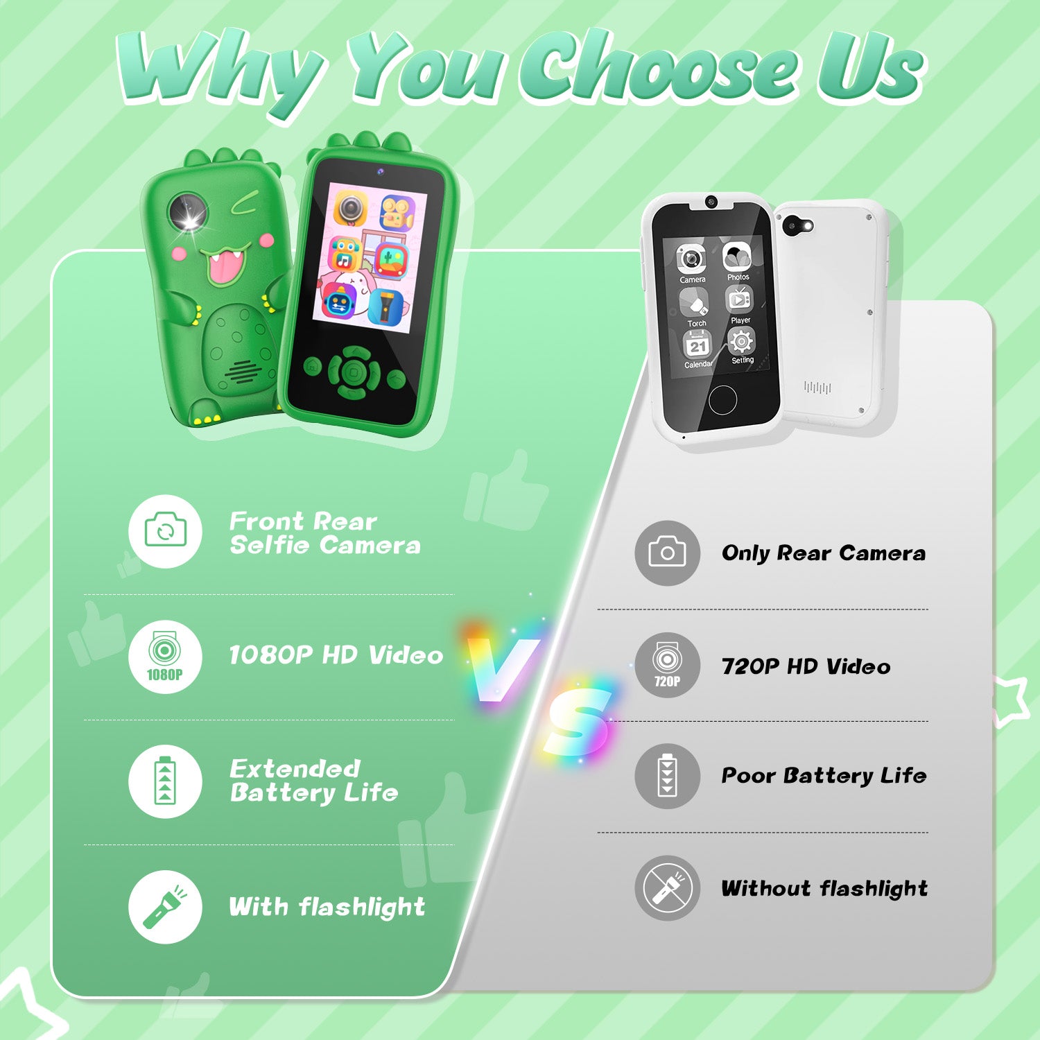 This kids phone toy are made by safety material,portable design,1080P high resolution video. Cute appearance and powerful Selfie function make children can't wait to explore the outside world. Cultivate children's interest in photography.