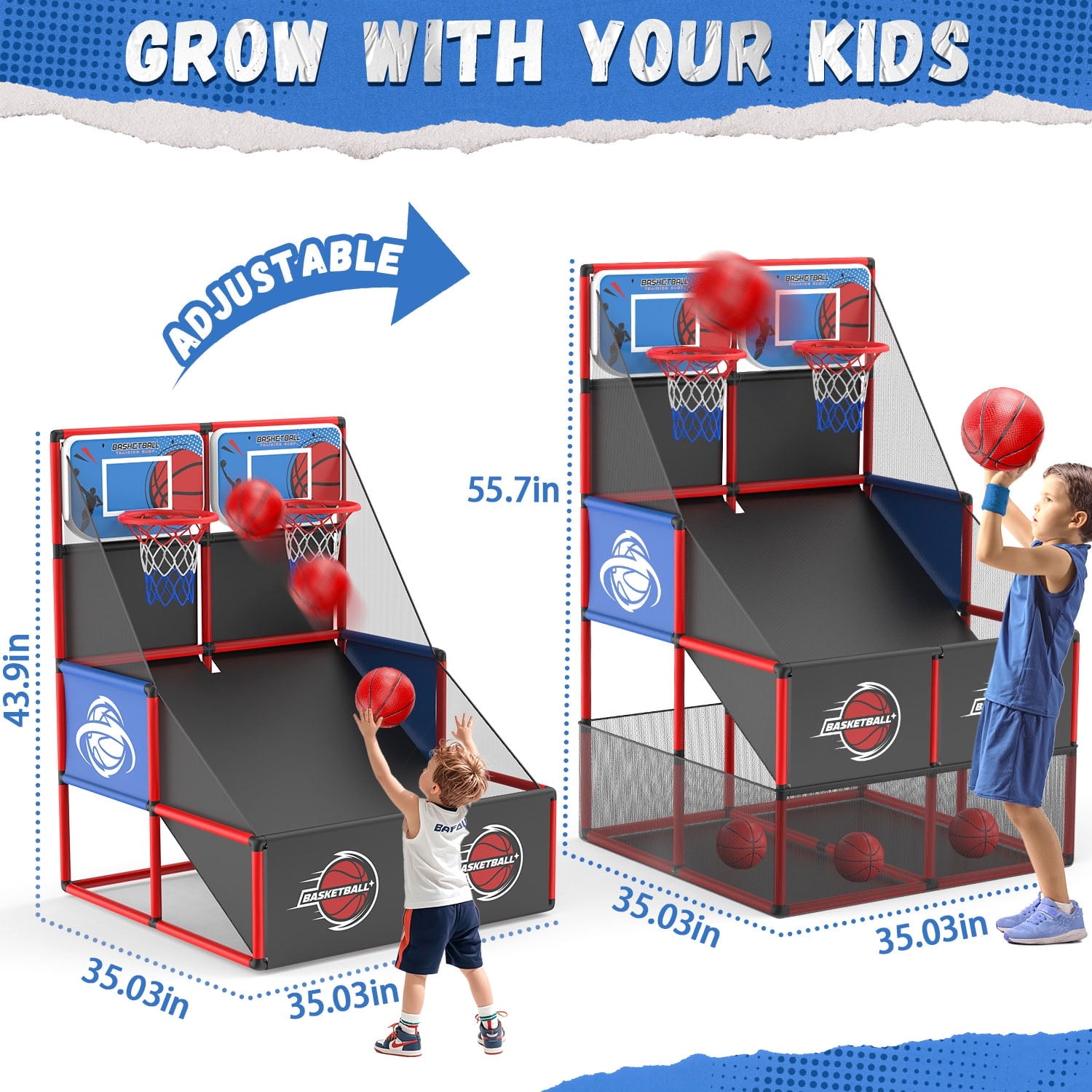 - 【Rich Accessories】This kids basketball arcade game play set includes 6 x basketballs (6.3" in diameter), 1 x ball pump, 34 x 15.7" tubes, 27 x 7.8" tubes, 36 x connectors, 2 x backboards, 2 x basketball rims & nets, 3 x decorative cloth, 1 x gauze. Gift Box Dimension: 17" x 13" x 7.6", Overall Dimension: 35" x 35.5" x 55.7".