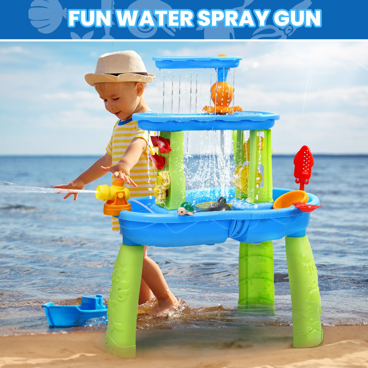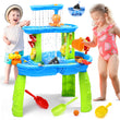 - 【Toddler Water Table with Rich Accessories】This Water Toys set includes squirt jugs, buckets, sandglass spoons, molds, and a variety of beach shovels, windmill, swinging arm, bouncing ball, press water cannon, rubber squirting fish, turtles & dolphins, etc. Not only can it be used to play with the sand but also with the water, which will bring double fun to children.