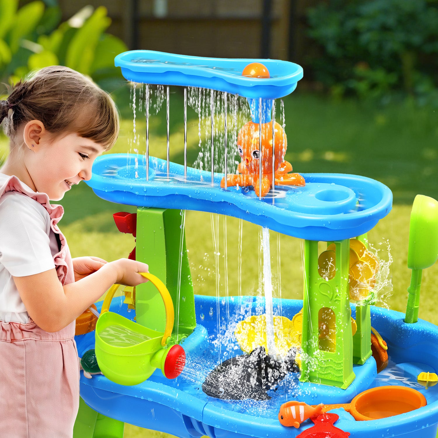 - 【Shark Electric Water Pump】The water table is equipped with a shark-shaped water pump and hose to make the water spurt from bottom to top. when the waterfall flows back to the underground pool, which drives the water wheel to rotate, children can enjoy continuous water flow and a rich water landscape and fountain cycle. Increase children's interactive fun. ( 3×1.5V AA batteries not included)